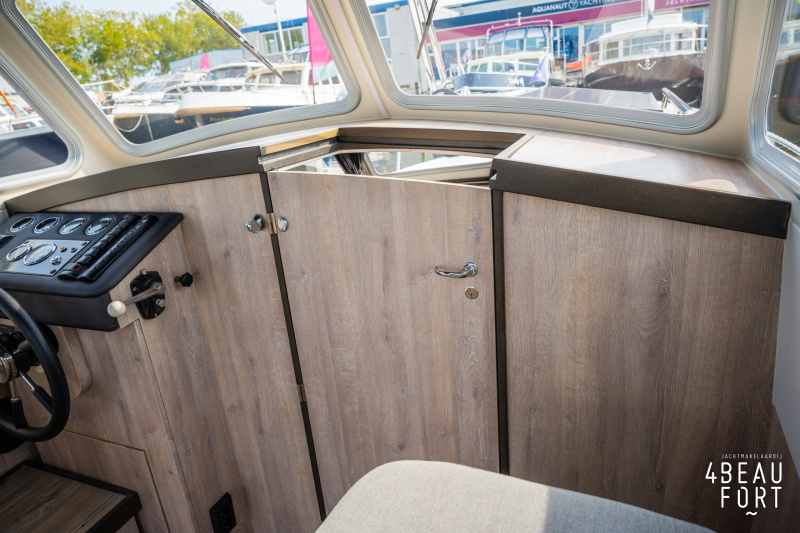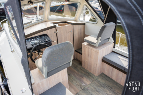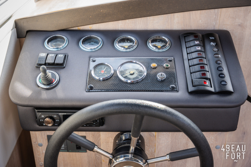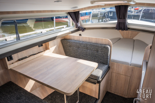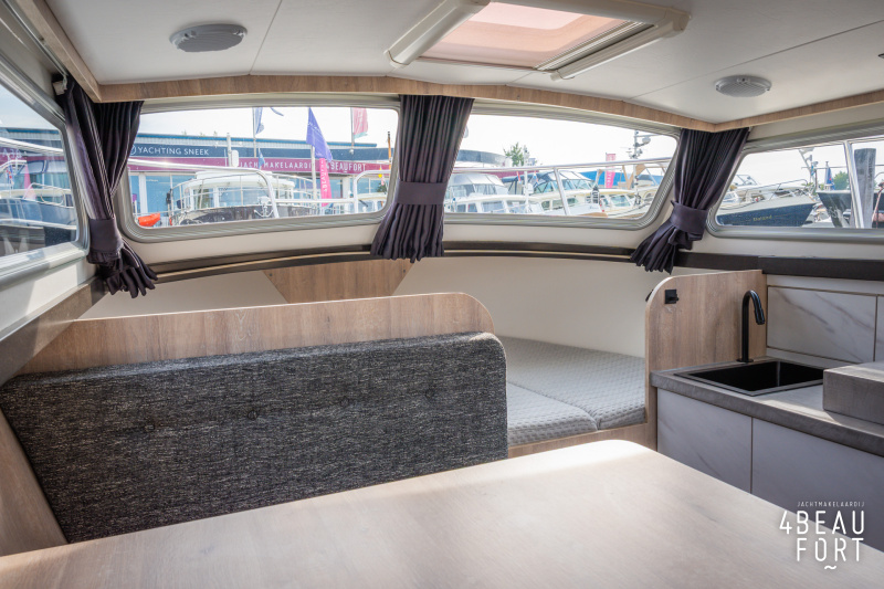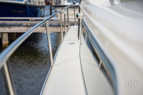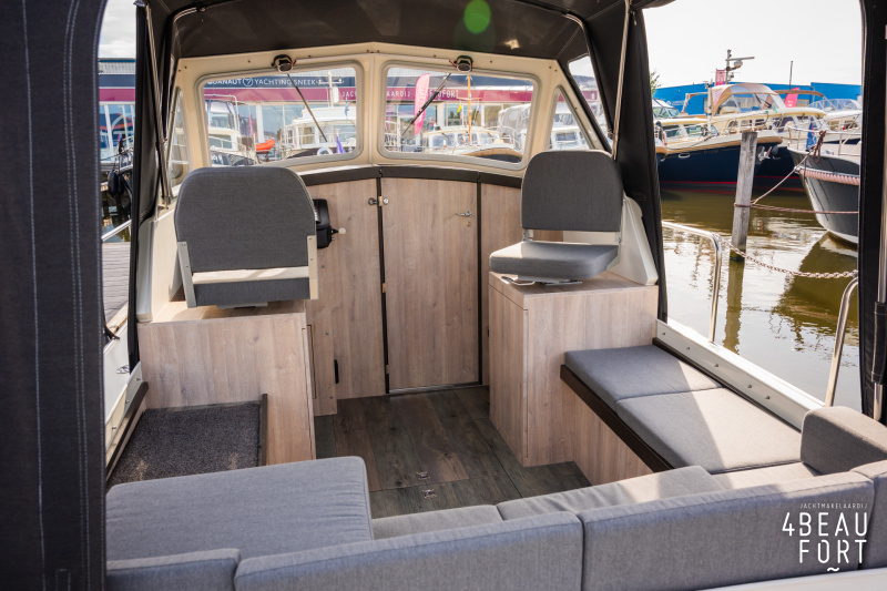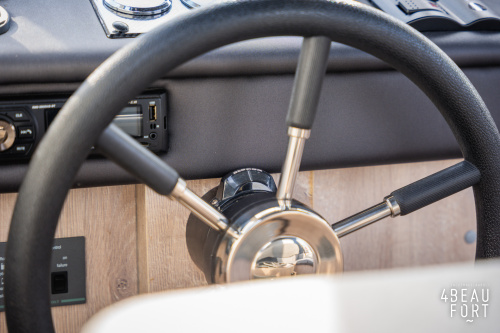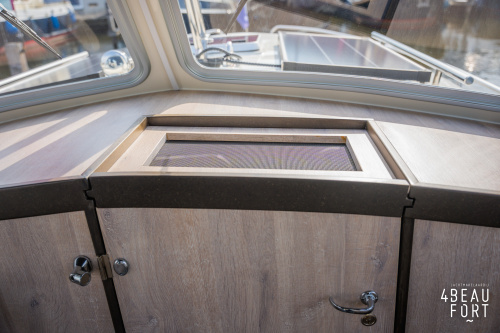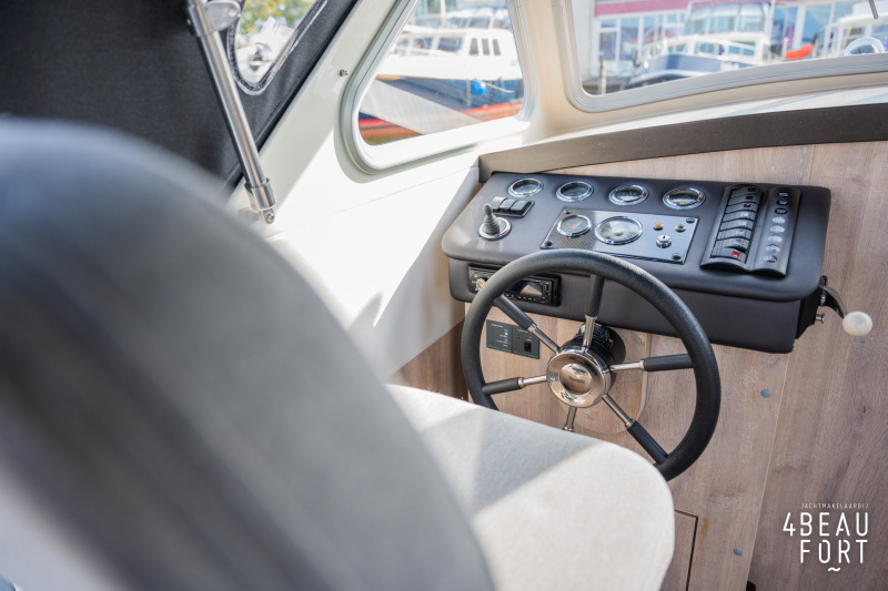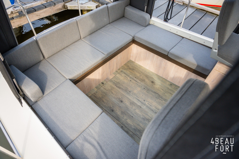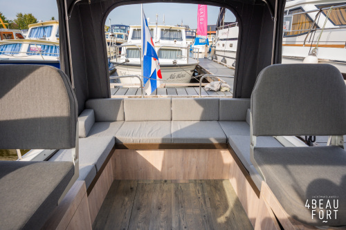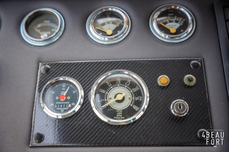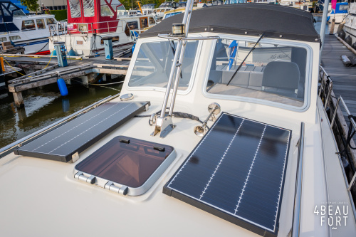 Was wurde erneuert? Inklusive der Verkabelung, Verkleidung in HPL (verfärbt sich nicht und ist kratzfrei), Polsterung, Konservierungssystem in 2 Komponenten, Fenster und Zelt über dem offenen Cockpit. Die derzeitigen Eigner haben das Schiff außerdem mit einem Bugstrahlruder, einem Ladegerät/Wechselrichter, einer LED-Beleuchtung auf der Fernbedienung und Sonnenkollektoren ausgestattet. Außerdem wurde der Gummipuffer durch eine Edelstahlausführung ersetzt und die Laufstege verbreitert. Das Schiff zeichnet sich zudem durch seine handliche Größe von knapp 8 m (inkl. Badeplattform), einen geringen Tiefgang von 65 cm und eine Durchfahrtshöhe von unter 2,40 m aus.