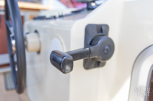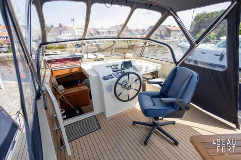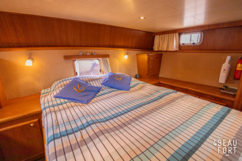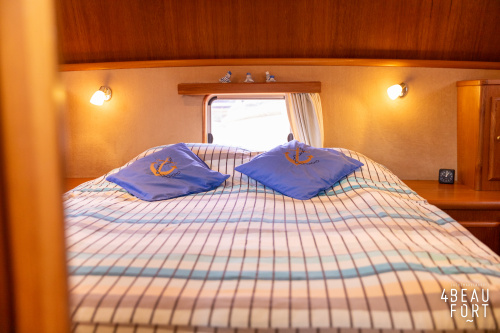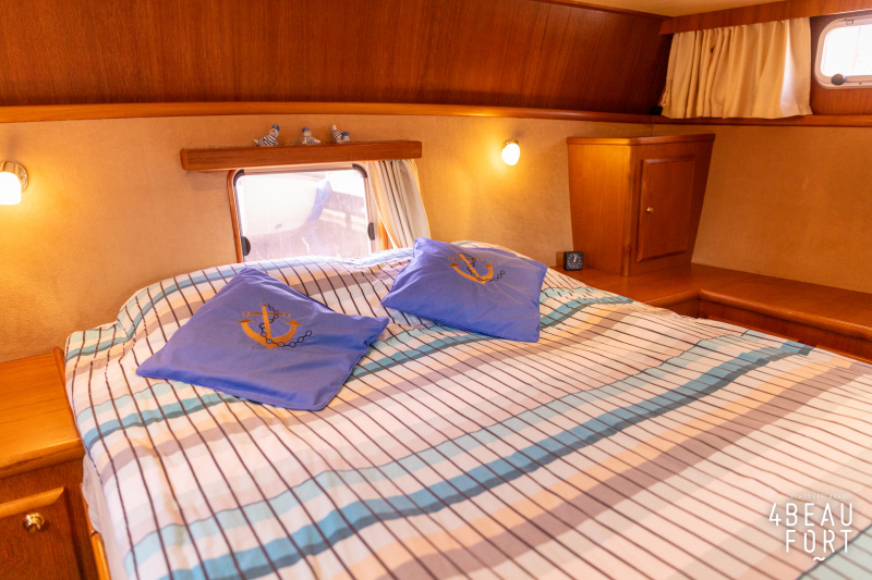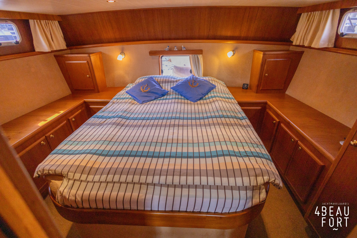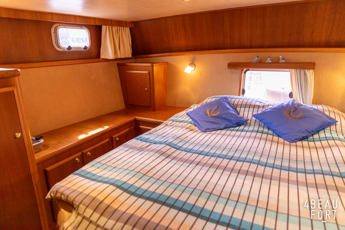 Dieser Multi-knick gebaute Aquanaut Drifter wurde im Jahr 2007 auf Wunsch des Erstbesitzers gebaut. Die (niedrige) Durchfahrtshöhe des Drifters beträgt 2,45 m. Der Innenraum wurde modifiziert, so dass eine Stehhöhe von 2,00 m im Vorschiff und Salon und 1,95 m im Heck besteht. Das freistehende Bett in der Eignerkabine hat eine Länge von 2,05 m.