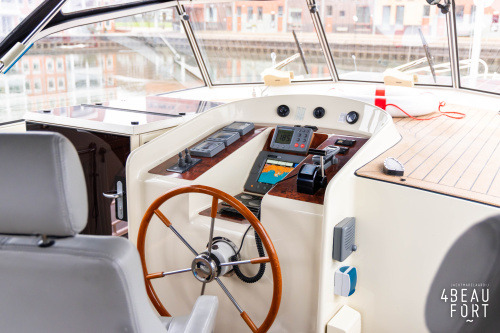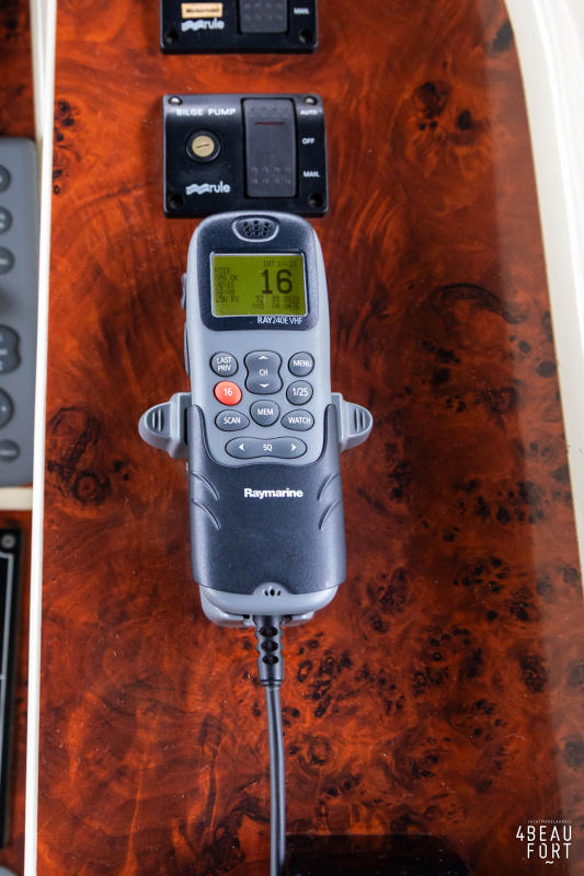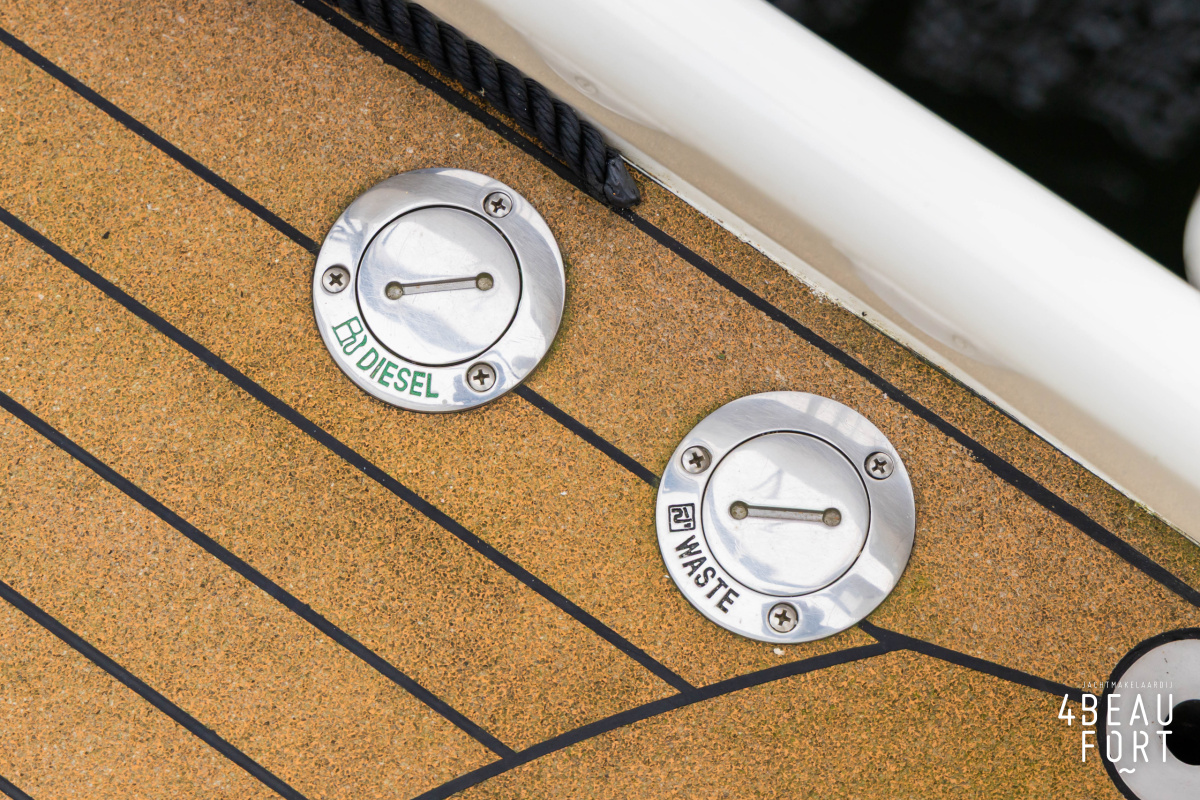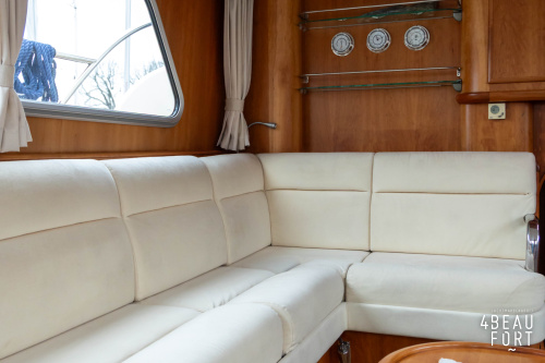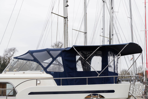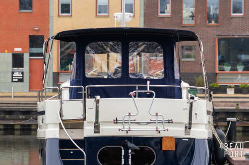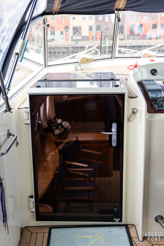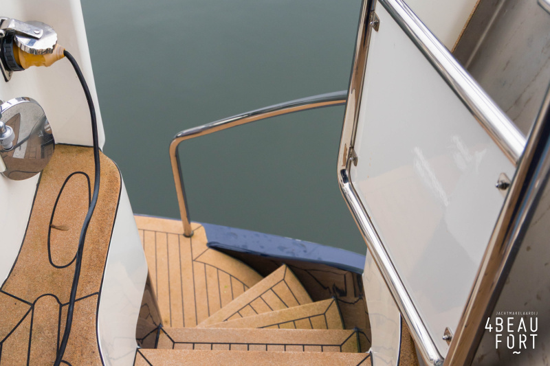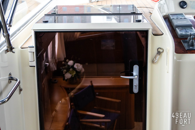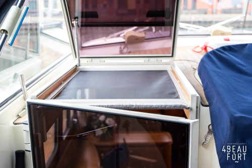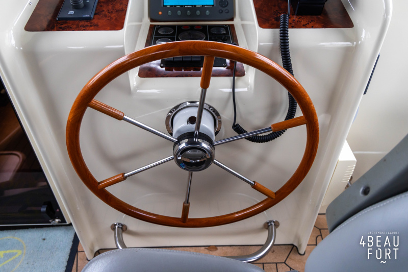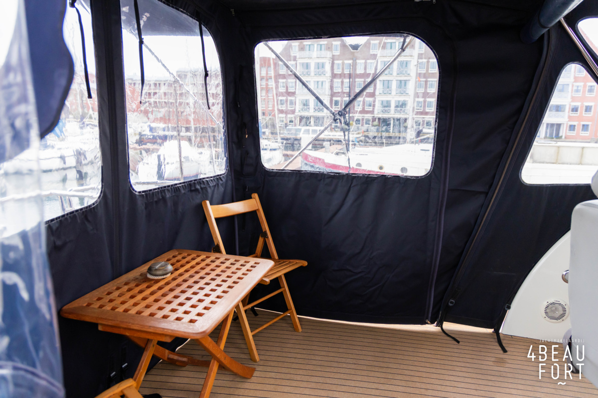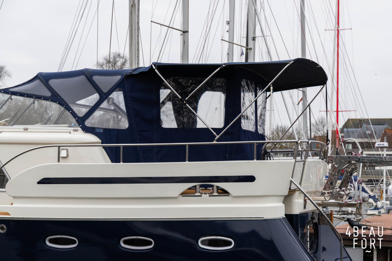 Kurz gesagt, eine wunderschöne Yacht mit eleganten Kurven, ausgestattet mit einem Marinedeck und einer Sprühhaube mit Bimini, die teilweise komplett geschlossen werden kann, sodass man auch bei weniger schönem Wetter bequem auf dem Achterdeck sitzen kann. Das Wartungsniveau ist ausgezeichnet: Der Aufbau wurde 2024 gestrichen, der Rumpf und der Unterwasserrumpf 2025.