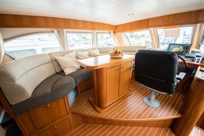 Das Layout der Caprice ist völlig anders. Auf dem überdachten Achterdeck finden Sie einen Klapptisch mit Stauschrank, an dem Sie schöne Momente mit Ihrer Gesellschaft genießen können. Hier kann das Achterdeck nicht mit einem Zelt verschlossen werden. Genau wie bei der Boomerang sind die Gangways teilweise überdacht. Die Caprice hat an vielen Stellen eine stilvoll verdeckte Außenbeleuchtung. Außerdem finden Sie eine elektrische Gangway und einen zweiten Anker auf dem Achterdeck, so dass Ihre Yacht auch in stürmischen Gewässern stabil bleibt.