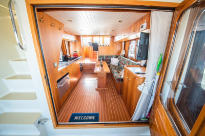 Dies wird sofort beim Betreten des Bootes deutlich, wo das große Platzangebot im Salon ins Auge fällt. Ein praktischer Klapptisch macht ihn zum idealen Ort für ein Getränk oder ein Essen in Gesellschaft. Zwei Falttüren zum Achterdeck ermöglichen es Ihnen, den Salon noch weiter zu vergrößern. Der Außenbereich ist vollständig überdacht (durch das verlängerte Schiebedach) und kann mit einem Zelt verschlossen werden, so dass Sie ihn auch bei weniger schönem Wetter genießen können.