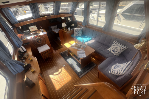 This sturdy cruiser is built with a knick hull, wide gangways, and a high gangways (surrounding the boat) topped with a stainless steel railing. This allows you to walk safely and comfortably all around the boat, even around the raised aft deck. The design exudes solidity and offers plenty of practical space on board.