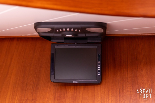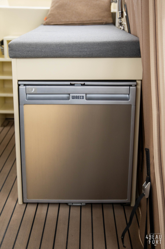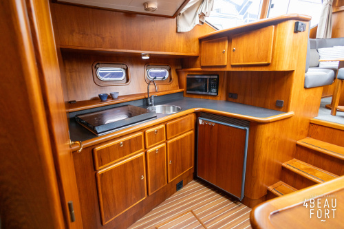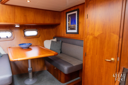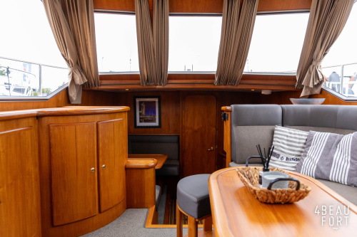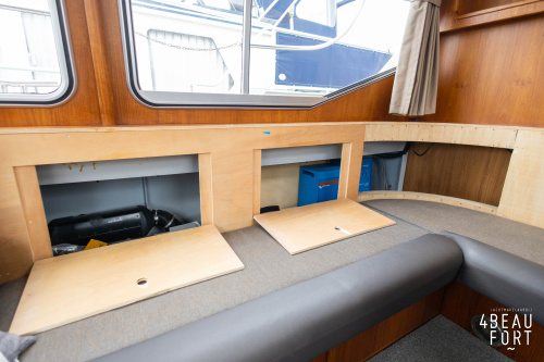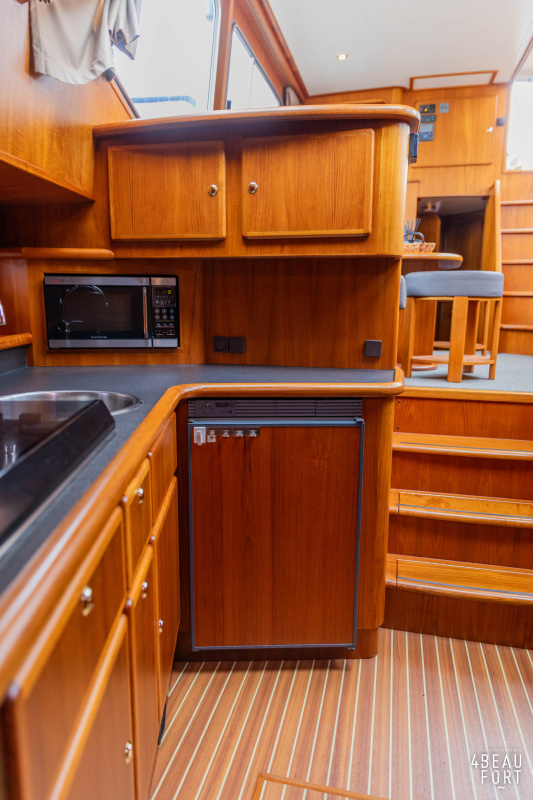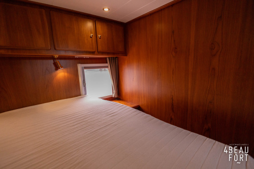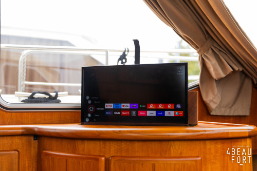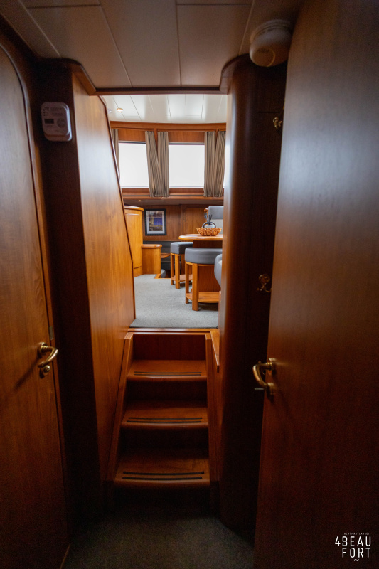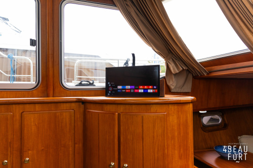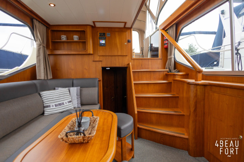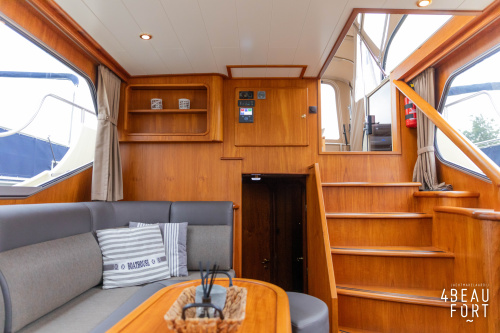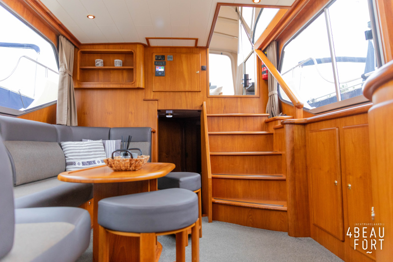 Through the spacious entrance and the comfortable, lazy staircase you reach the cabin, where a sleek but warm mahogany nautical interior welcomes you. On the starboard side there is a comfortable sofa and on the port side there is plenty of storage space and a television that emerges electrically from a cupboard. In the bow you will find a cozy dinette and a spacious galley; Further forward in the bow is a cabin with sleeping places for three people.