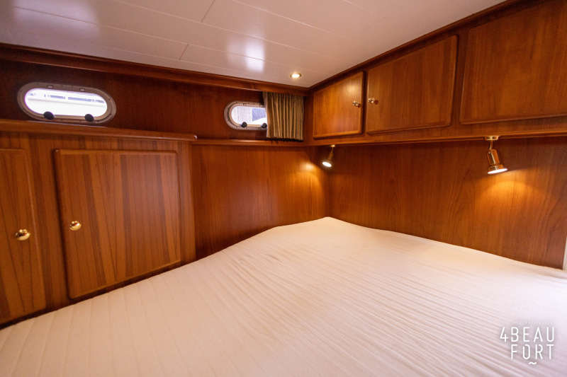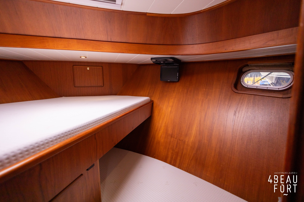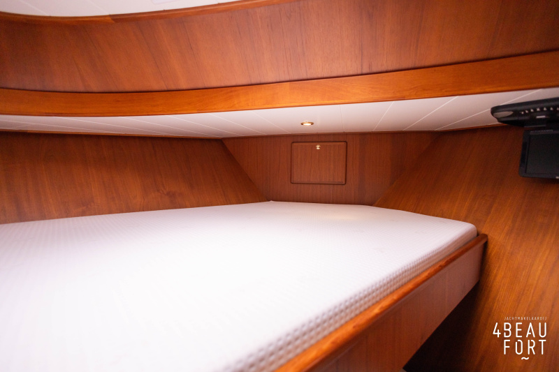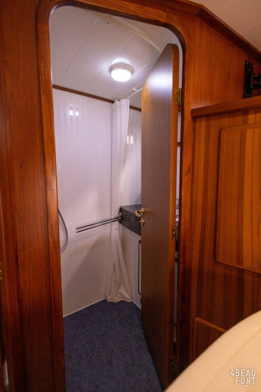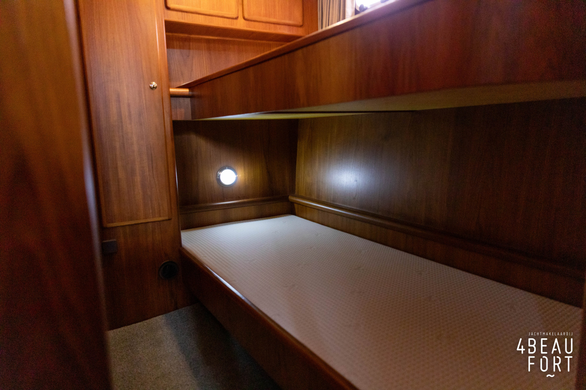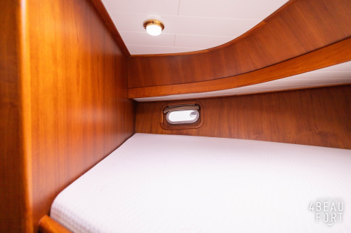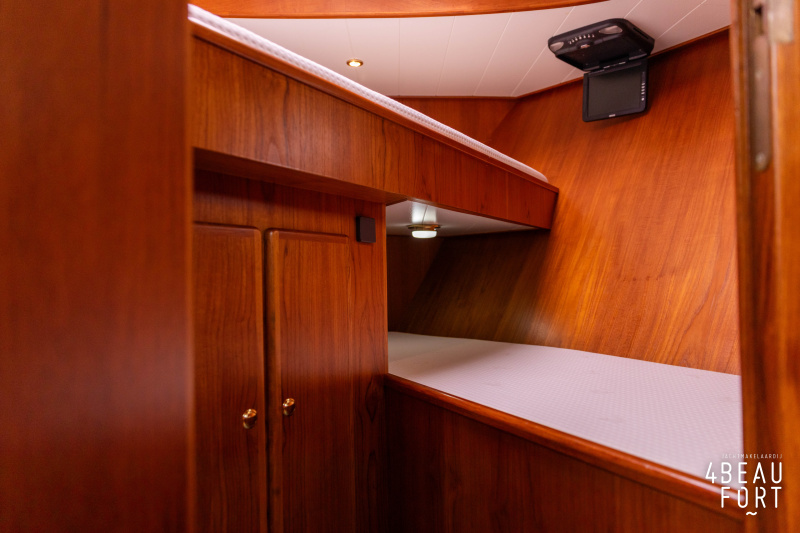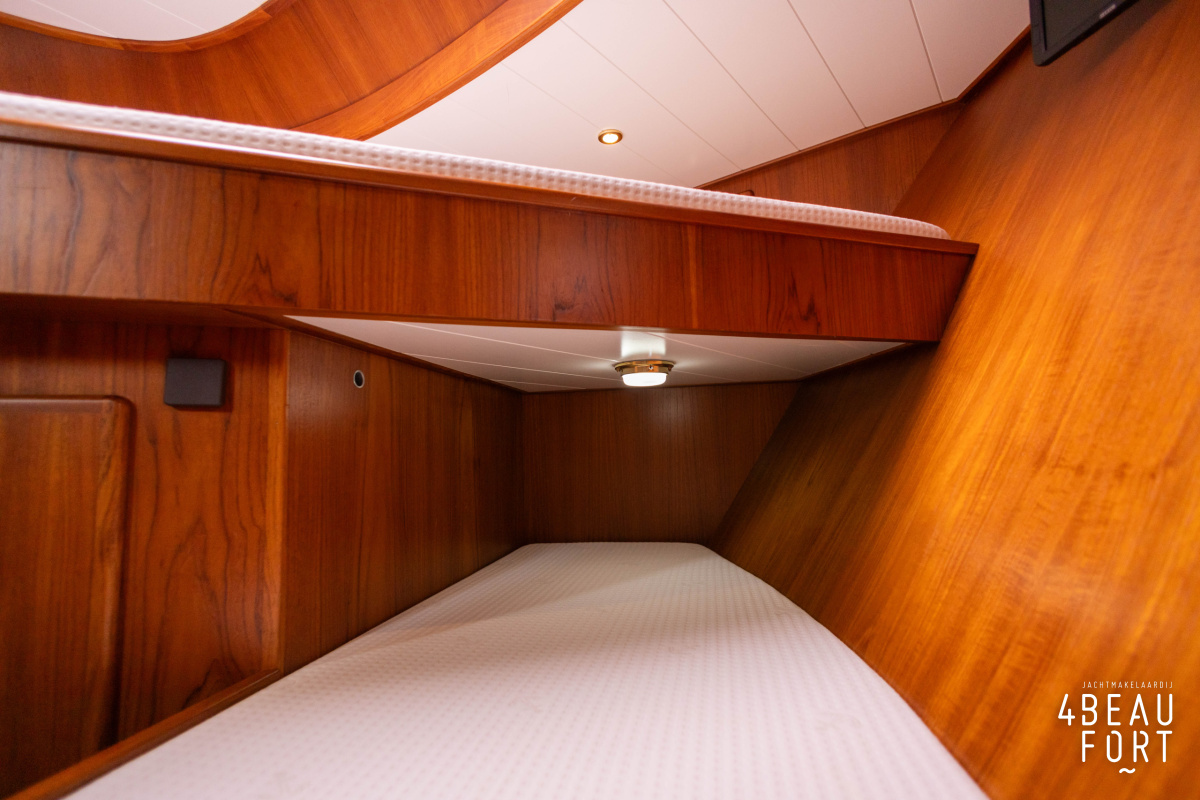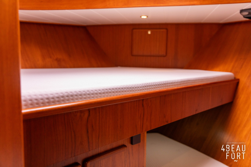 In the stern, the available space has been used very efficiently: a separate toilet room with electric toilet and sink and a separate bathroom with shower and sink has been realized, plus two separate cabins. The owner's cabin has a generous double bed, plenty of closet space and a hatch for extra light and ventilation. The other cabin is equipped with a bunk bed.