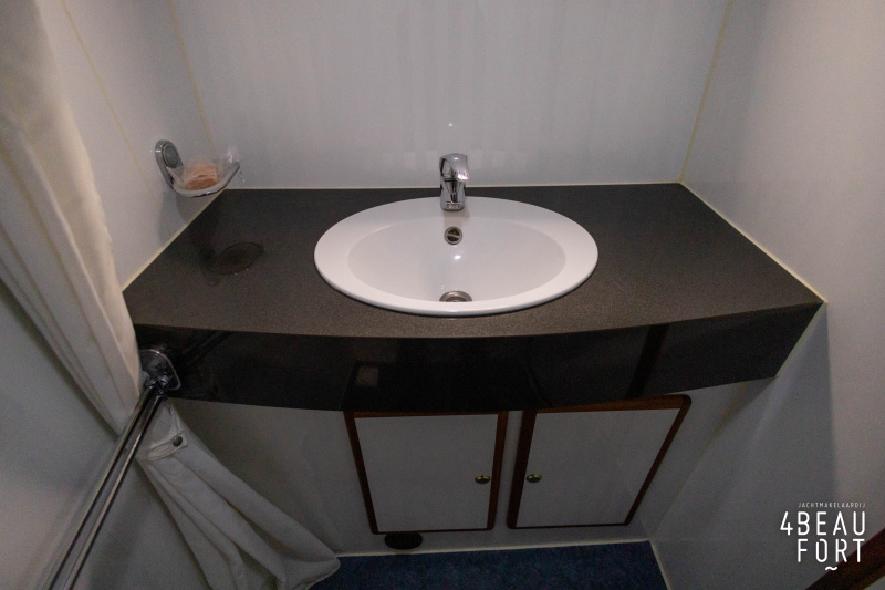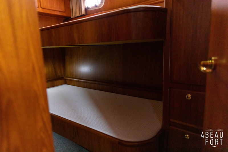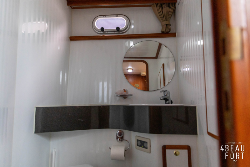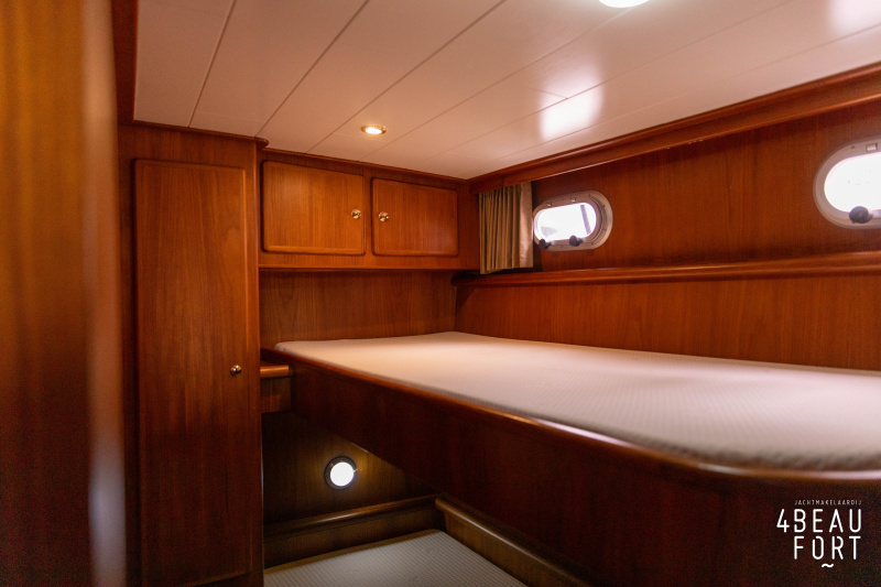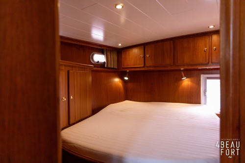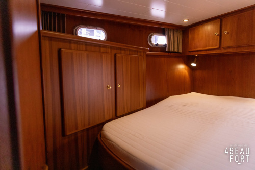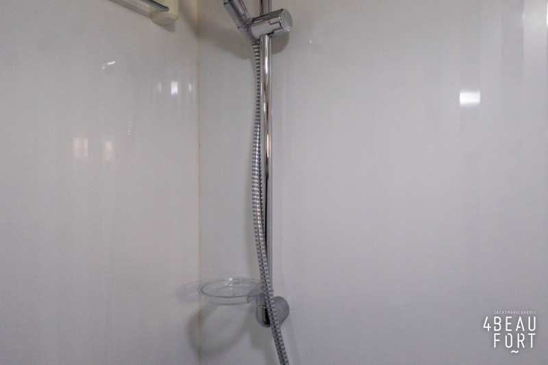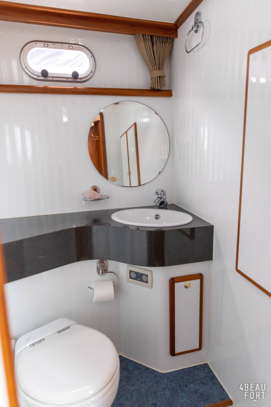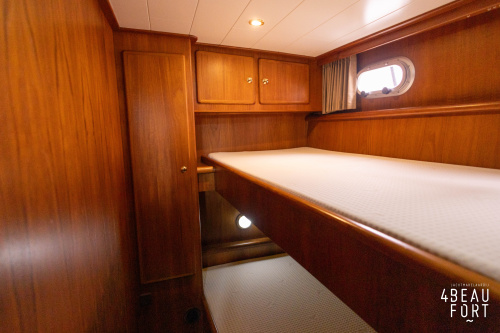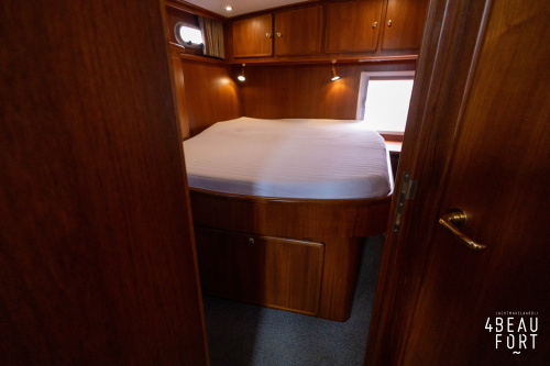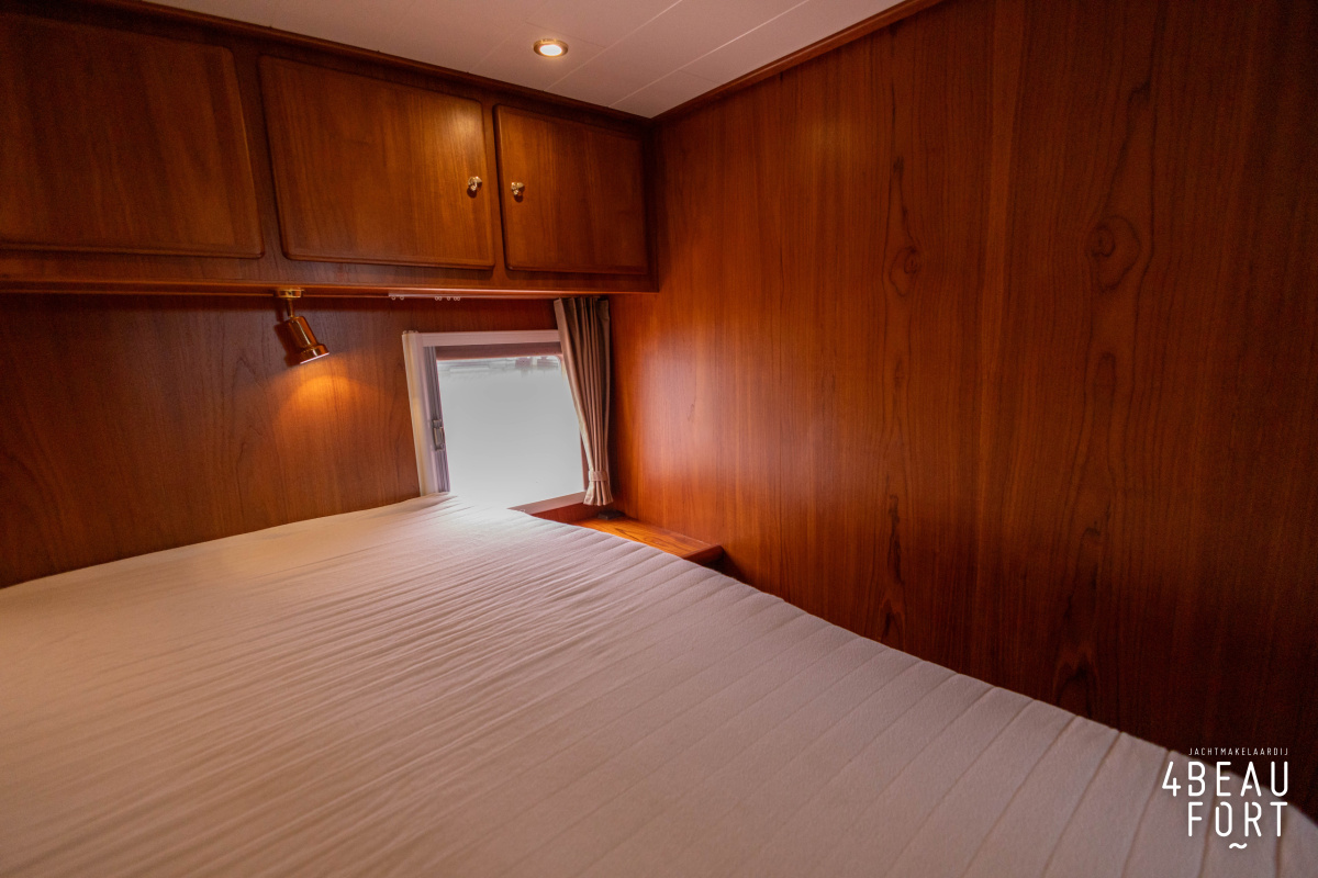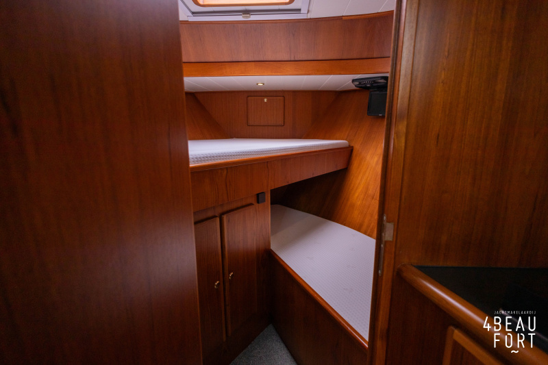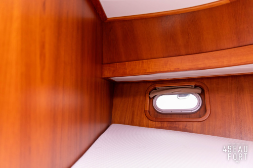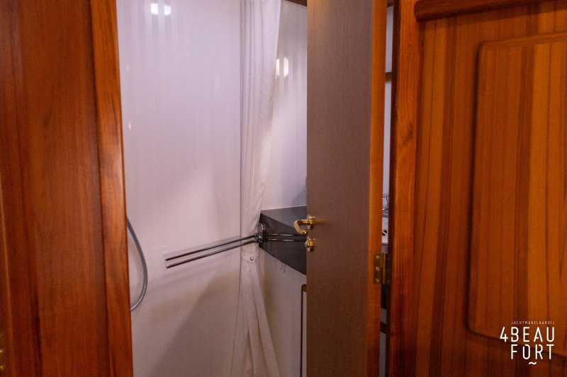 In the stern, the available space has been used very efficiently: a separate toilet room with electric toilet and sink and a separate bathroom with shower and sink has been realized, plus two separate cabins. The owner's cabin has a generous double bed, plenty of closet space and a hatch for extra light and ventilation. The other cabin is equipped with a bunk bed.