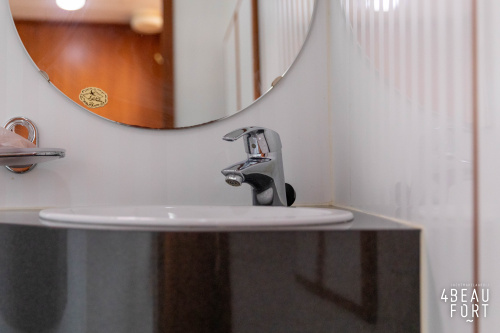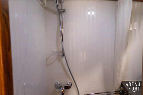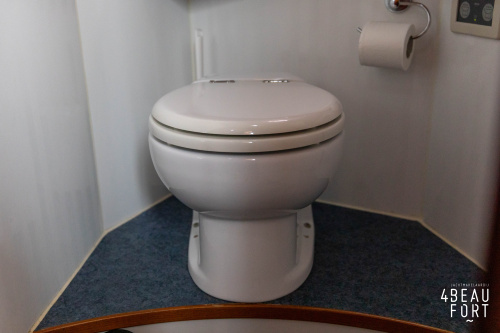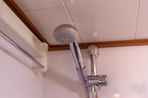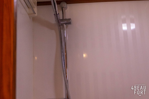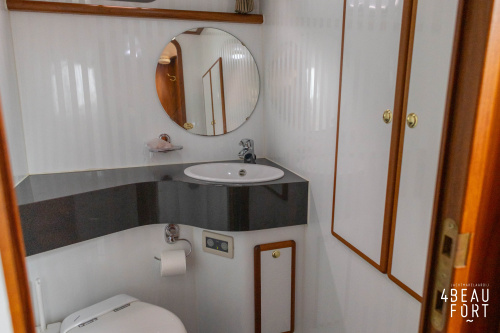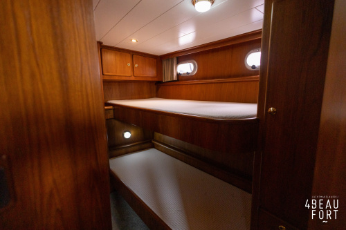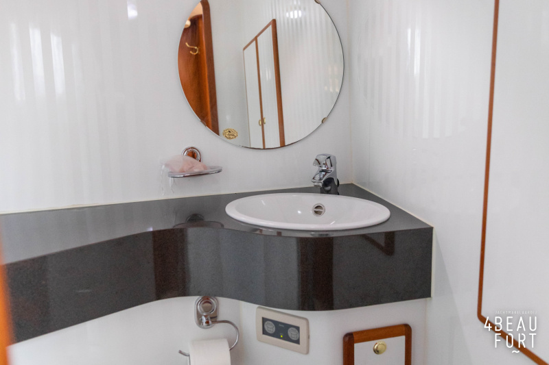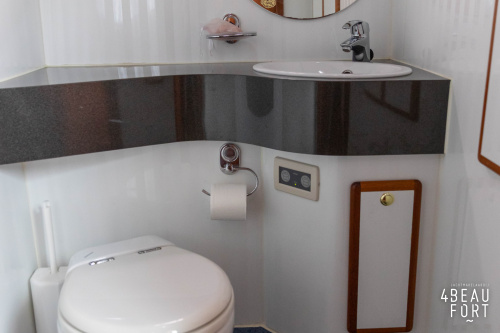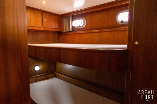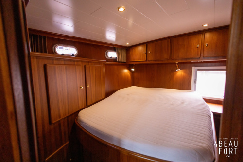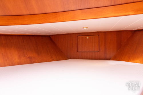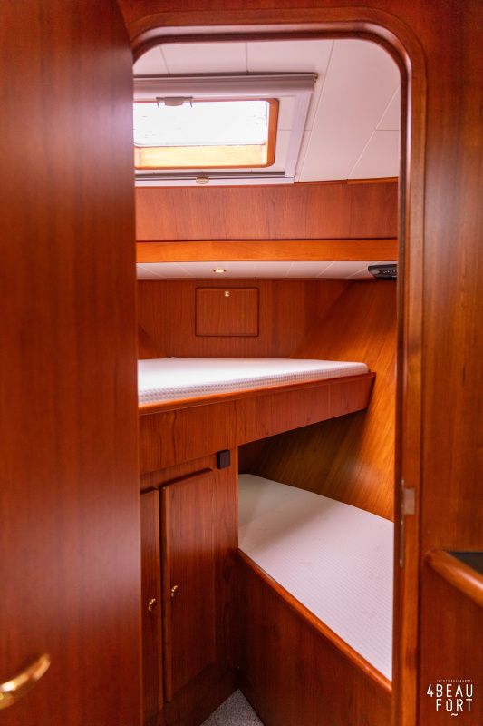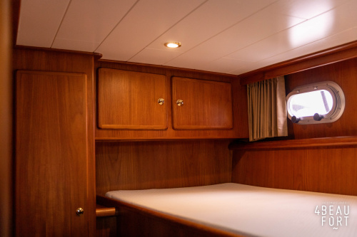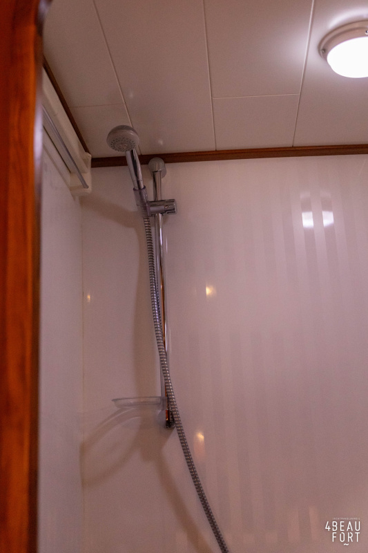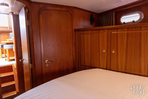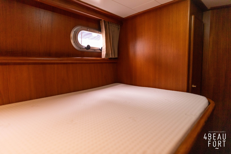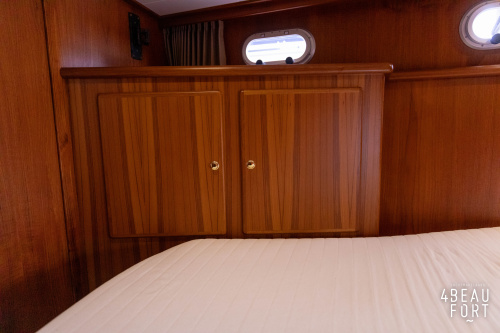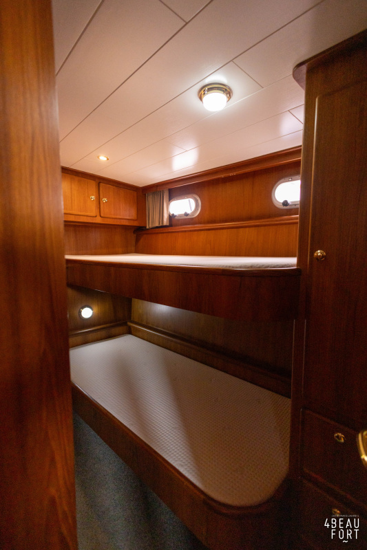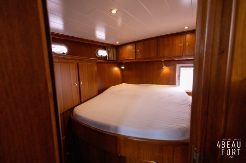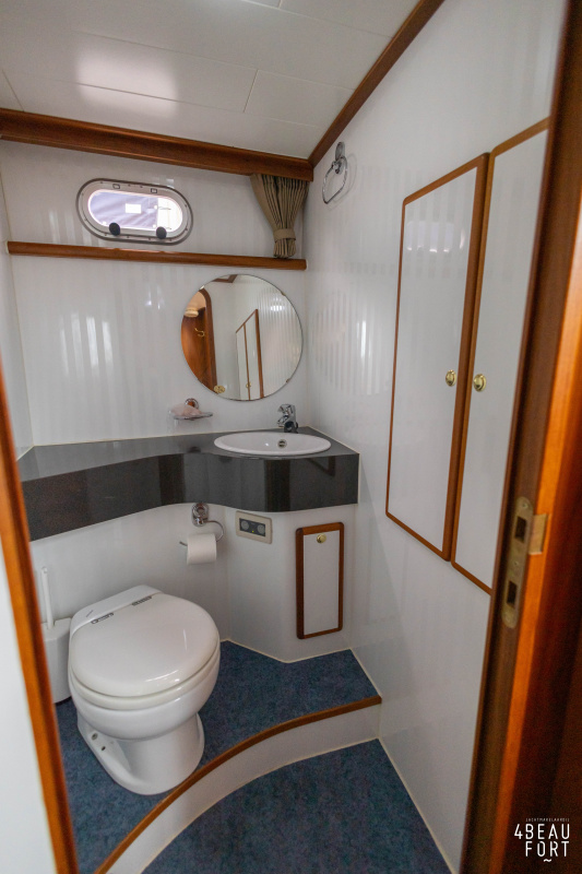In the stern, the available space has been used very efficiently: a separate toilet room with electric toilet and sink and a separate bathroom with shower and sink has been realized, plus two separate cabins. The owner's cabin has a generous double bed, plenty of closet space and a hatch for extra light and ventilation. The other cabin is equipped with a bunk bed.