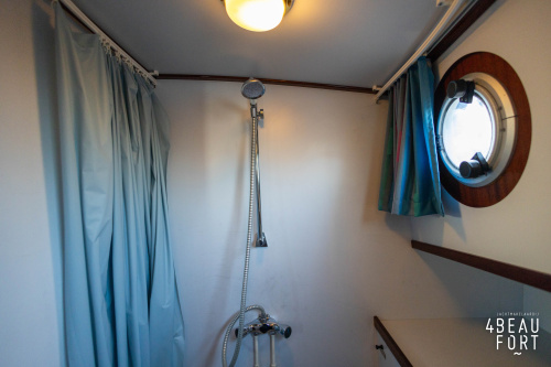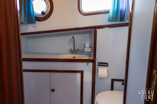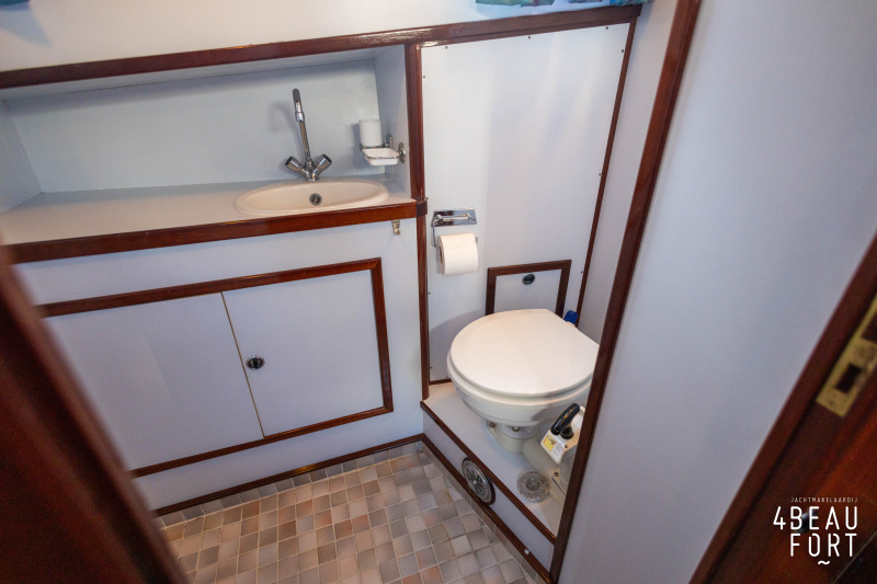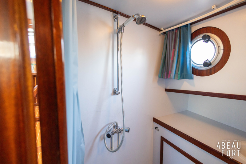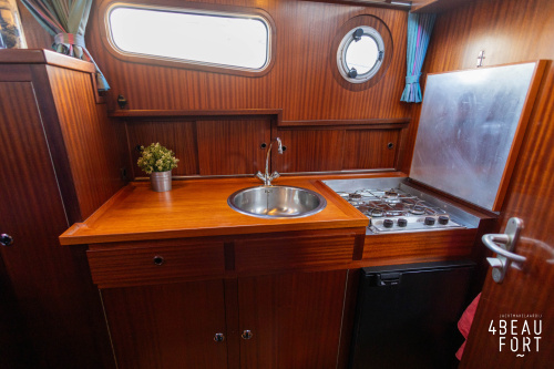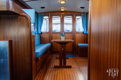 Practical and comfortably furnished, the Valkvlet has a kitchen with warm wooden worktop and a complete bathroom with toilet, sink and shower. In the wheelhouse/saloon you will find a paddle seat with chart table and a pull-out bench for extra sleeping space on the starboard side; On the port side, the steering position and a cupboard wall have been placed, with plenty of ventilation and light through the large sliding hatch, two side windows and two front windows that can be opened. The rear of the wheelhouse consists of four folding doors, so that the saloon and cockpit can easily be made into one spacious space.