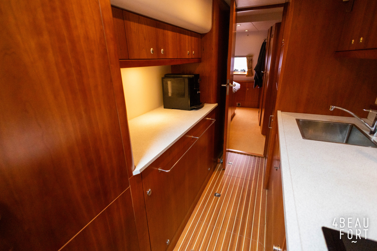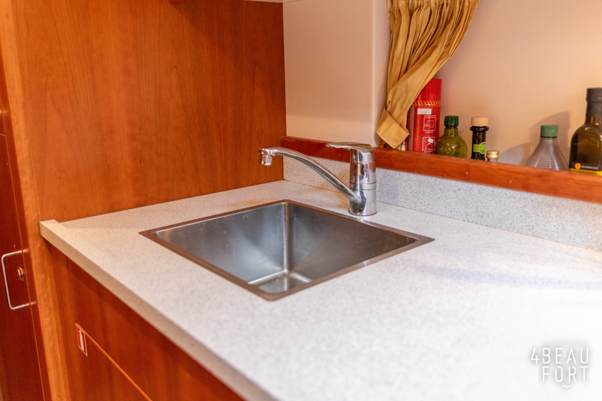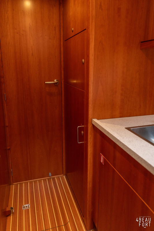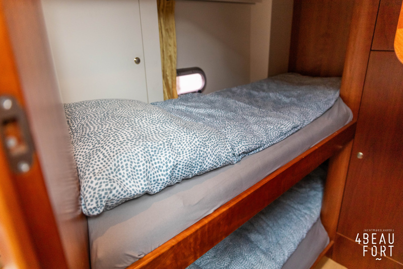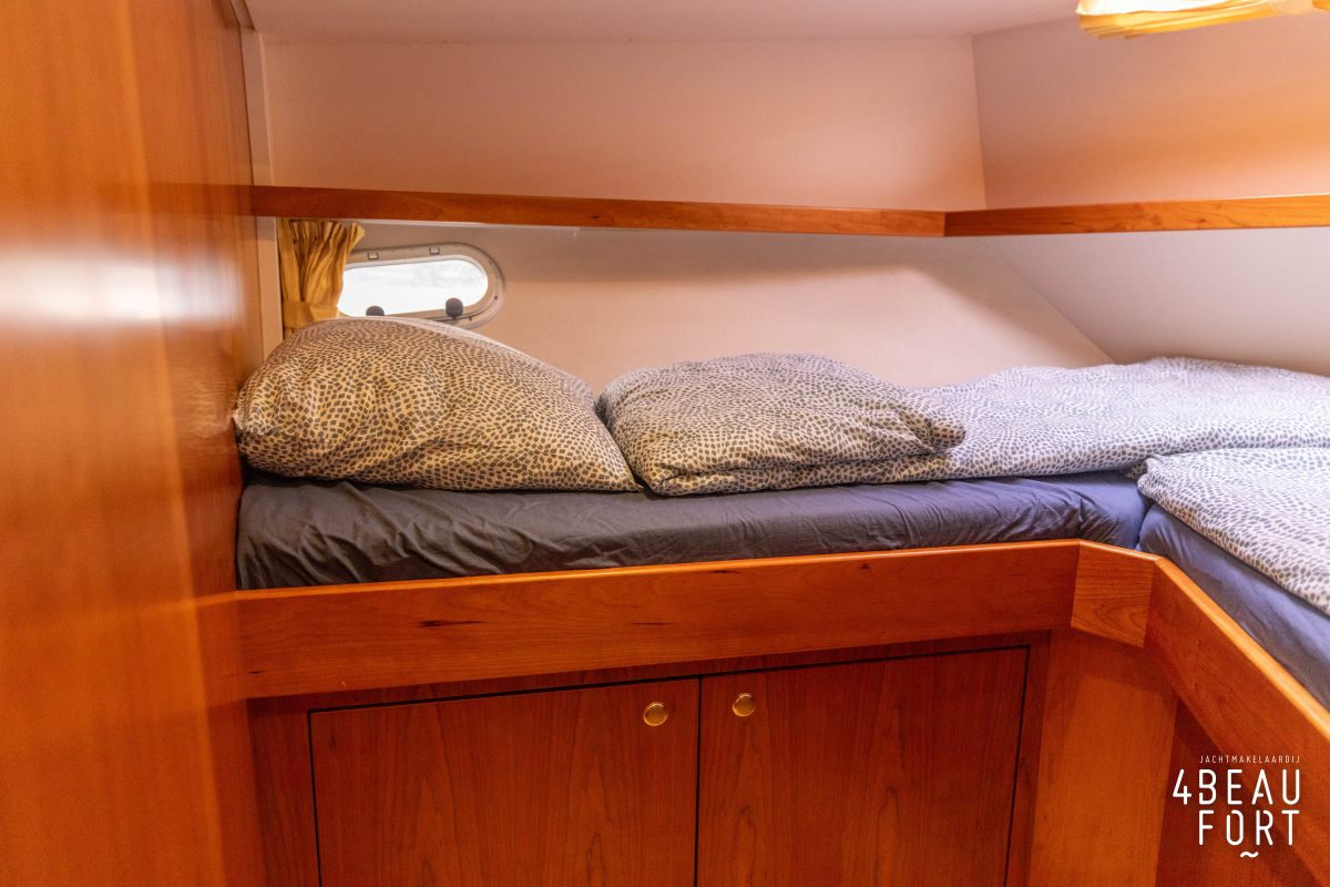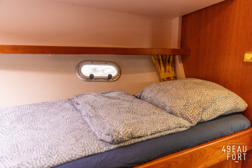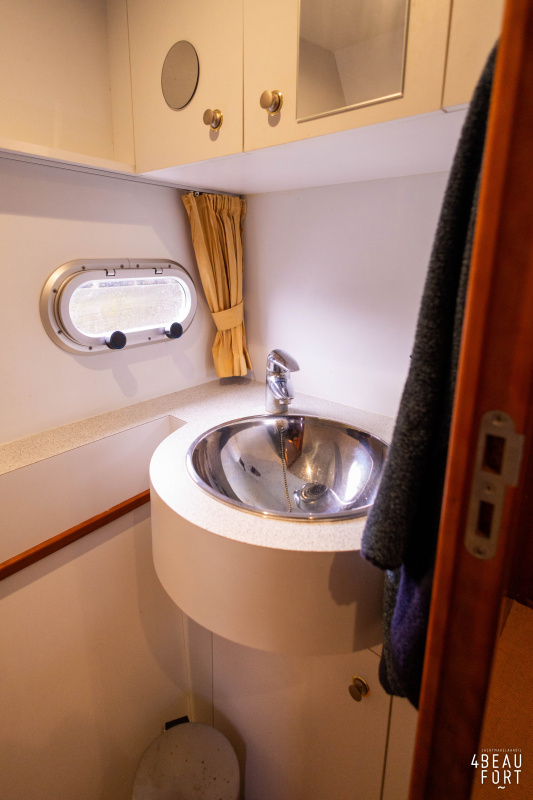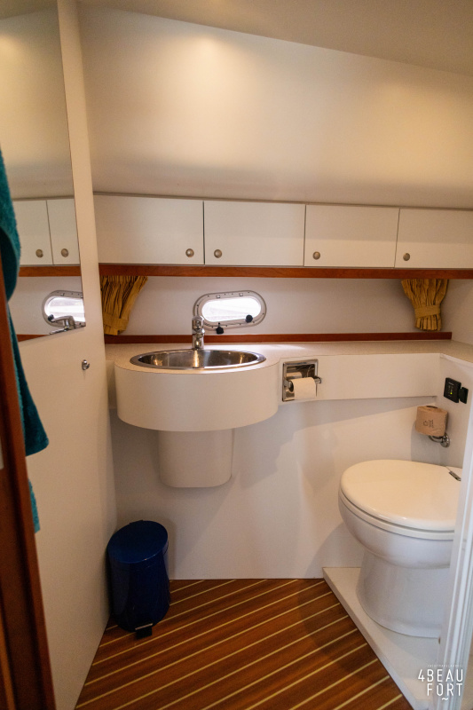 In het voorschip bevindt zich de gastenhut met V‑bed, geschikt voor logees, een complete badkamer met elektrisch toilet, wastafel en douchecabine. Aan stuurboord, naast de machinekamer, is een derde hut met stapelbed die ook uitstekend als extra bergruimte kan dienen. Aan bakboord ligt de volledig uitgeruste kombuis met o.a. koelkast, vriezer, combi‑magnetron, 4‑zone inductiekookplaat, ruim werkblad, veel kastruimte en een wijnkelder!
