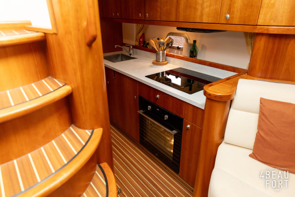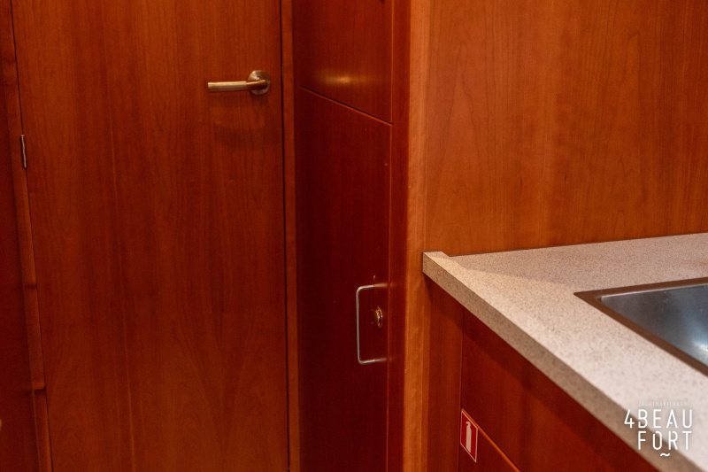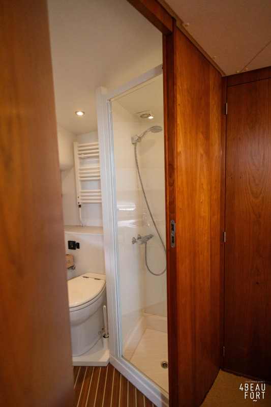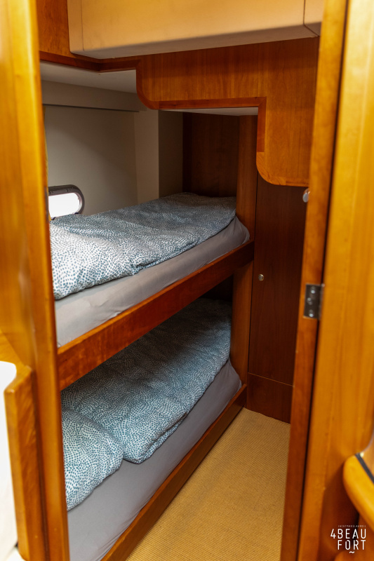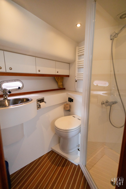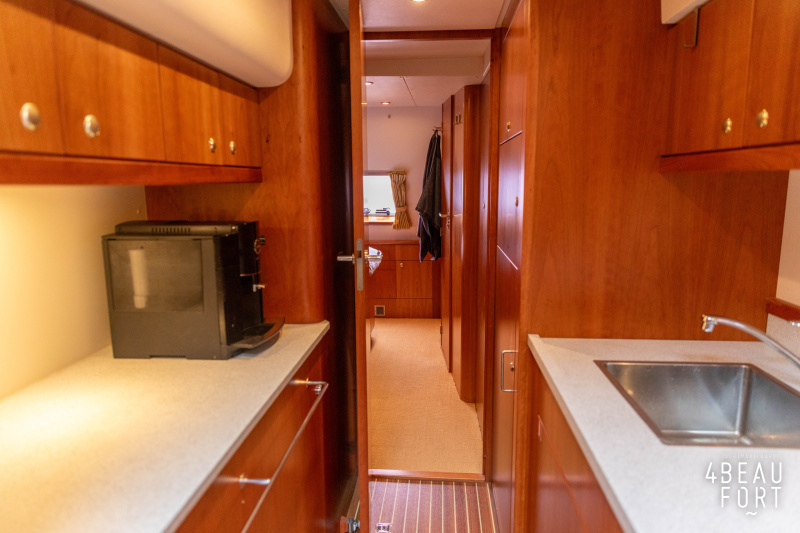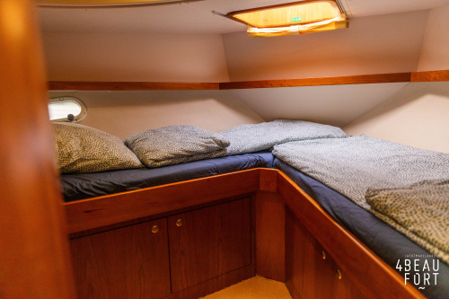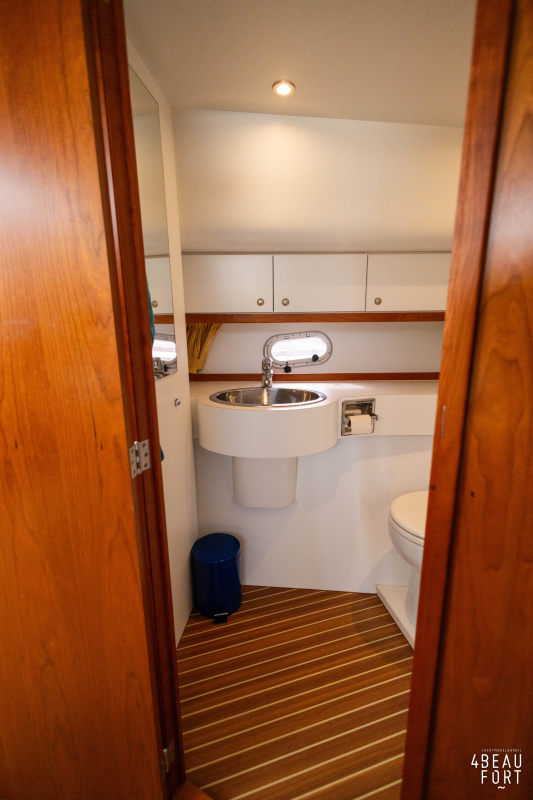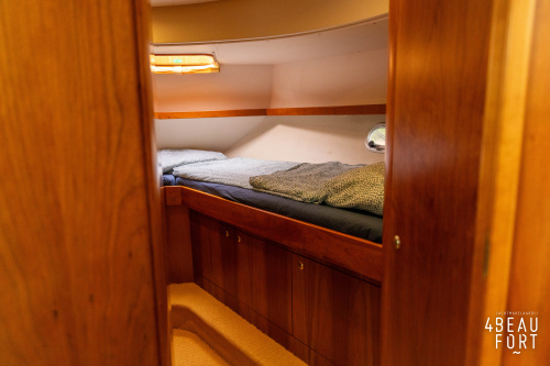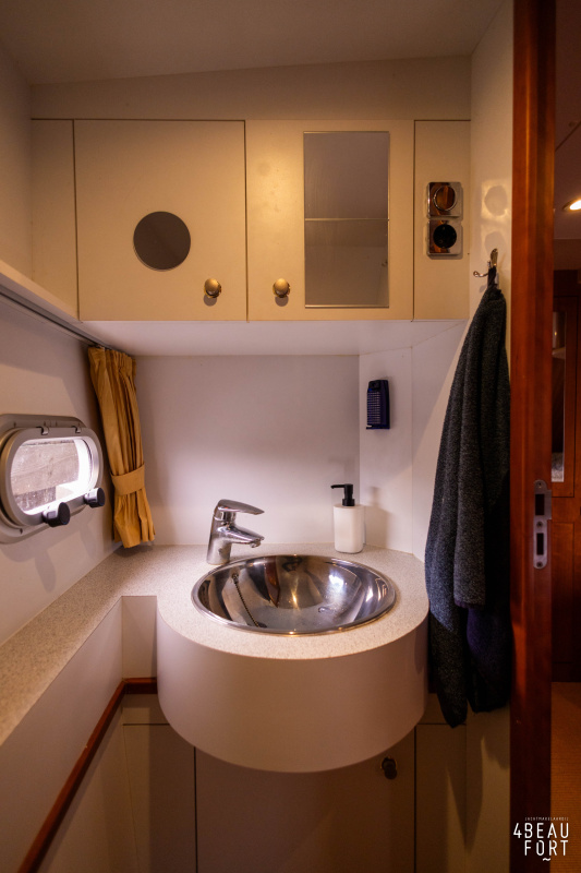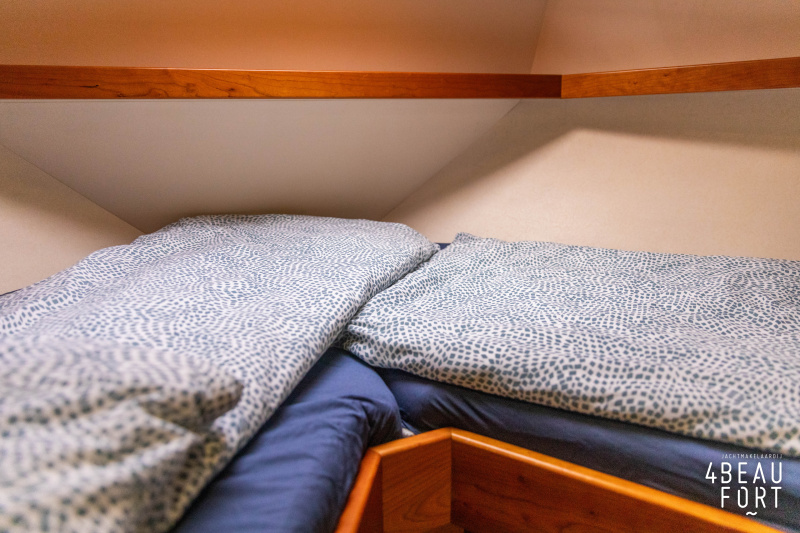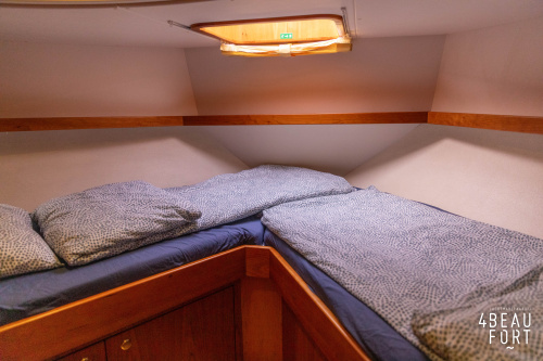 In het voorschip bevindt zich de gastenhut met V‑bed, geschikt voor logees, een complete badkamer met elektrisch toilet, wastafel en douchecabine. Aan stuurboord, naast de machinekamer, is een derde hut met stapelbed die ook uitstekend als extra bergruimte kan dienen. Aan bakboord ligt de volledig uitgeruste kombuis met o.a. koelkast, vriezer, combi‑magnetron, 4‑zone inductiekookplaat, ruim werkblad, veel kastruimte en een wijnkelder!