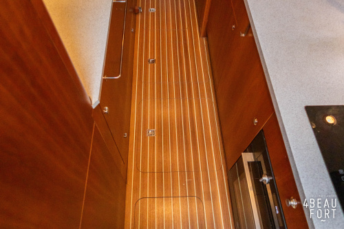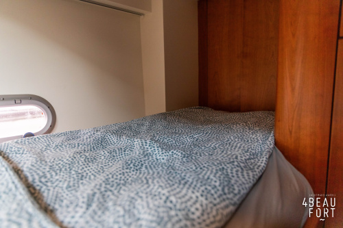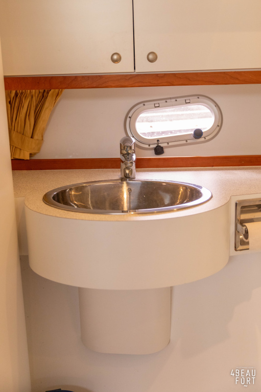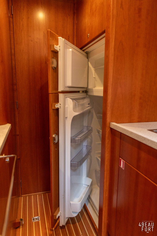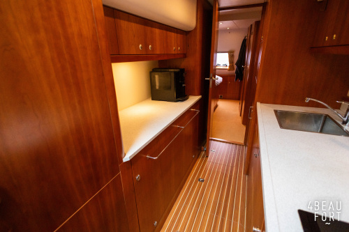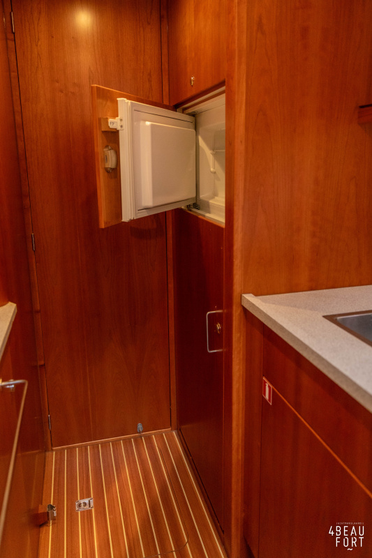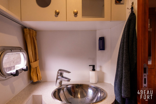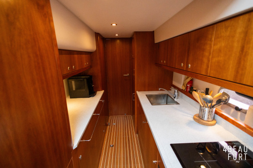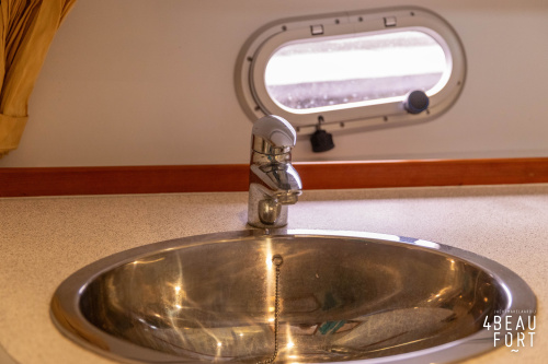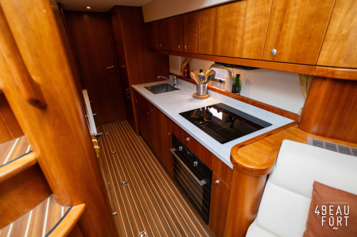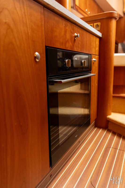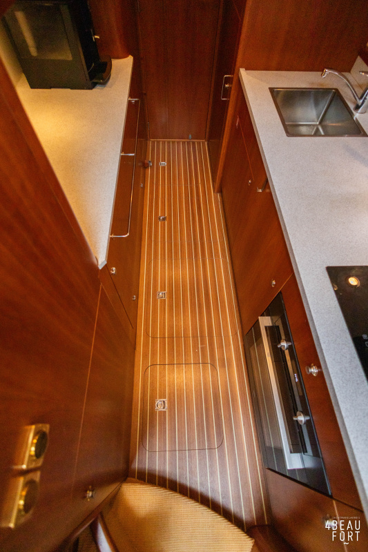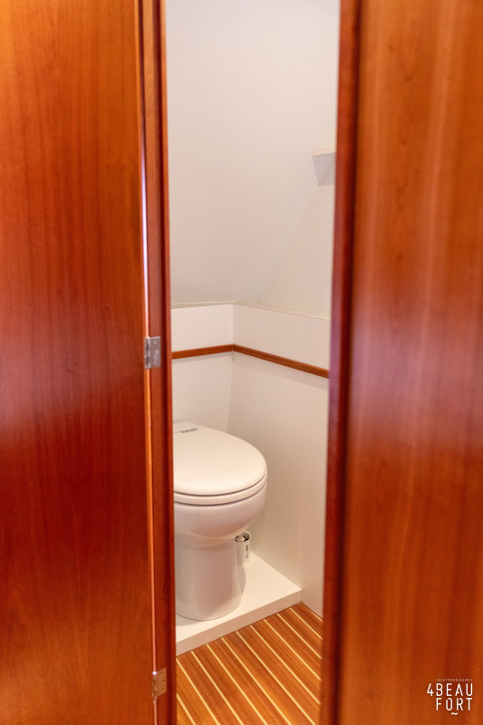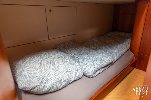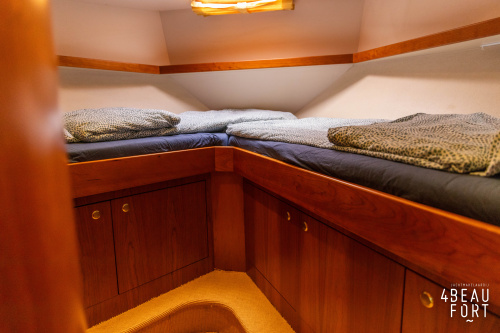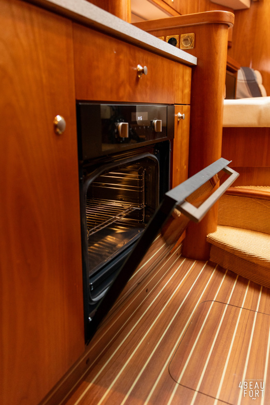 In het voorschip bevindt zich de gastenhut met V‑bed, geschikt voor logees, een complete badkamer met elektrisch toilet, wastafel en douchecabine. Aan stuurboord, naast de machinekamer, is een derde hut met stapelbed die ook uitstekend als extra bergruimte kan dienen. Aan bakboord ligt de volledig uitgeruste kombuis met o.a. koelkast, vriezer, combi‑magnetron, 4‑zone inductiekookplaat, ruim werkblad, veel kastruimte en een wijnkelder!