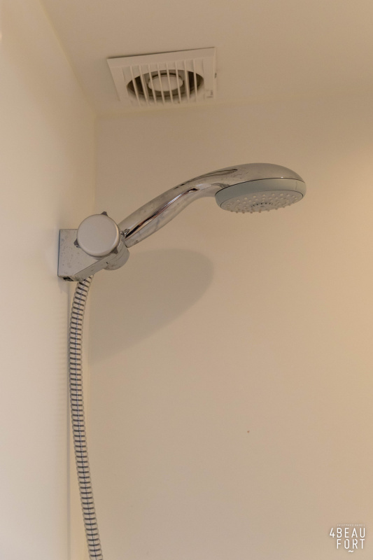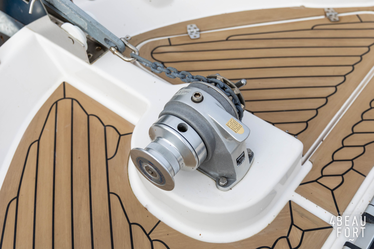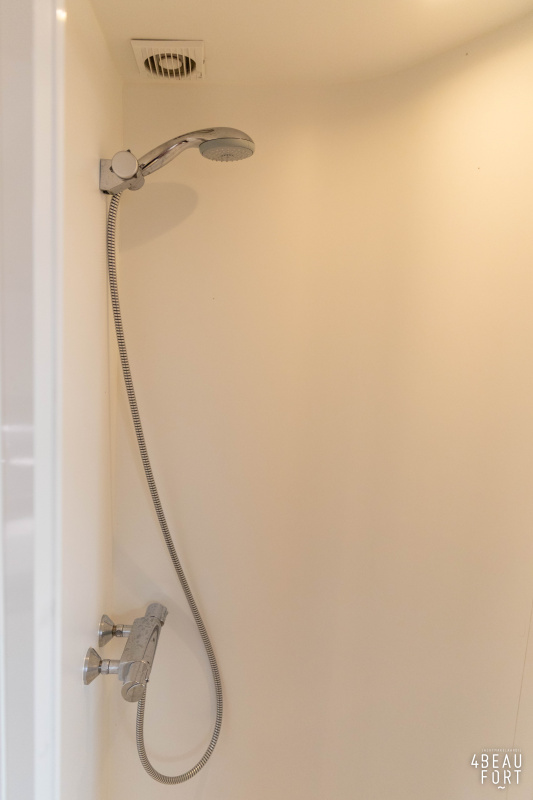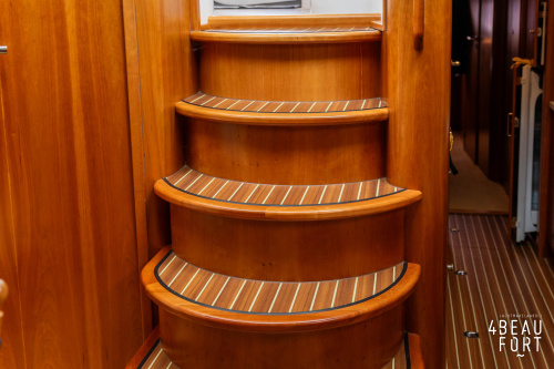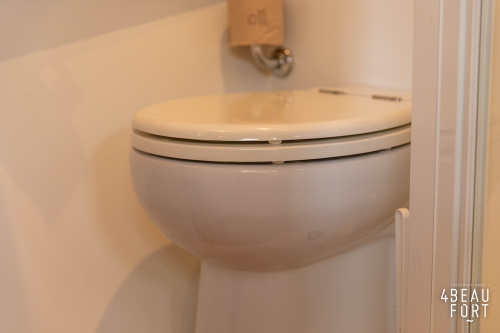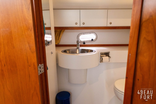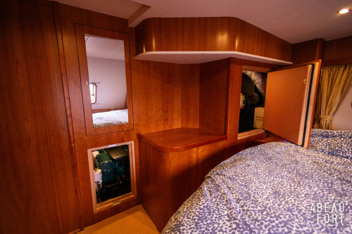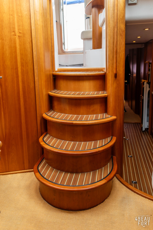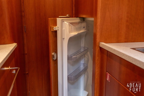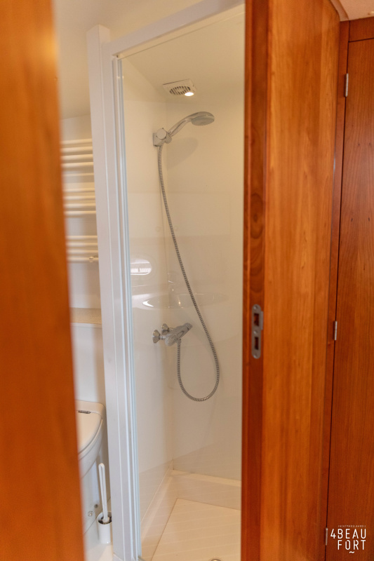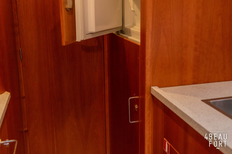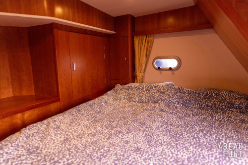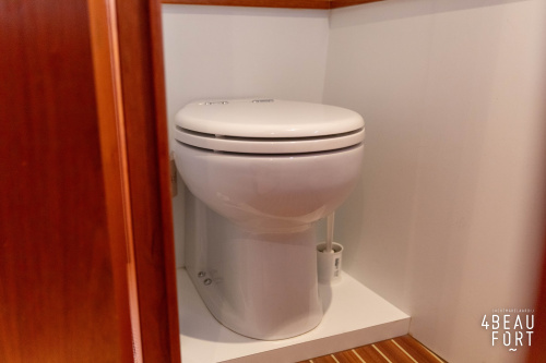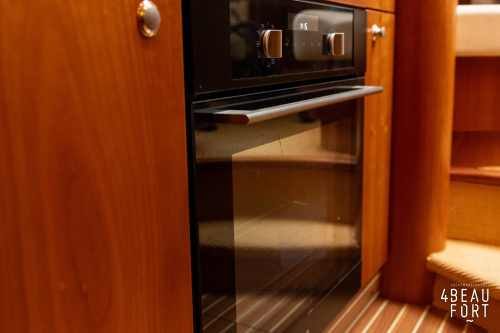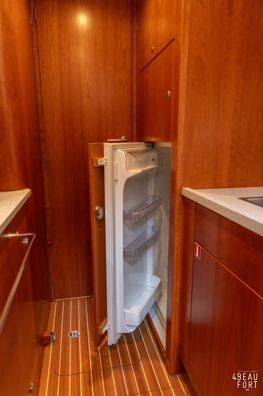 In het voorschip bevindt zich de gastenhut met V‑bed, geschikt voor logees, een complete badkamer met elektrisch toilet, wastafel en douchecabine. Aan stuurboord, naast de machinekamer, is een derde hut met stapelbed die ook uitstekend als extra bergruimte kan dienen. Aan bakboord ligt de volledig uitgeruste kombuis met o.a. koelkast, vriezer, combi‑magnetron, 4‑zone inductiekookplaat, ruim werkblad, veel kastruimte en een wijnkelder!