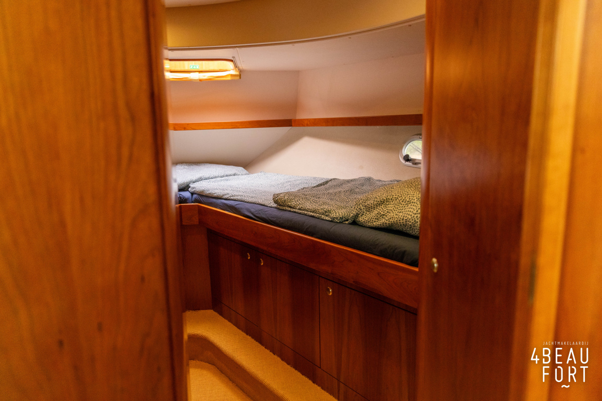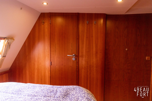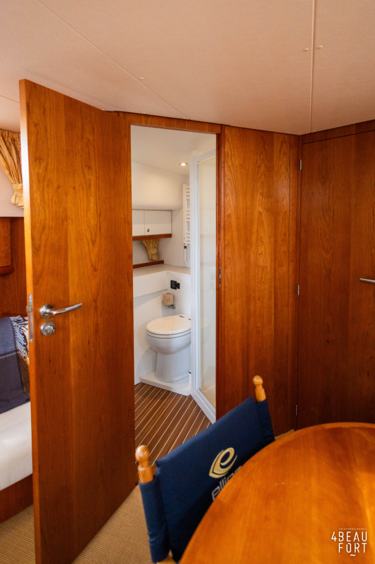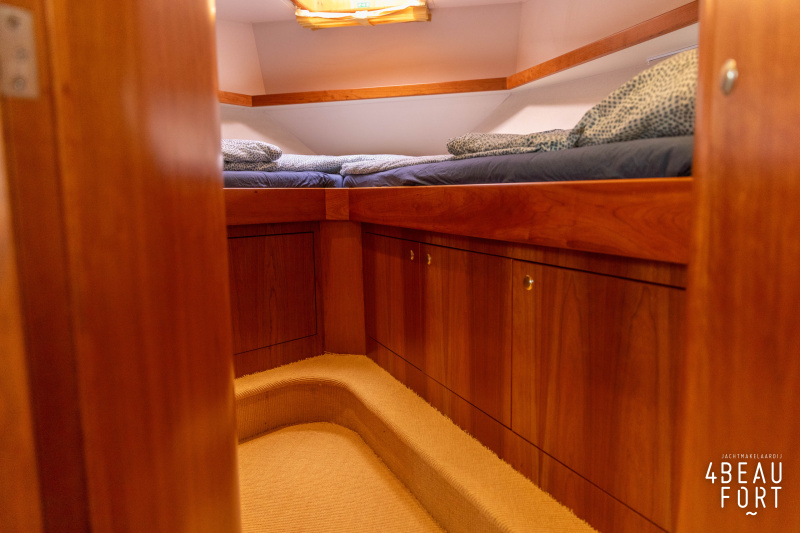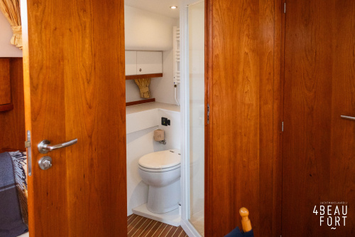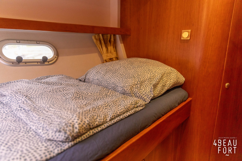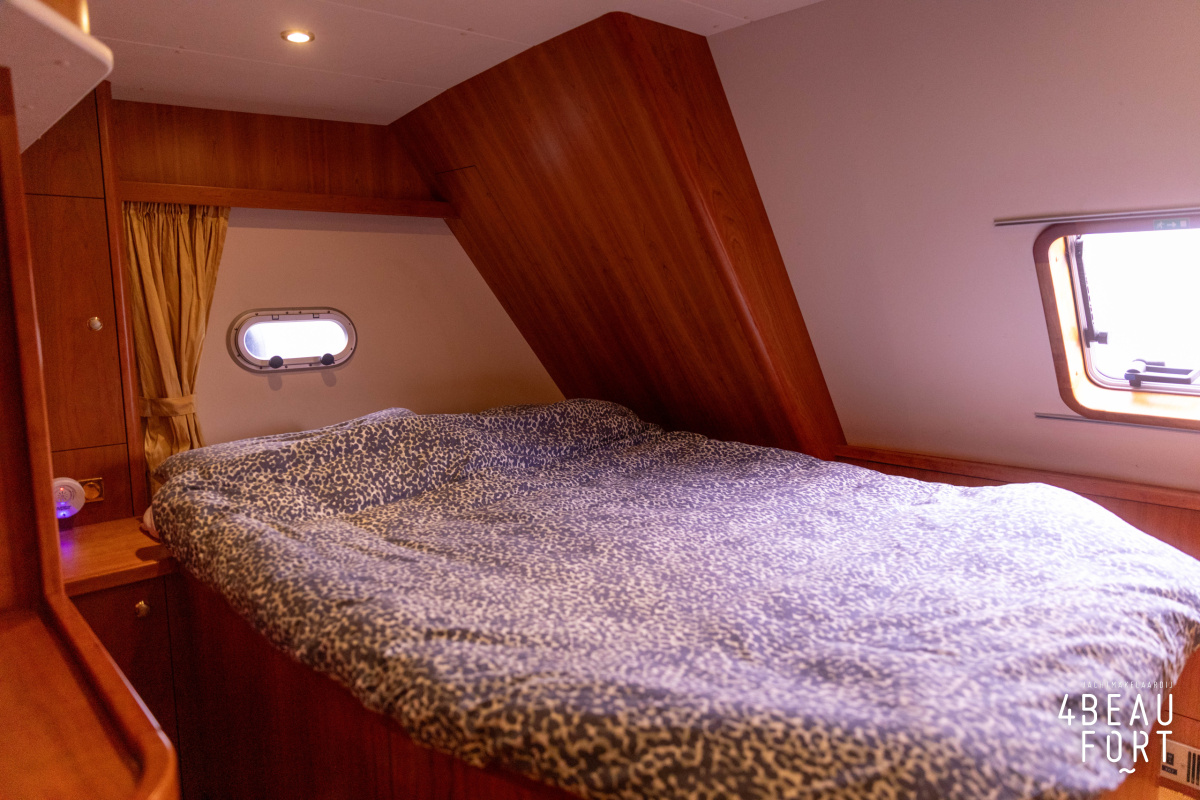 De eigenaarshut beslaat de volle breedte van het schip en biedt een vrijstaand bed, kast/bergruimte en een eigen badkamer met elektrisch toilet en wastafelmeubel. Motor en techniek zijn vanaf meerdere punten eenvoudig toegankelijk, wat onderhoud en controle vergemakkelijkt.