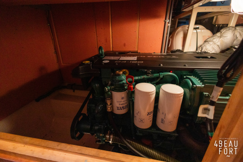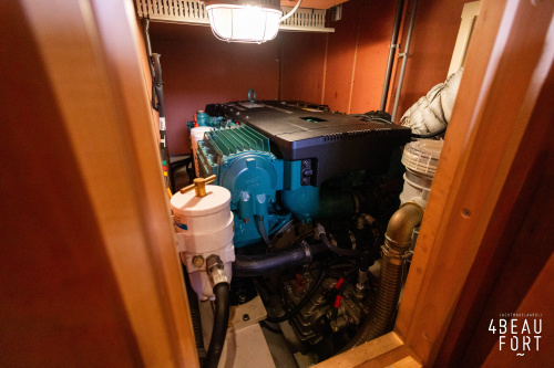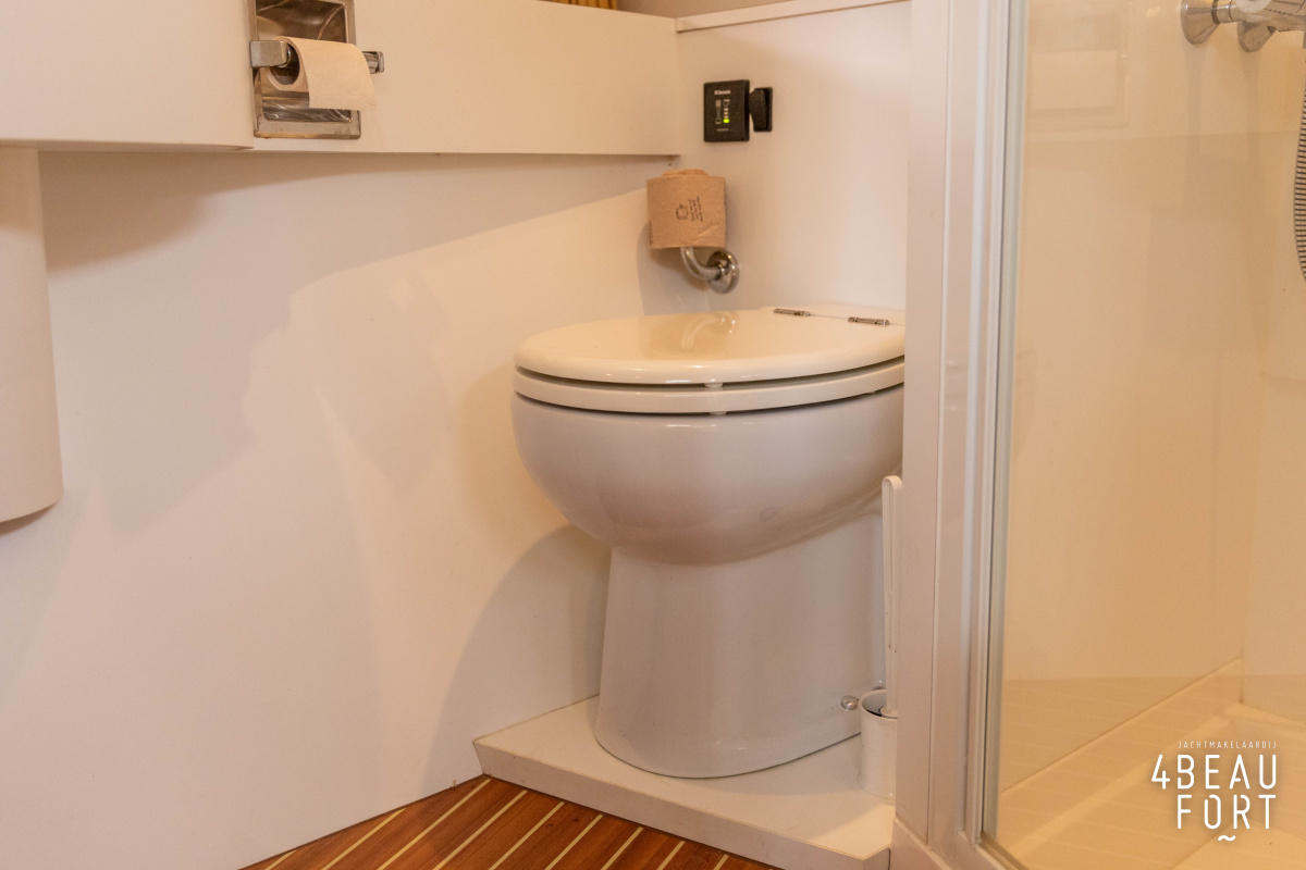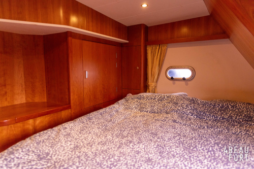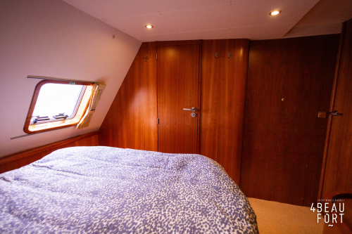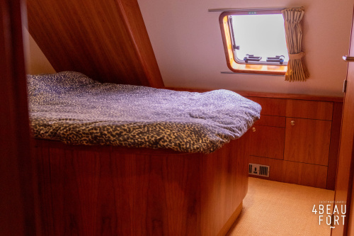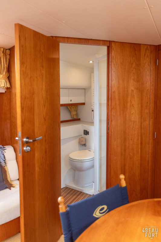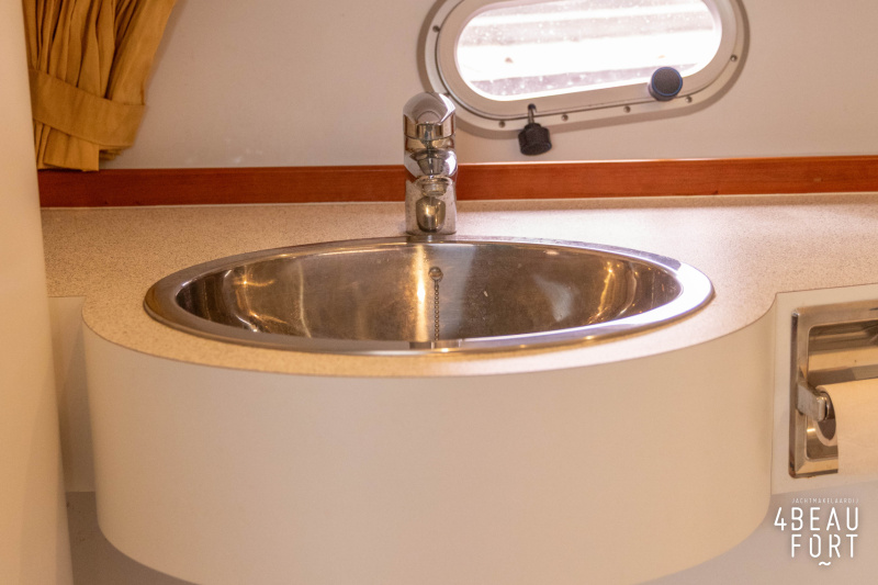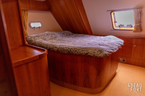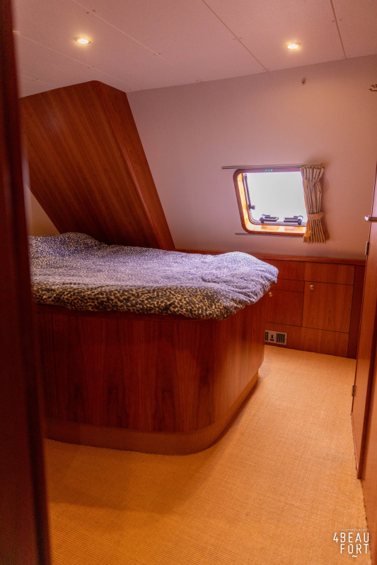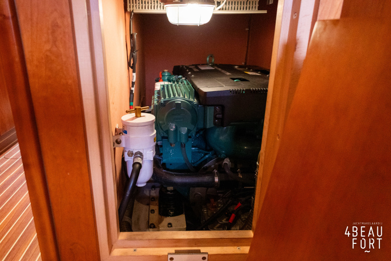 De eigenaarshut beslaat de volle breedte van het schip en biedt een vrijstaand bed, kast/bergruimte en een eigen badkamer met elektrisch toilet en wastafelmeubel. Motor en techniek zijn vanaf meerdere punten eenvoudig toegankelijk, wat onderhoud en controle vergemakkelijkt.