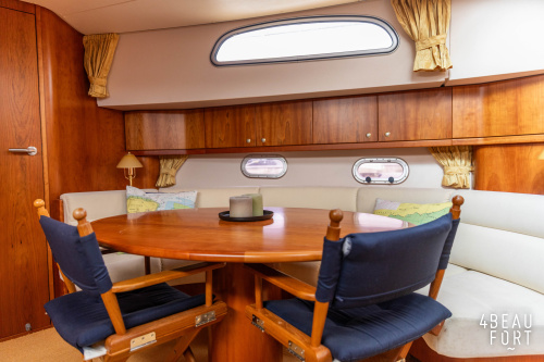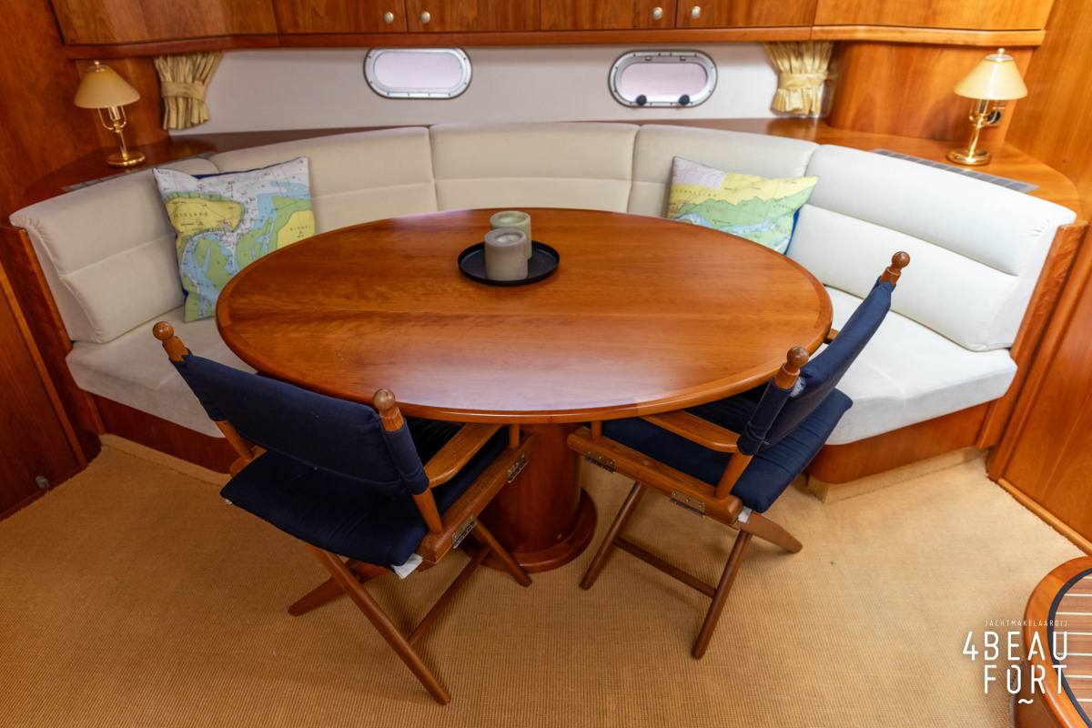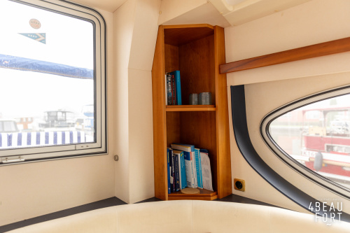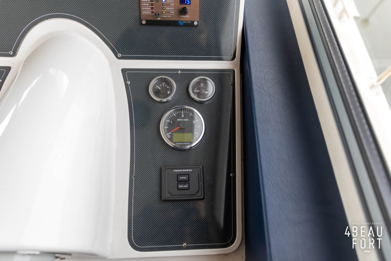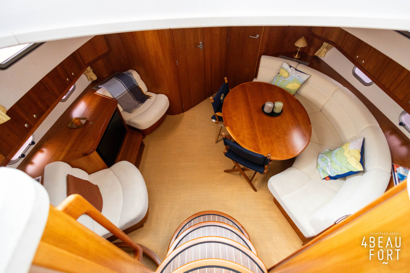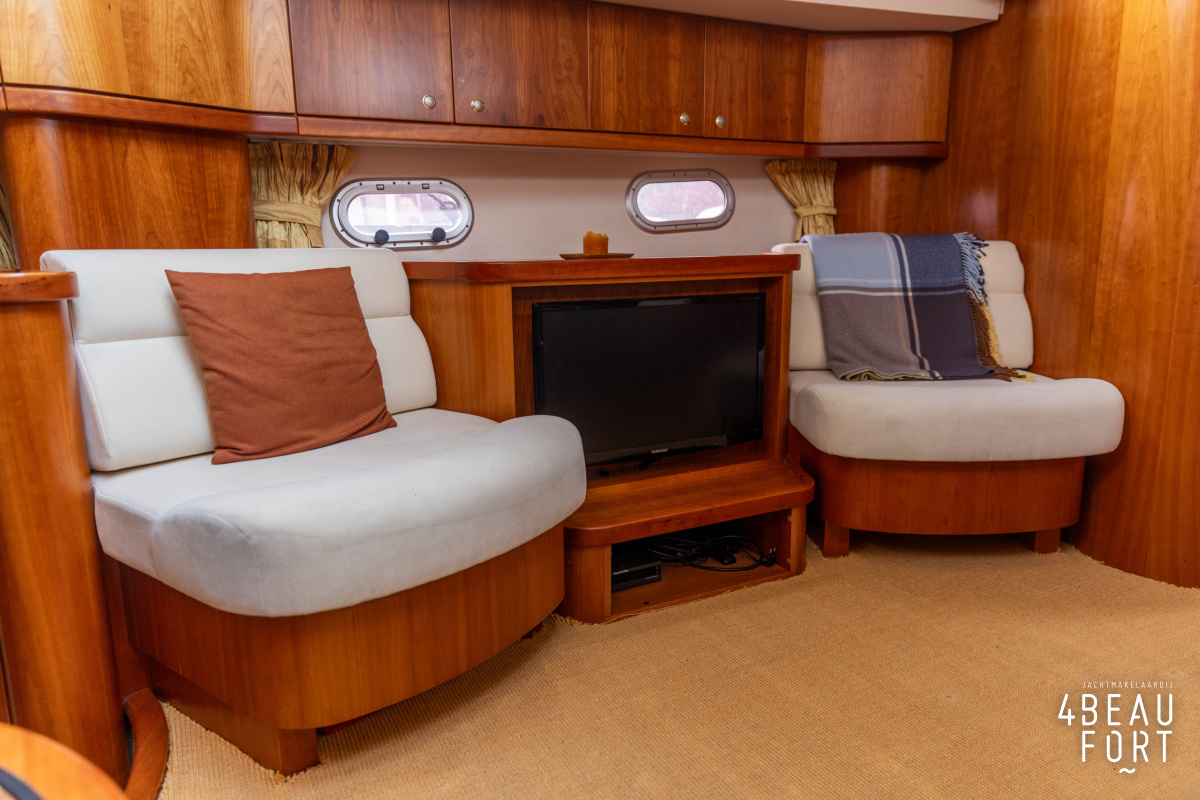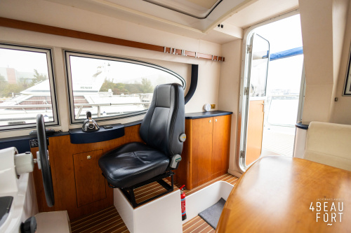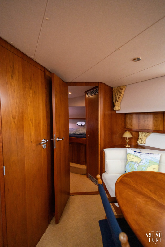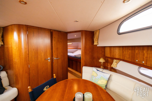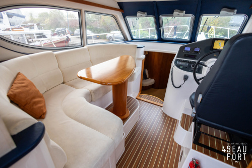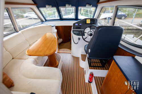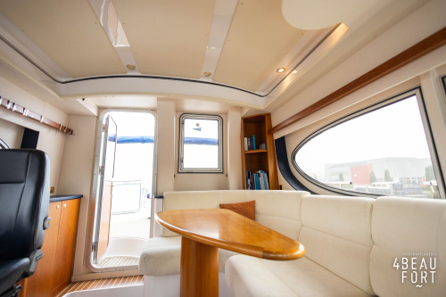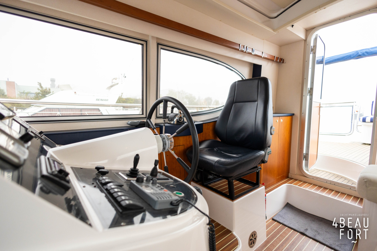 Het interieur is modern met een duidelijk scheepskarakter. De stuurhut is praktisch ingedeeld; de overzichtelijke stuurstand is voorzien van uitgebreide navigatieapparatuur en een comfortabele L‑vormige zitbank. Grote raampartijen zorgen voor een panoramisch uitzicht en veel daglicht, terwijl het elektrisch te openen schuifdak en het frontraam voor aangename ventilatie zorgen.