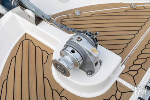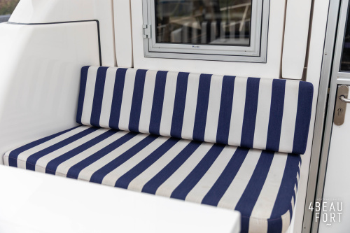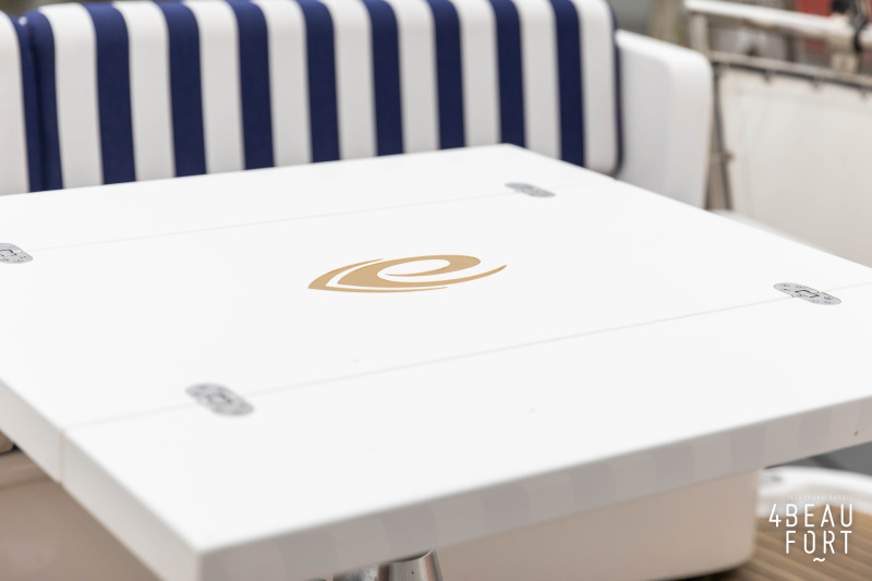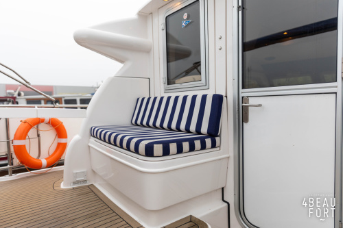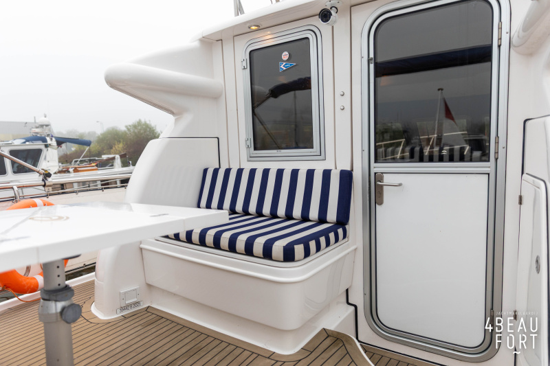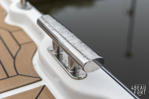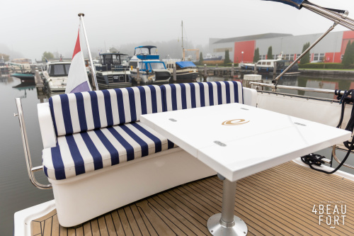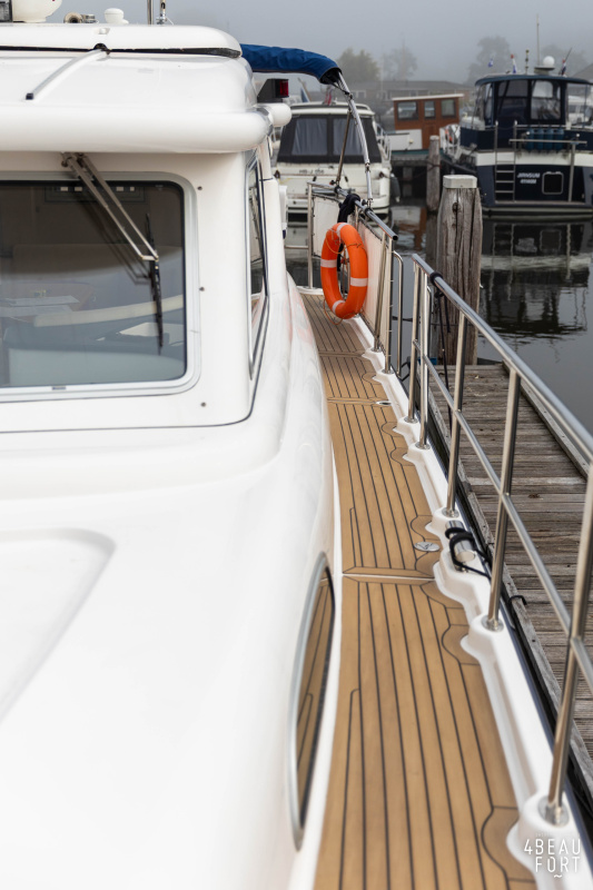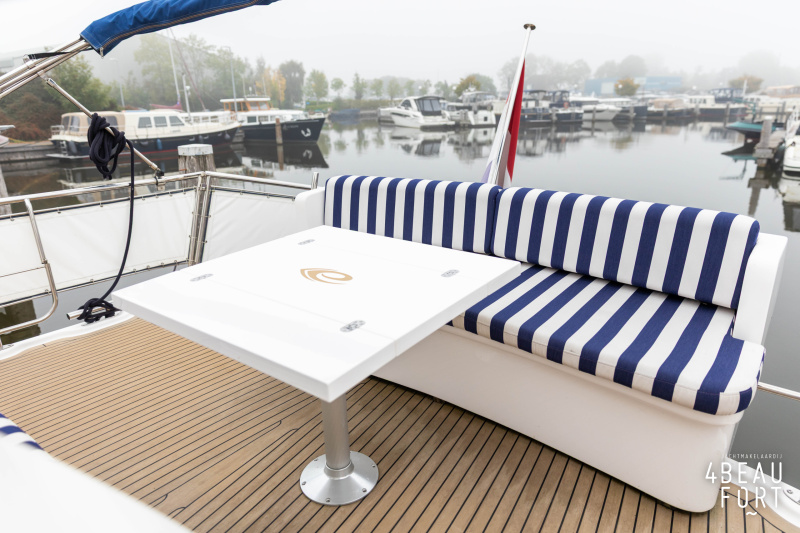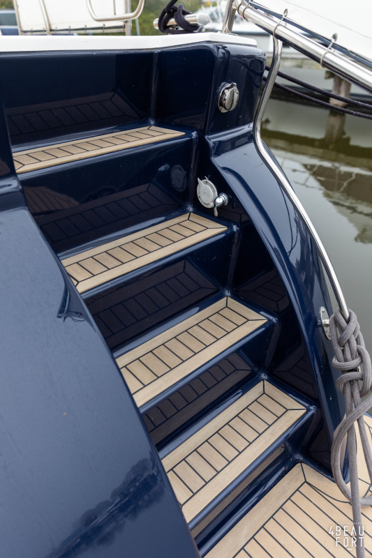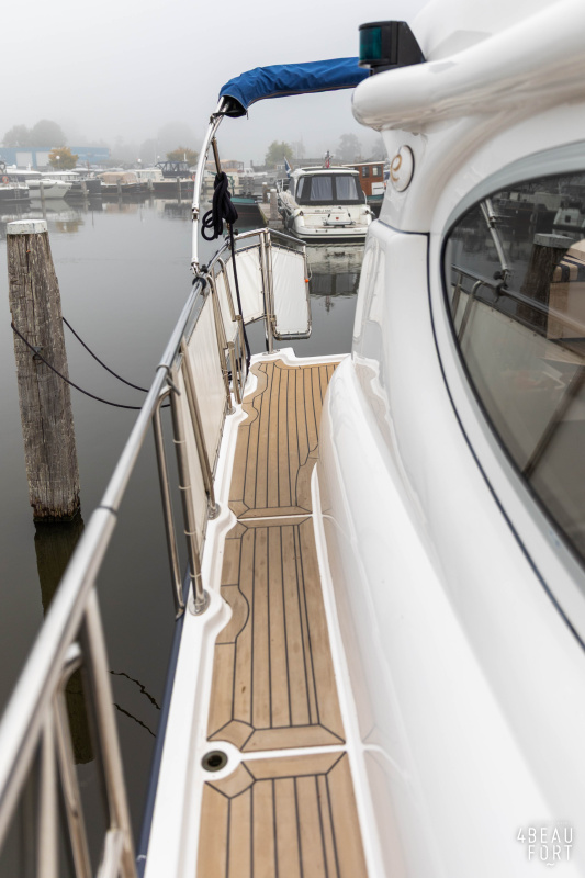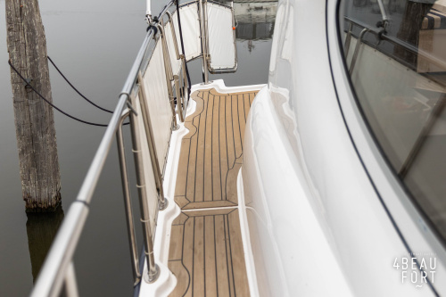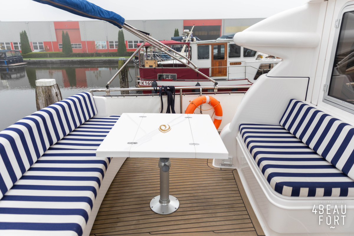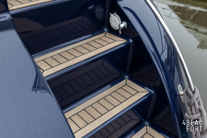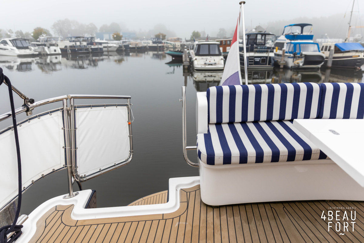 Aan dek vallen de geïntegreerde zitbank en het verzonken zonnebed in het voordek direct op. Het ruime achterdek biedt volop zitplaatsen, brede gangboorden en een veilige RVS‑rail rondom. Via de geïntegreerde spiegeltrap bereikt u moeiteloos het royale zwemplateau.