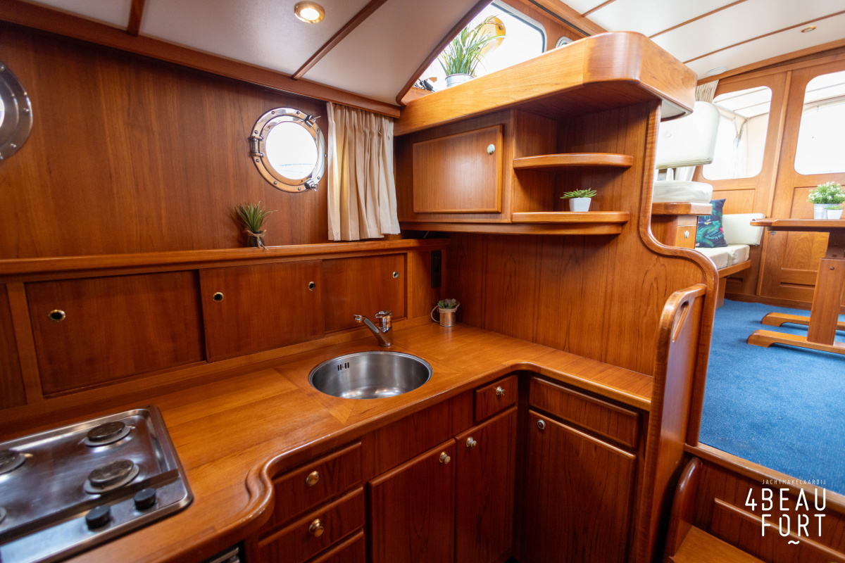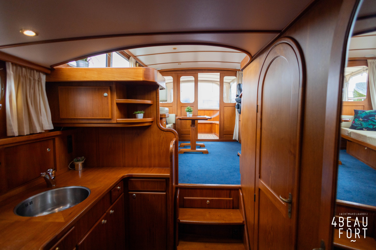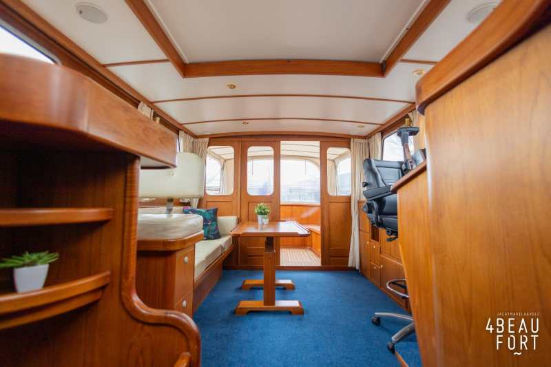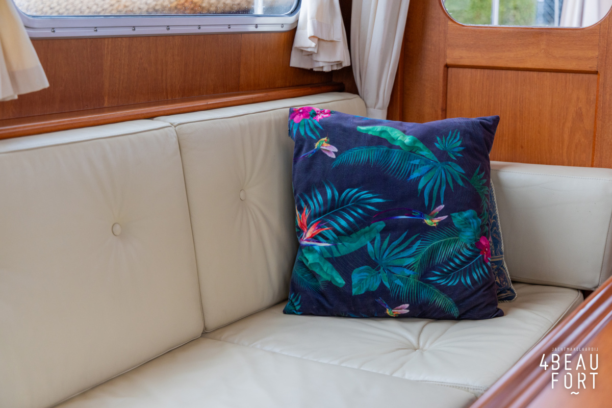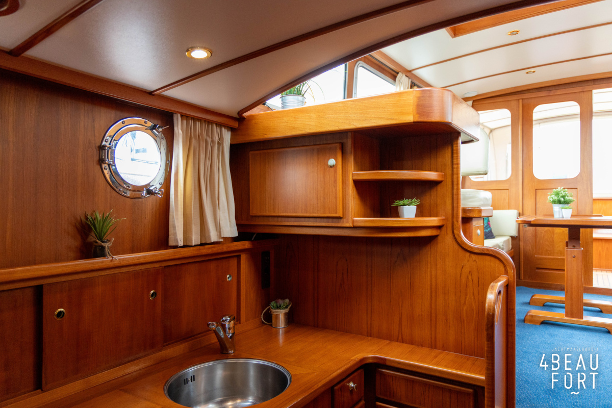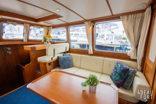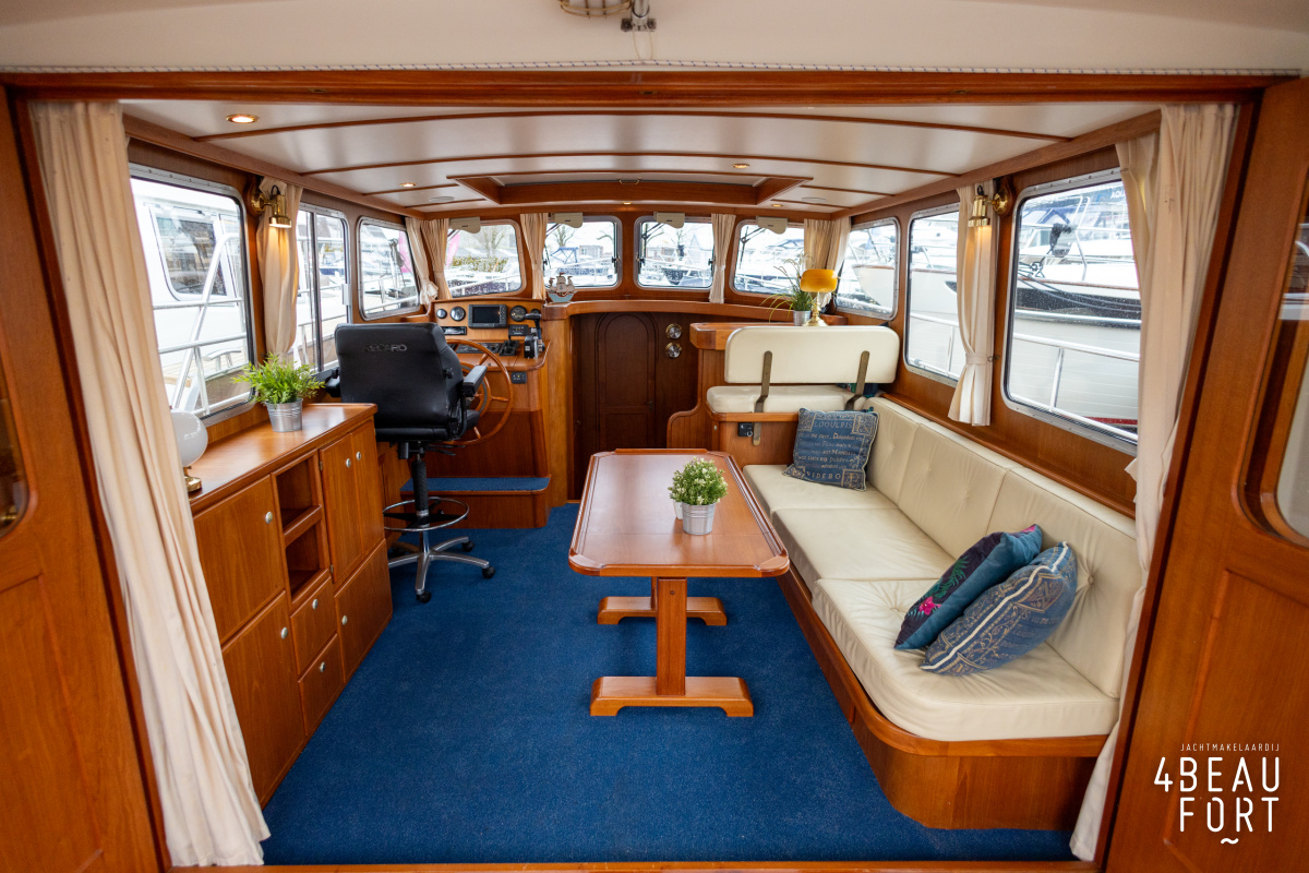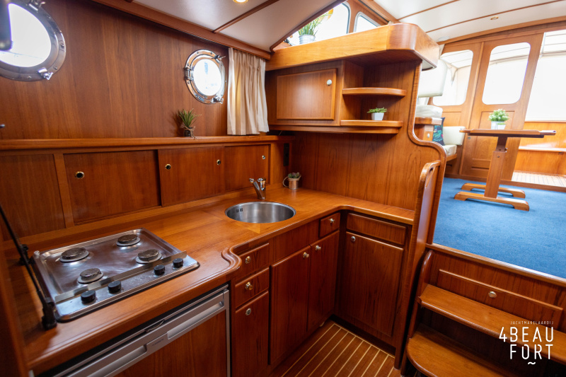 De kombuis is praktisch en verzorgd ingericht met een vierpits gasstel, een koelkast, een ruim werkblad en veel kastruimte, en tegenover ligt de nette, ruime badkamer met een wastafelmeubel, toilet en een aparte douchecabine. De salon heeft een ruime bank die met leder is bekleed. De bank is eenvoudig om te bouwen tot een tweepersoonsbed, zodat gasten ook comfortabel kunnen overnachten. De stuurstand is compleet met uitgebreide navigatieapparatuur, naast een meevaardersbank met kaartentafel en een kastenwand voor o.a. televisie en boeken.
