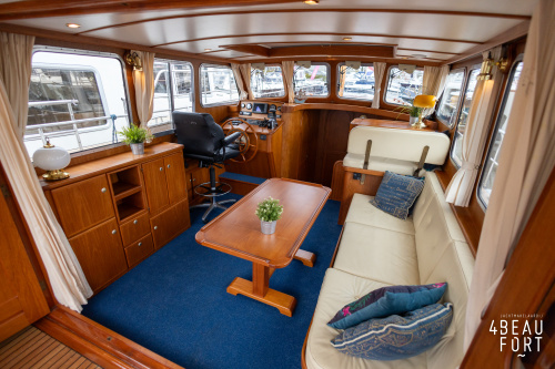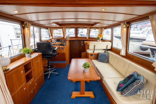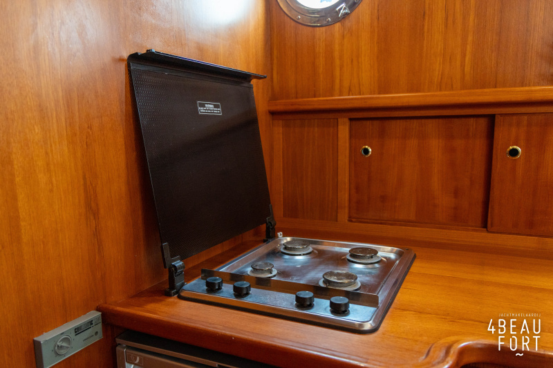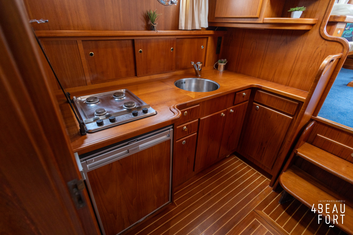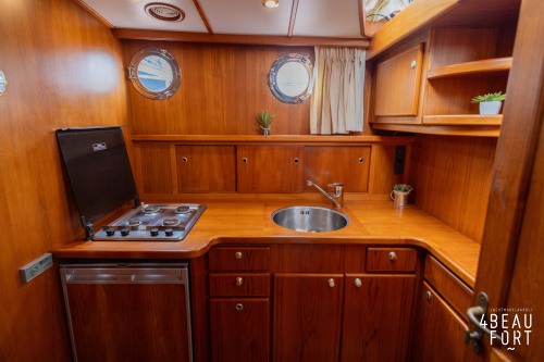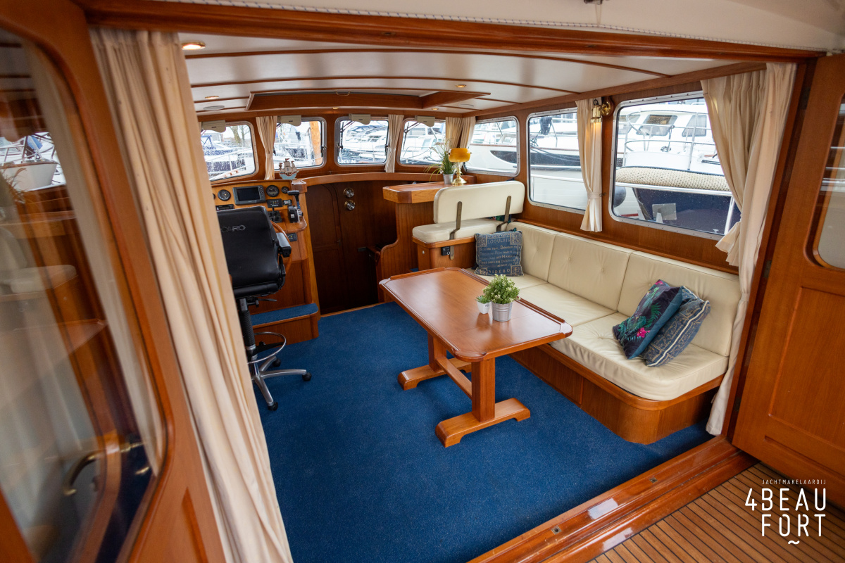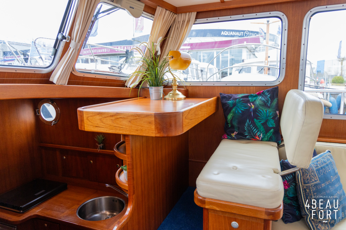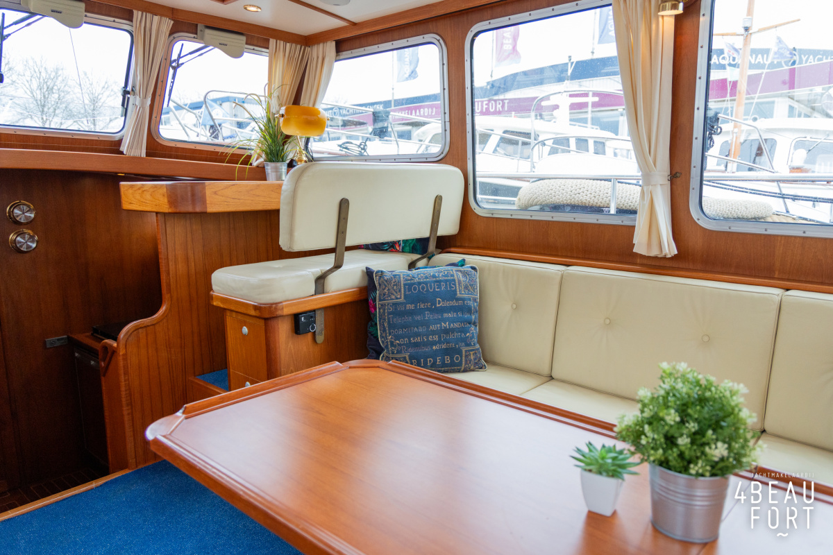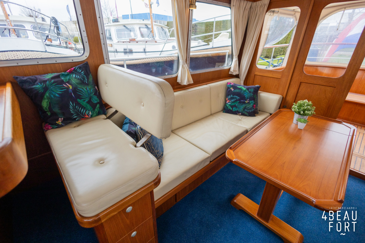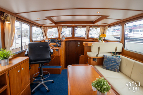 De kombuis is praktisch en verzorgd ingericht met een vierpits gasstel, een koelkast, een ruim werkblad en veel kastruimte, en tegenover ligt de nette, ruime badkamer met een wastafelmeubel, toilet en een aparte douchecabine. De salon heeft een ruime bank die met leder is bekleed. De bank is eenvoudig om te bouwen tot een tweepersoonsbed, zodat gasten ook comfortabel kunnen overnachten. De stuurstand is compleet met uitgebreide navigatieapparatuur, naast een meevaardersbank met kaartentafel en een kastenwand voor o.a. televisie en boeken.