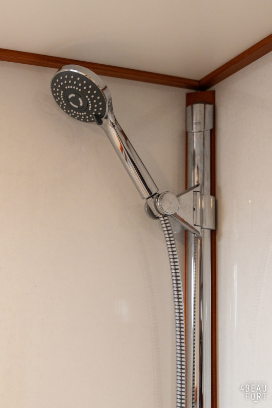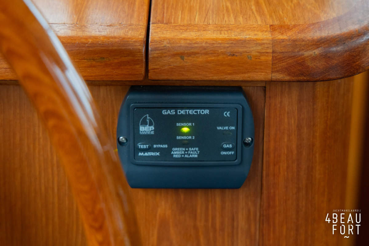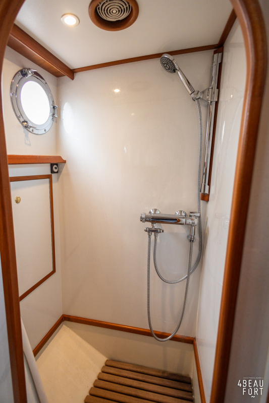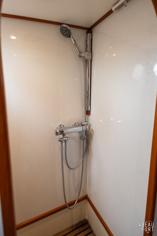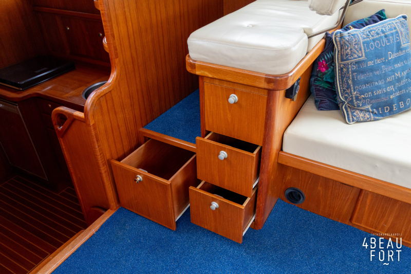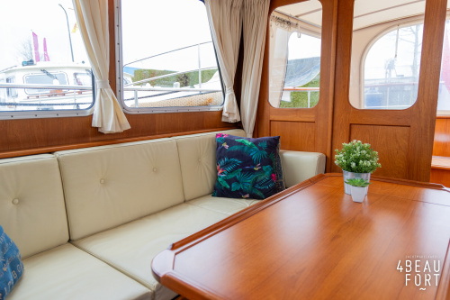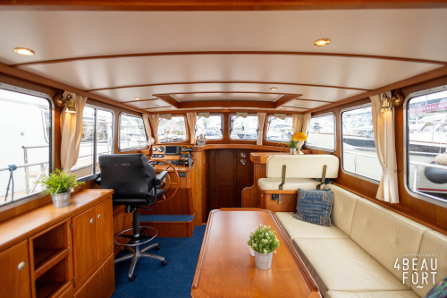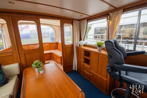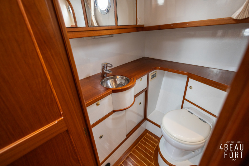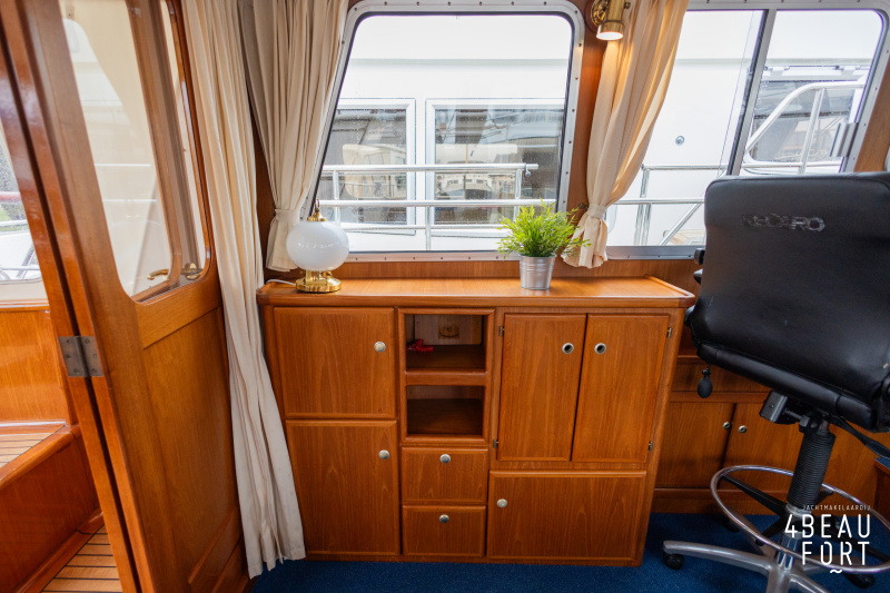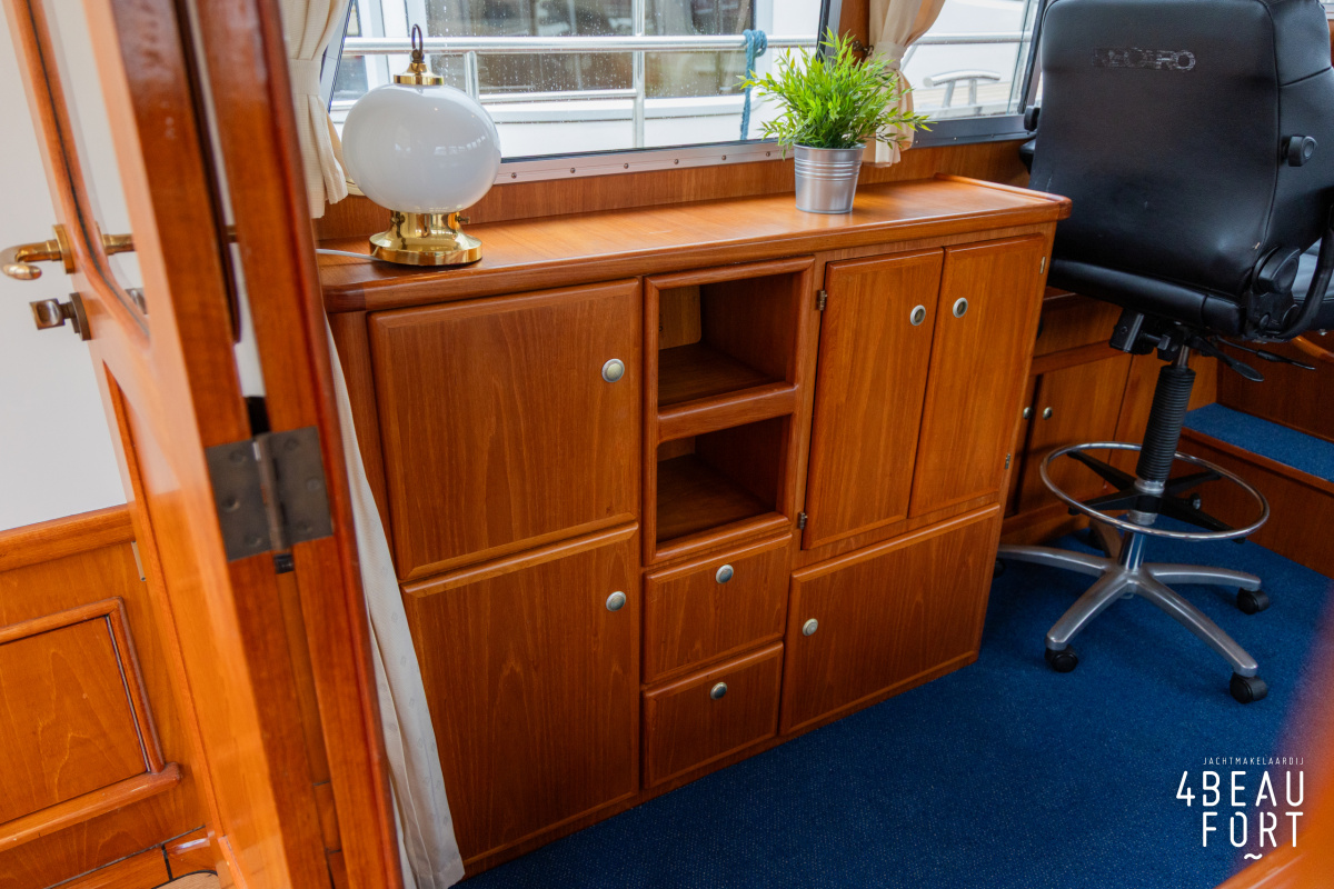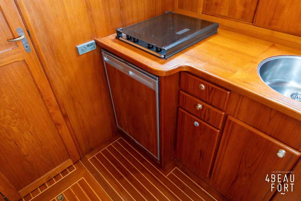 De kombuis is praktisch en verzorgd ingericht met een vierpits gasstel, een koelkast, een ruim werkblad en veel kastruimte, en tegenover ligt de nette, ruime badkamer met een wastafelmeubel, toilet en een aparte douchecabine. De salon heeft een ruime bank die met leder is bekleed. De bank is eenvoudig om te bouwen tot een tweepersoonsbed, zodat gasten ook comfortabel kunnen overnachten. De stuurstand is compleet met uitgebreide navigatieapparatuur, naast een meevaardersbank met kaartentafel en een kastenwand voor o.a. televisie en boeken.