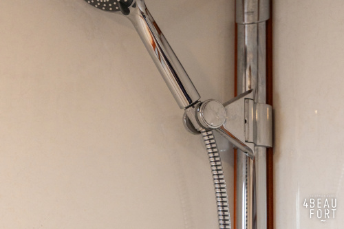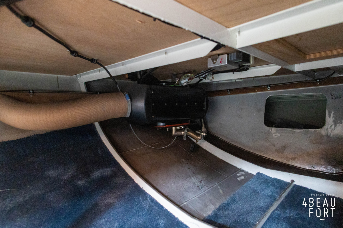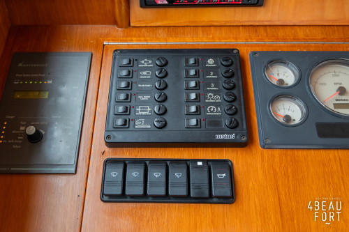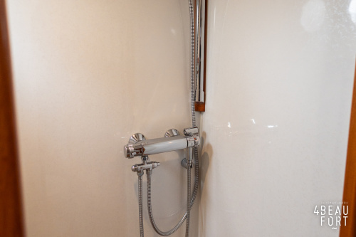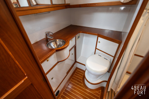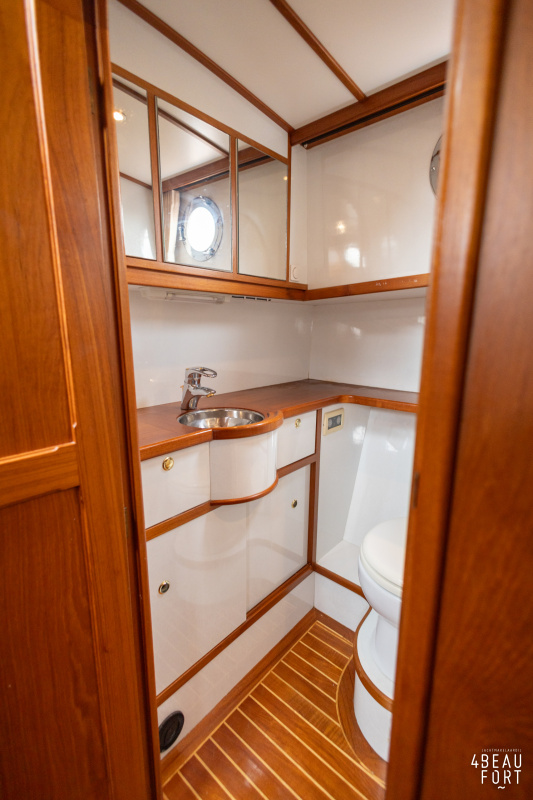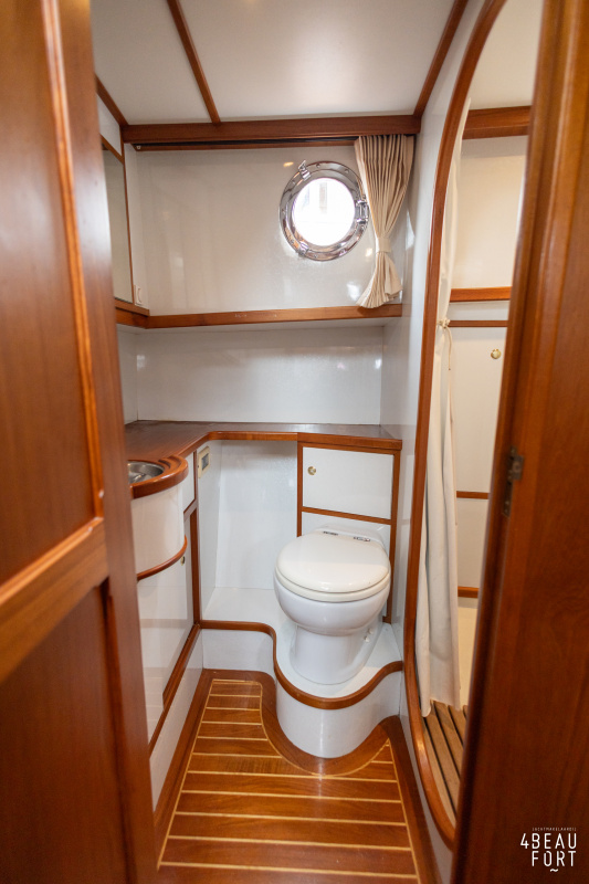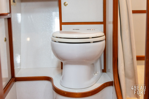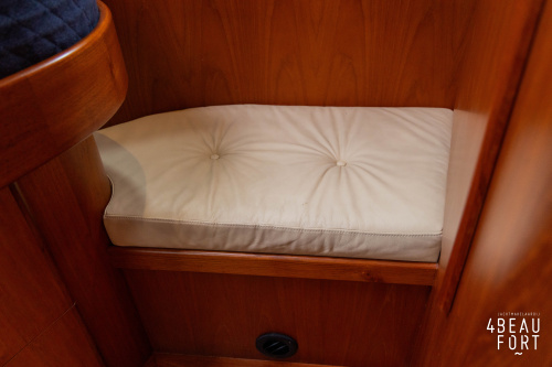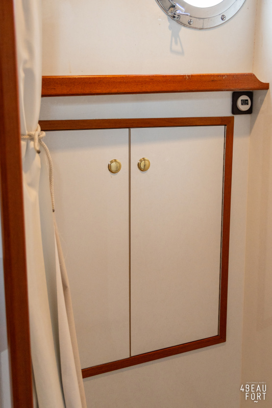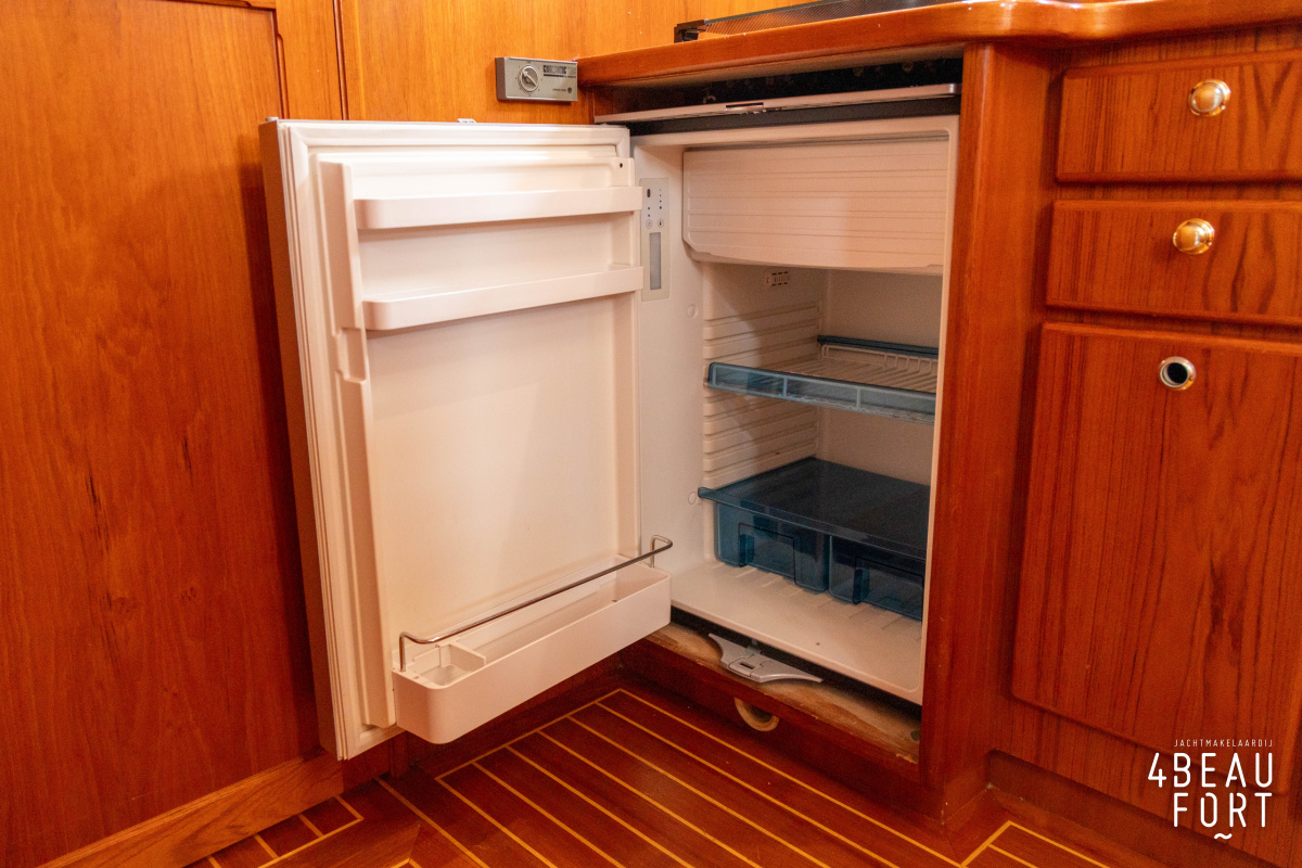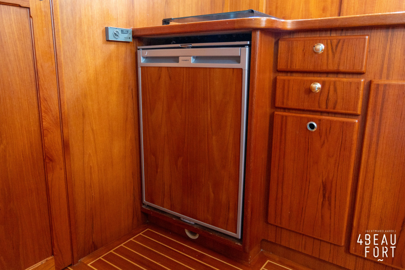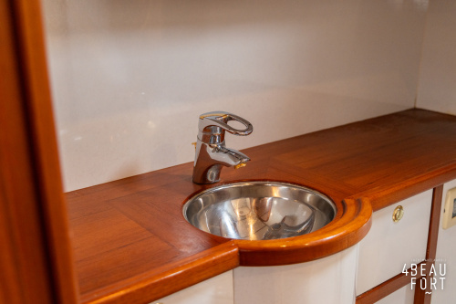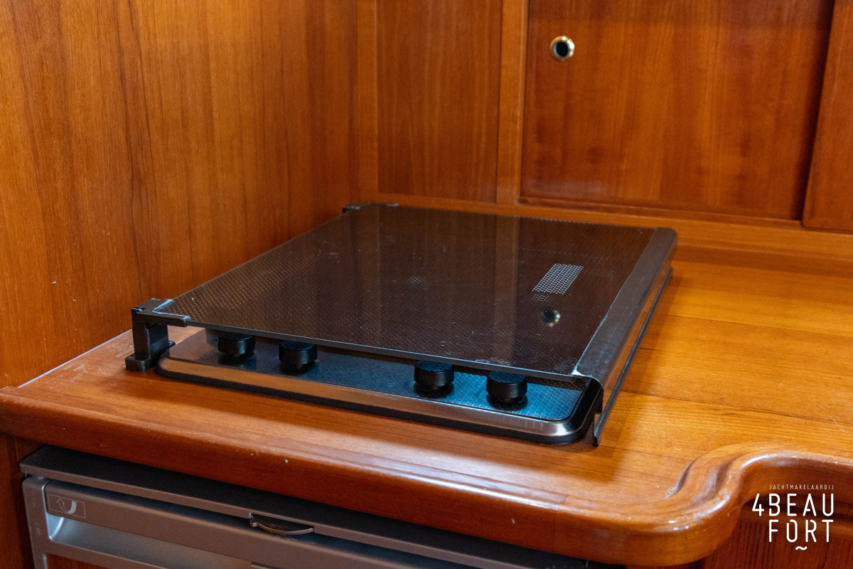 De kombuis is praktisch en verzorgd ingericht met een vierpits gasstel, een koelkast, een ruim werkblad en veel kastruimte, en tegenover ligt de nette, ruime badkamer met een wastafelmeubel, toilet en een aparte douchecabine. De salon heeft een ruime bank die met leder is bekleed. De bank is eenvoudig om te bouwen tot een tweepersoonsbed, zodat gasten ook comfortabel kunnen overnachten. De stuurstand is compleet met uitgebreide navigatieapparatuur, naast een meevaardersbank met kaartentafel en een kastenwand voor o.a. televisie en boeken.