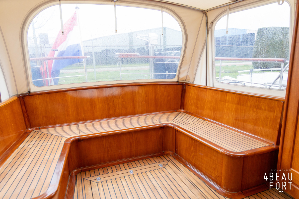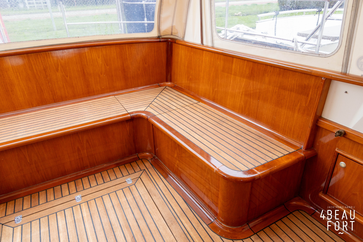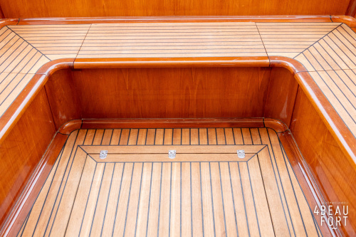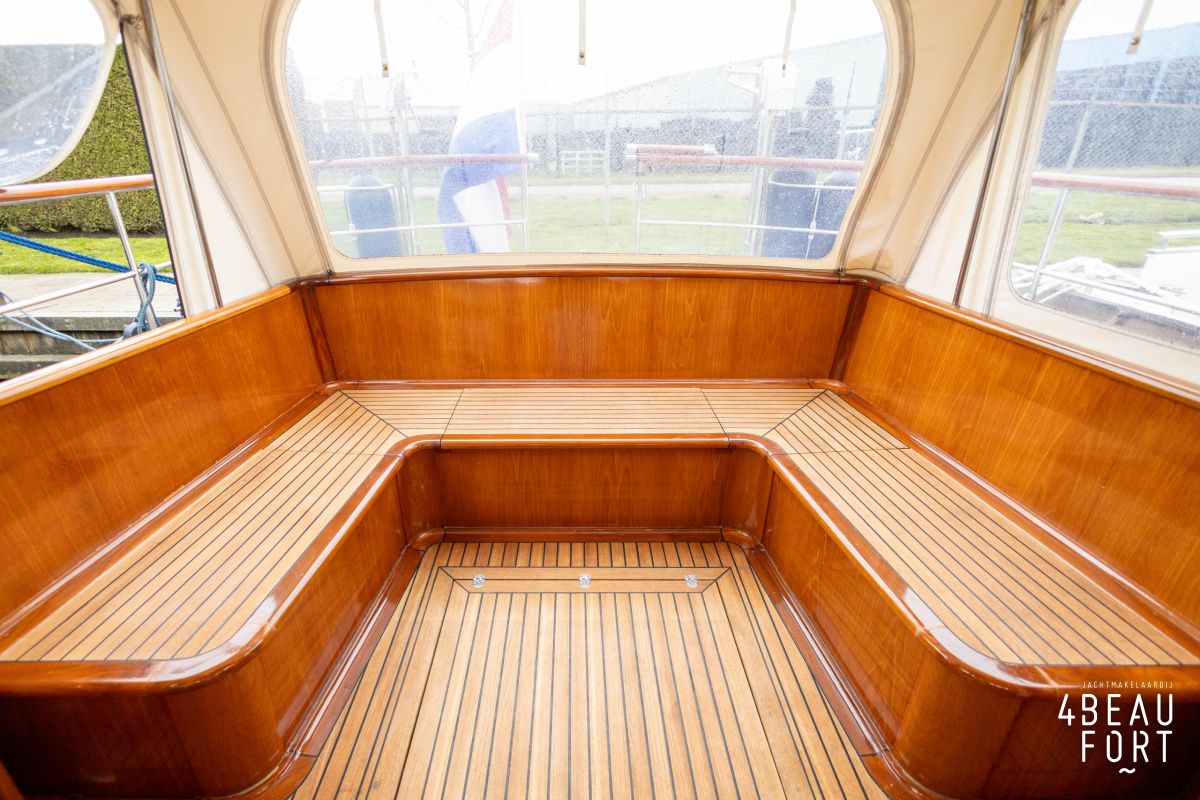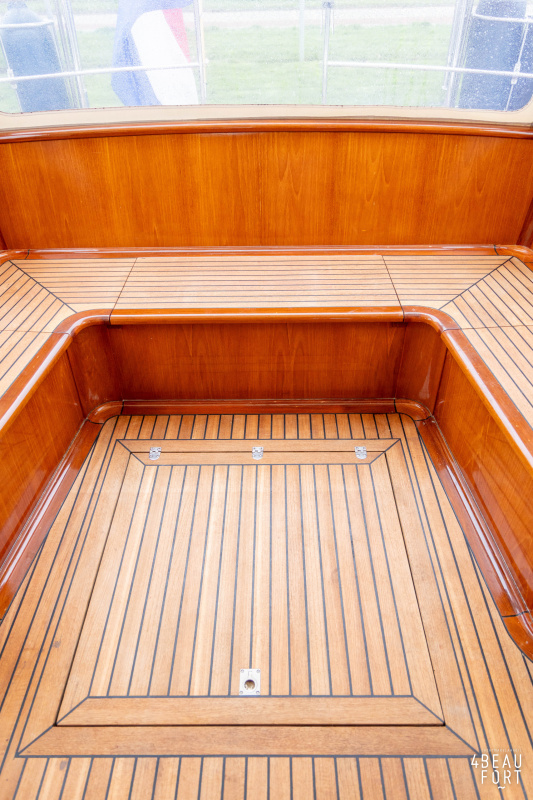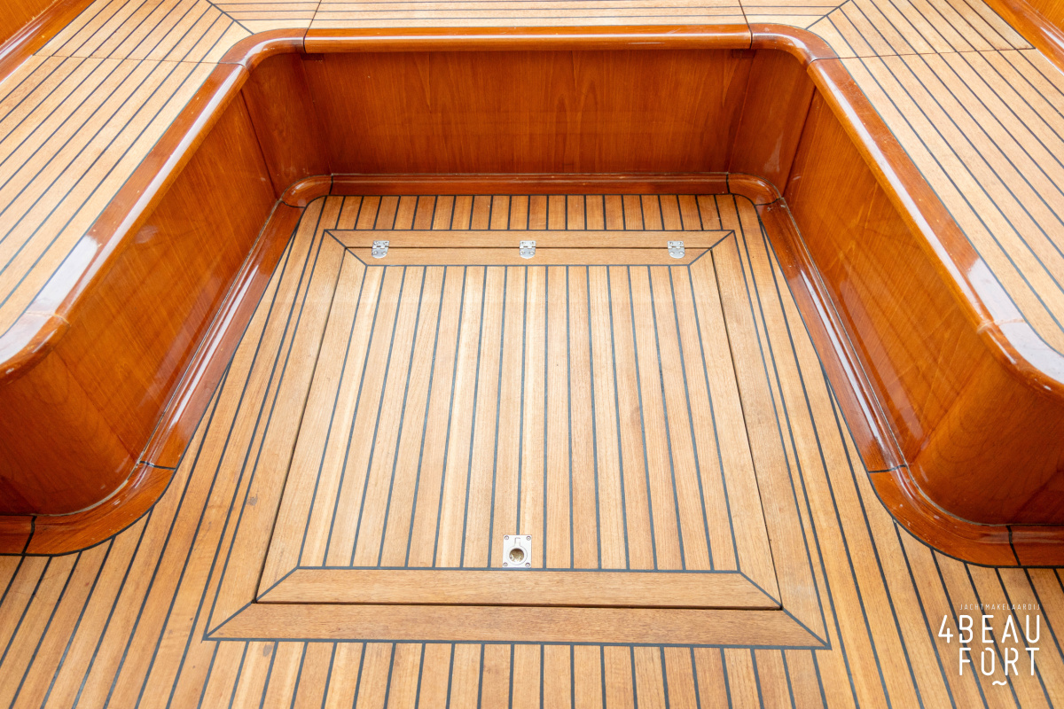 Via de vier openslaande houten deuren loop je zo de open kuip in; wanneer de deuren openstaan ontstaat één grote, lichte ruimte waarin binnen en buiten naadloos in elkaar overvloeien. De zelflozende kuip is volledig met teak belegd en biedt een ruime U-bank met bergruimte, terwijl de kelder onder de vloer volop plek heeft voor bijvoorbeeld vouwfietsen. Rondom het schip zijn brede gangboorden met teakhout en een RVS-reling die ter hoogte van de kuip is afgewerkt met teakhout.