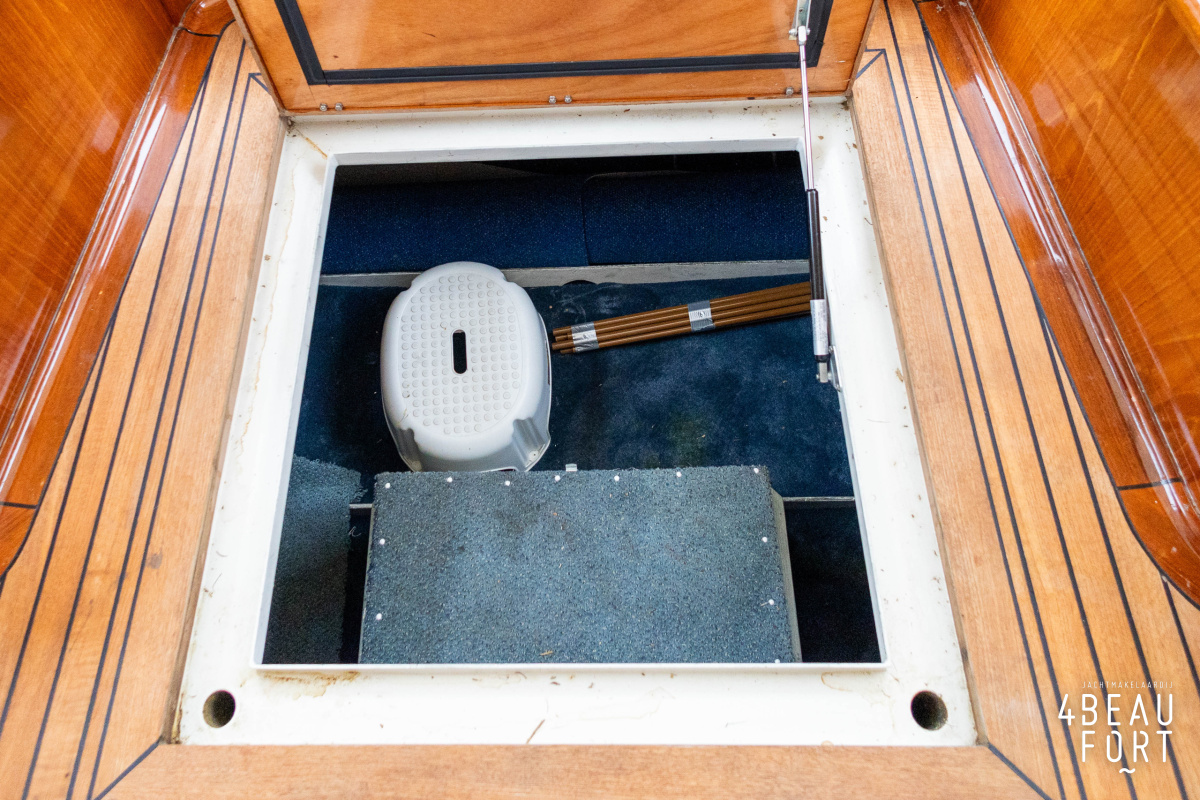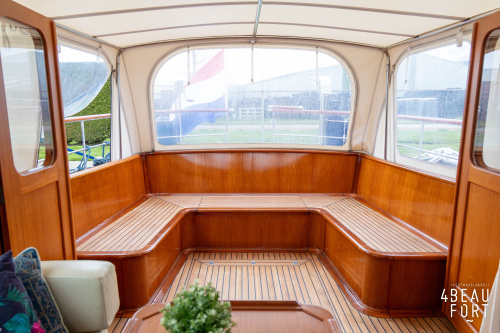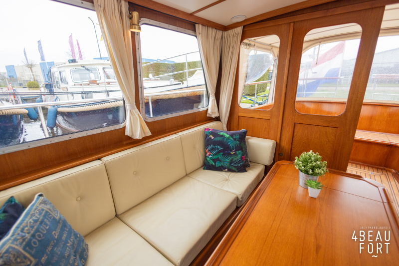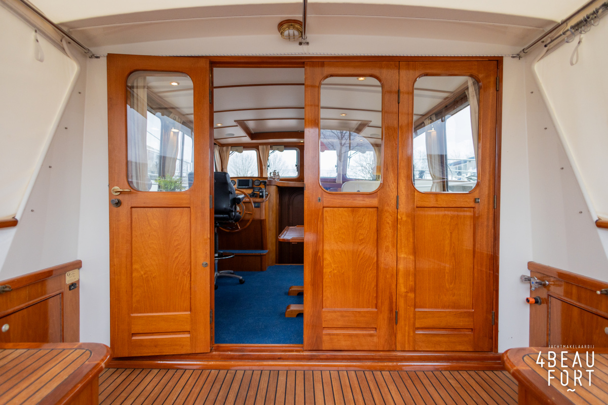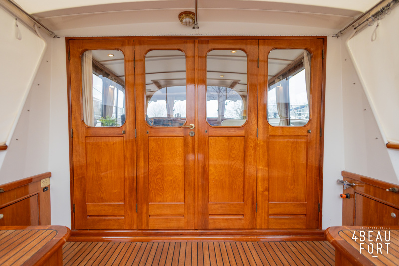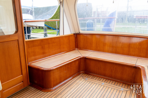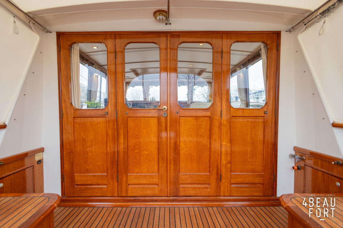 Via de vier openslaande houten deuren loop je zo de open kuip in; wanneer de deuren openstaan ontstaat één grote, lichte ruimte waarin binnen en buiten naadloos in elkaar overvloeien. De zelflozende kuip is volledig met teak belegd en biedt een ruime U-bank met bergruimte, terwijl de kelder onder de vloer volop plek heeft voor bijvoorbeeld vouwfietsen. Rondom het schip zijn brede gangboorden met teakhout en een RVS-reling die ter hoogte van de kuip is afgewerkt met teakhout.