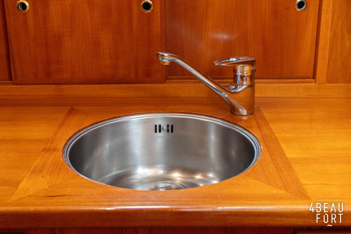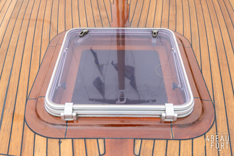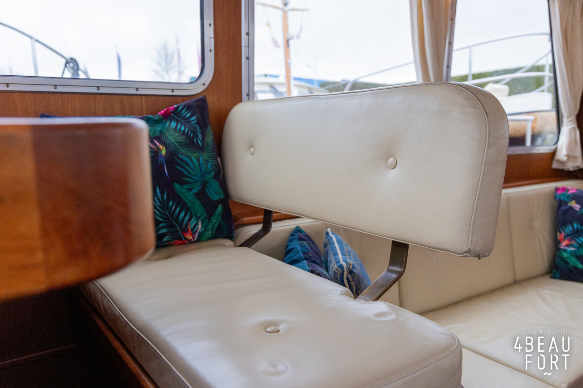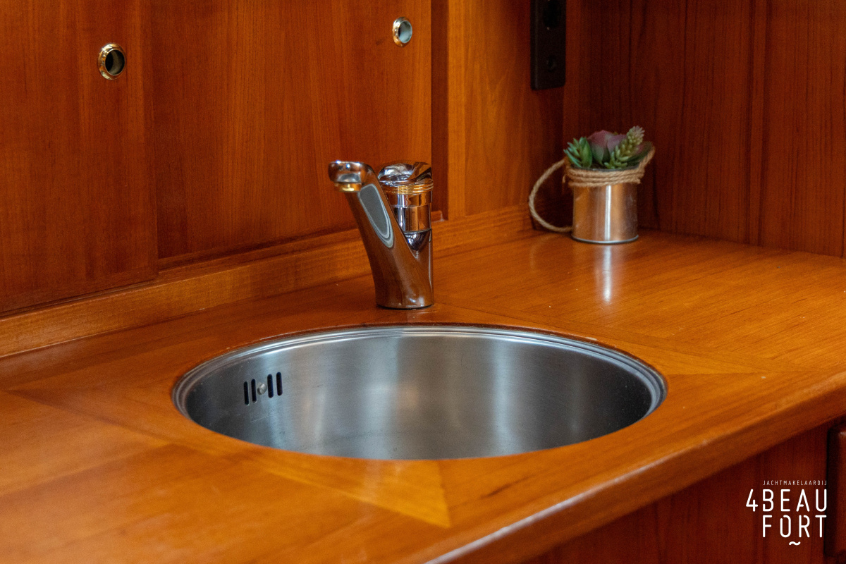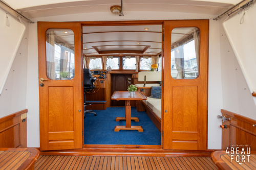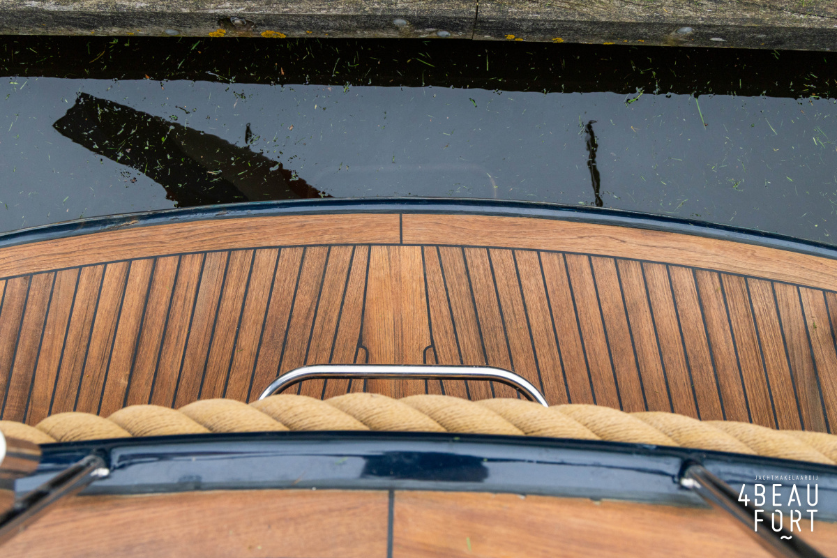 Via de vier openslaande houten deuren loop je zo de open kuip in; wanneer de deuren openstaan ontstaat één grote, lichte ruimte waarin binnen en buiten naadloos in elkaar overvloeien. De zelflozende kuip is volledig met teak belegd en biedt een ruime U-bank met bergruimte, terwijl de kelder onder de vloer volop plek heeft voor bijvoorbeeld vouwfietsen. Rondom het schip zijn brede gangboorden met teakhout en een RVS-reling die ter hoogte van de kuip is afgewerkt met teakhout.