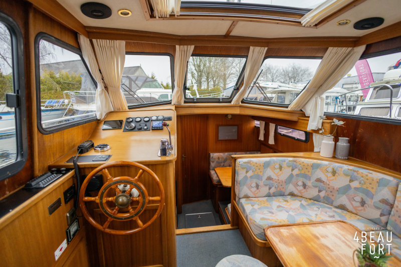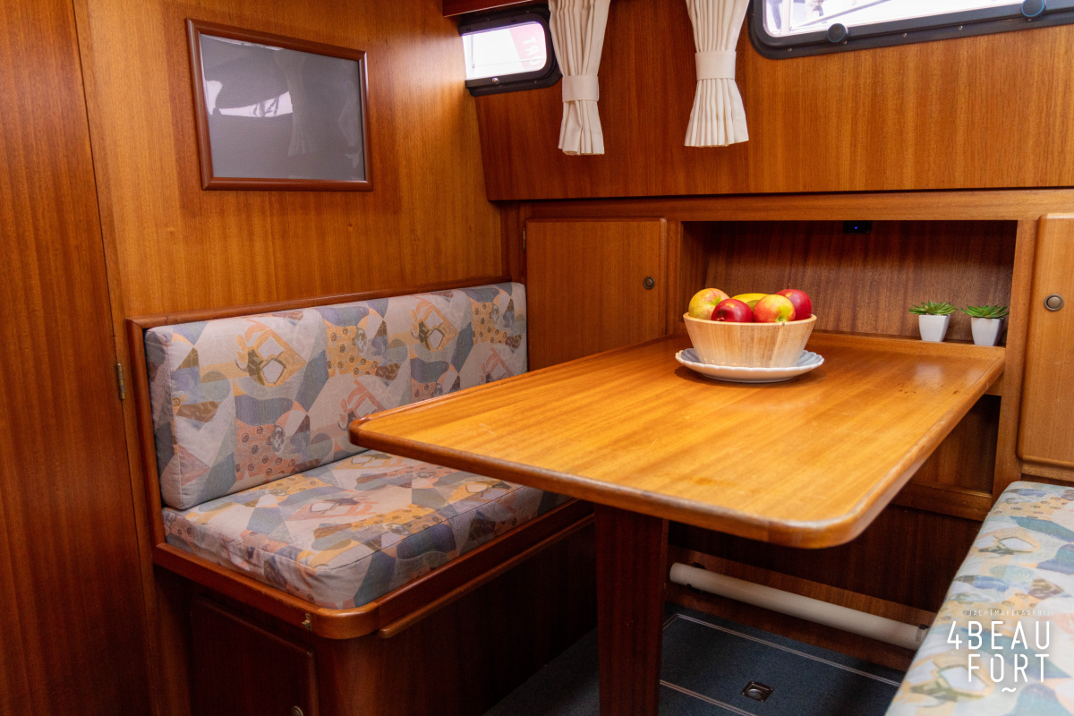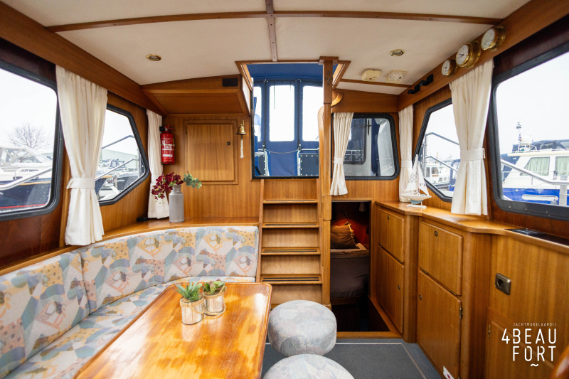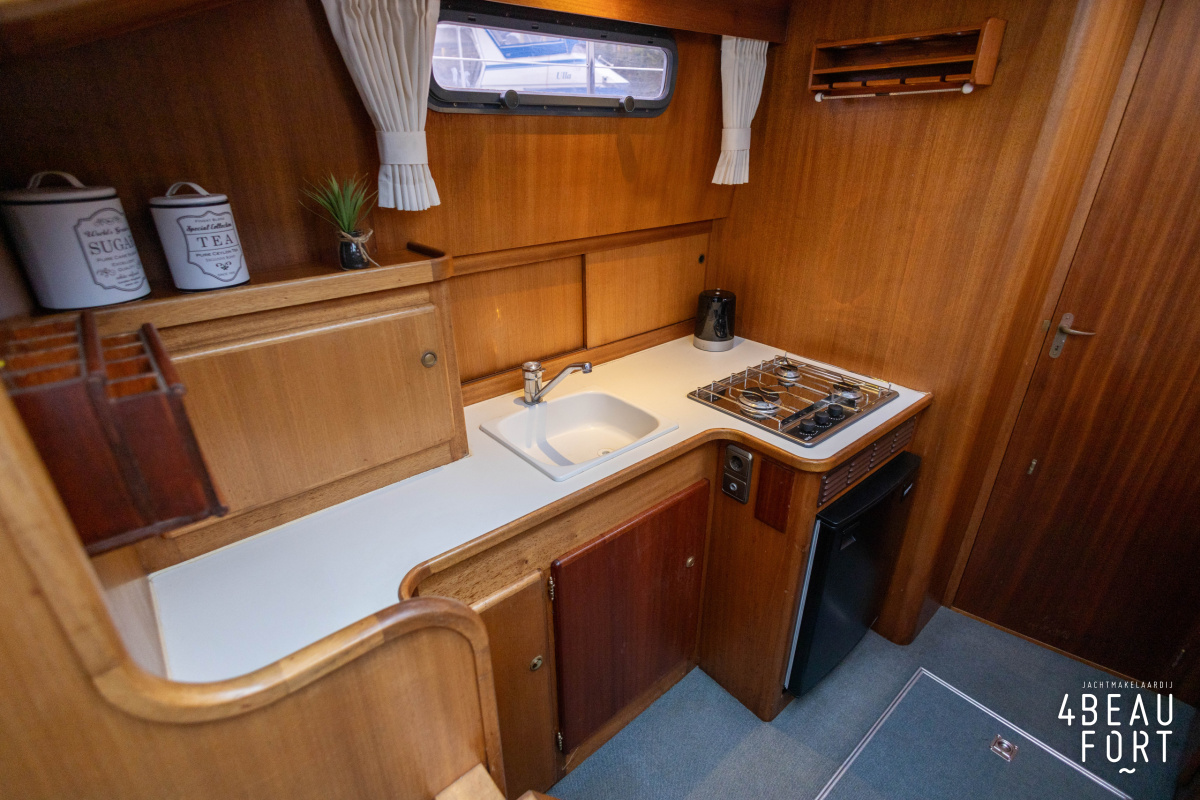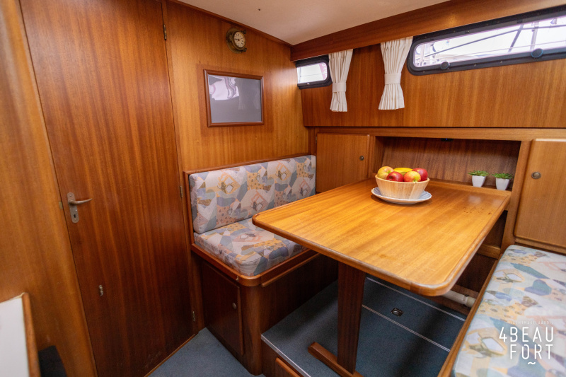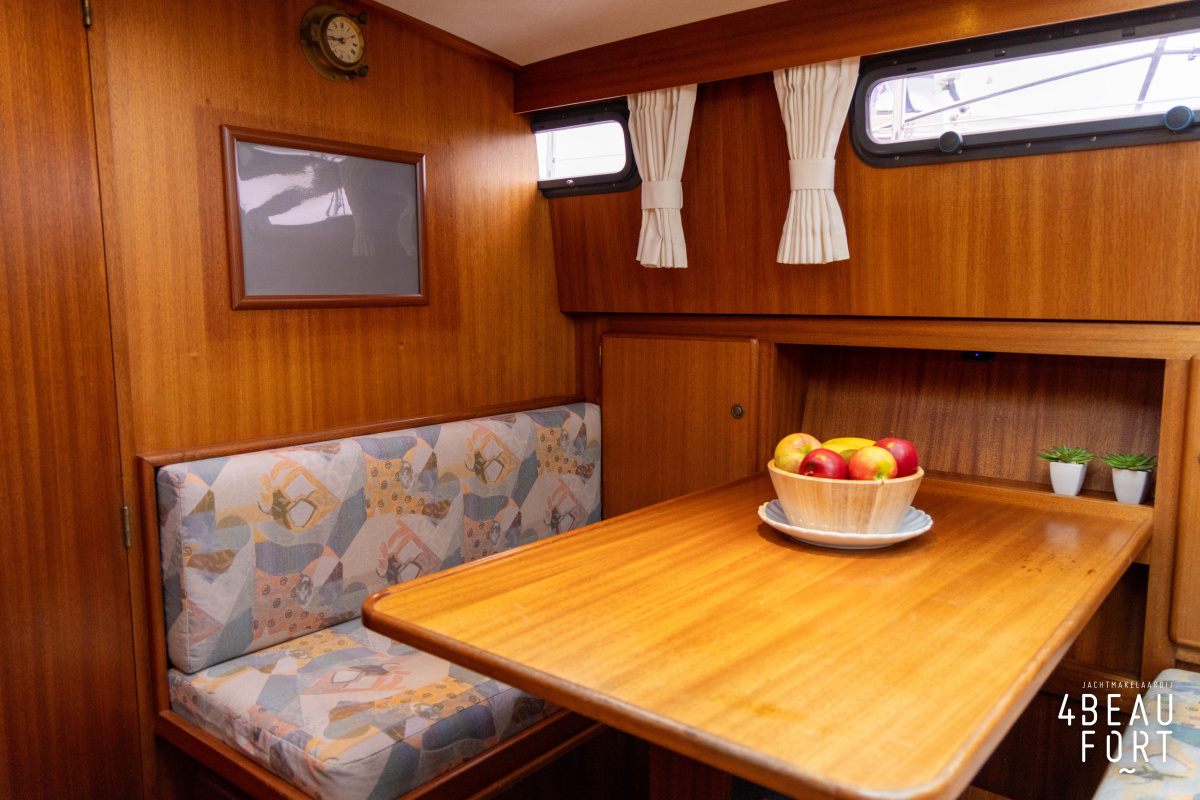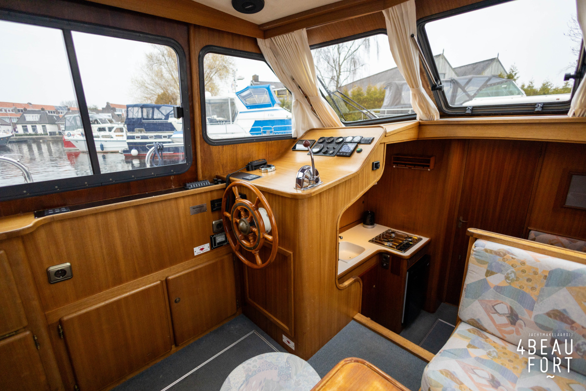 In het voorschip bevindt zich een ruime cabine met een ruim, comfortabel stapelbed en een aparte toiletruimte met wastafel en elektrisch toilet. De kombuis is voorzien van een werkblad met spoelbak, een 3‑pits gaskooktoestel, koelkast en veel kastruimte, tegenover de kombuis is de dinette die tevens als extra slaapplaats kan dienen. De salon heeft een U‑bank met bergruimte, een kastenwand en de binnenstuurstand. In het achterschip ligt de eigenaarscabine met een semivrijstaand bed en een badkamer met wastafelmeubel, elektrisch toilet en douchecabine. De buitenstuurstand is uitgerust met recente navigatieapparatuur en is volledig overdekt door een zeer recente tent die aan alle zijden geopend kan worden. Voor eenvoudig manoeuvreren is het jacht uitgerust met een krachtige Volvo Penta van 150 pk en een boegschroef.