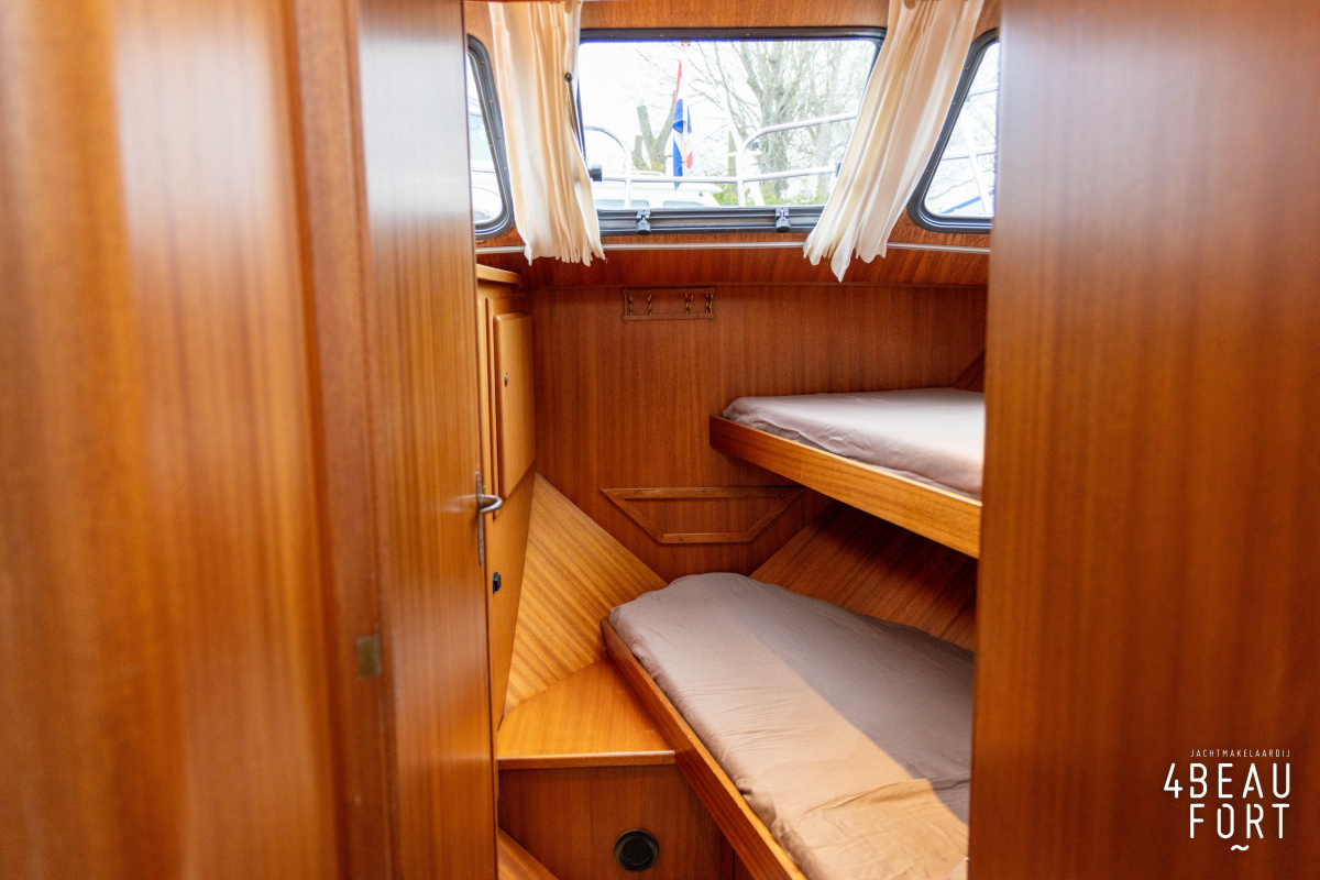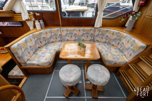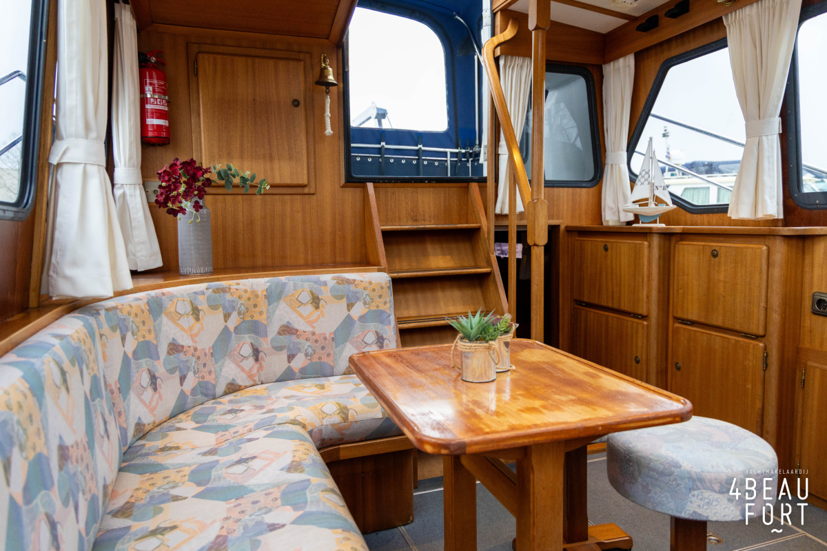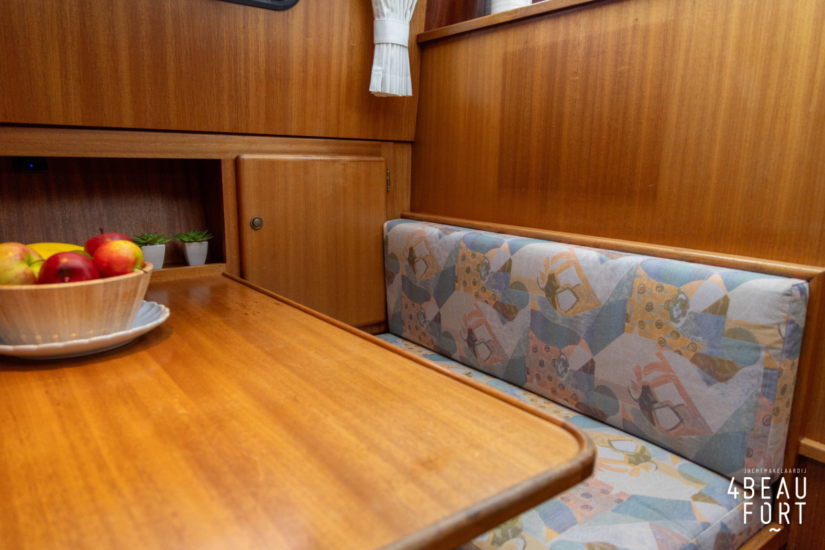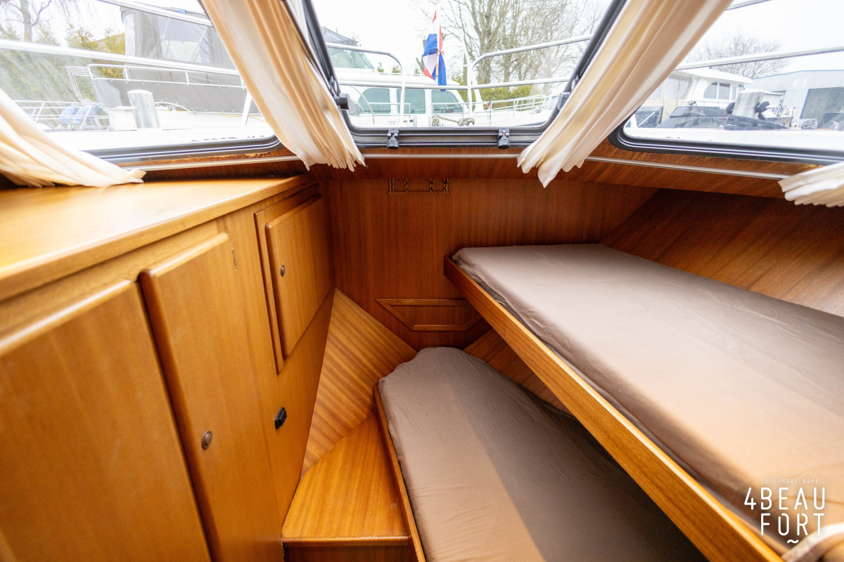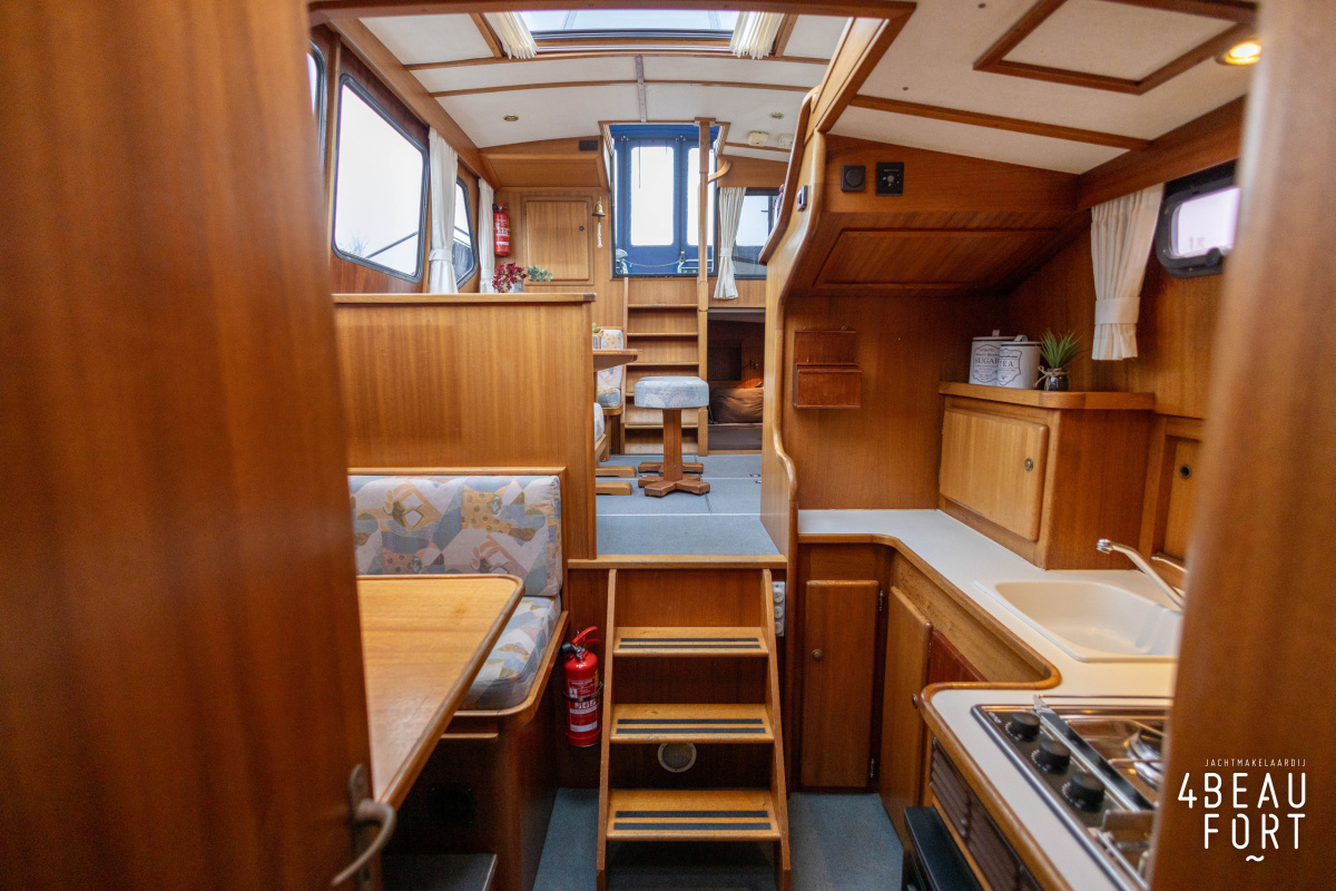 In het voorschip bevindt zich een ruime cabine met een ruim, comfortabel stapelbed en een aparte toiletruimte met wastafel en elektrisch toilet. De kombuis is voorzien van een werkblad met spoelbak, een 3‑pits gaskooktoestel, koelkast en veel kastruimte, tegenover de kombuis is de dinette die tevens als extra slaapplaats kan dienen. De salon heeft een U‑bank met bergruimte, een kastenwand en de binnenstuurstand. In het achterschip ligt de eigenaarscabine met een semivrijstaand bed en een badkamer met wastafelmeubel, elektrisch toilet en douchecabine. De buitenstuurstand is uitgerust met recente navigatieapparatuur en is volledig overdekt door een zeer recente tent die aan alle zijden geopend kan worden. Voor eenvoudig manoeuvreren is het jacht uitgerust met een krachtige Volvo Penta van 150 pk en een boegschroef.