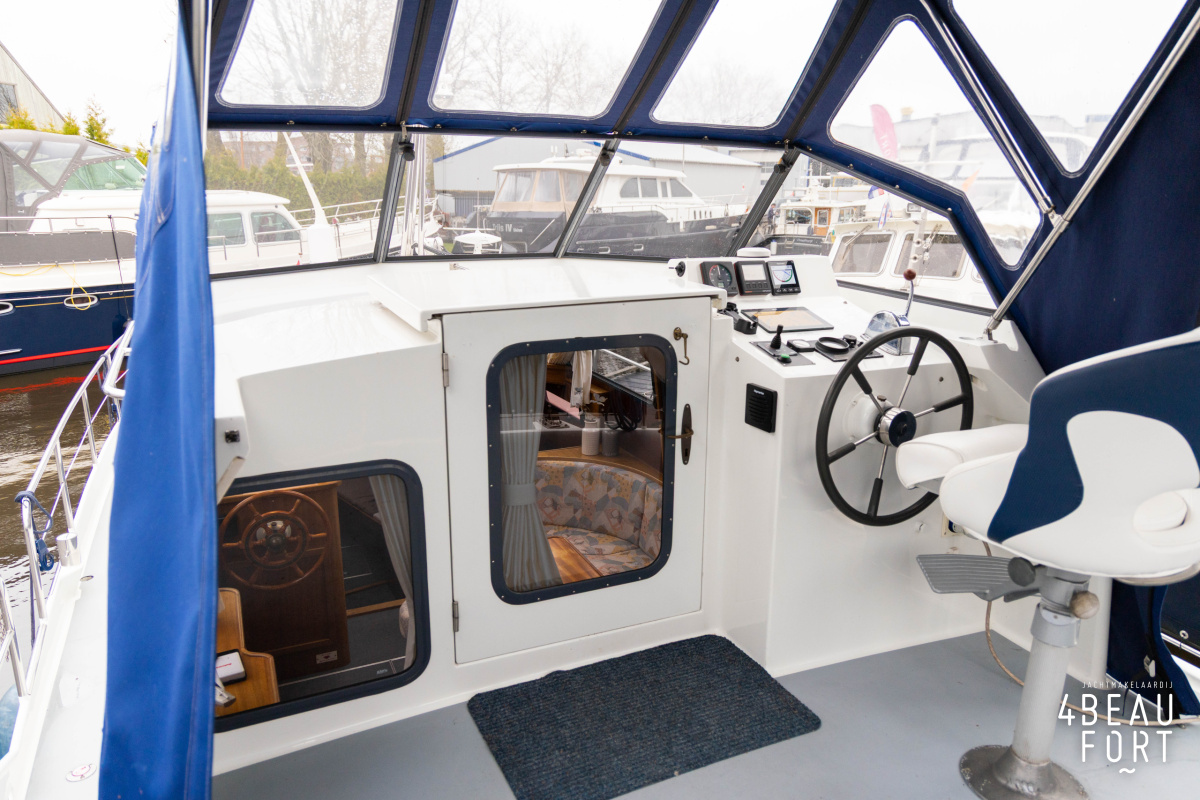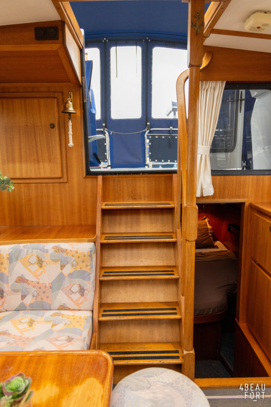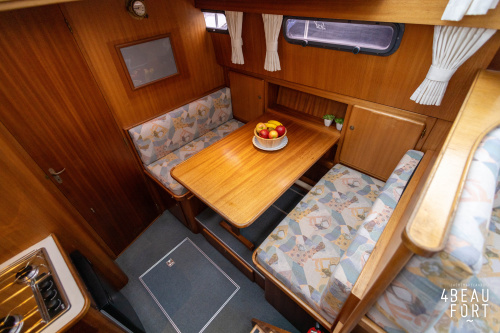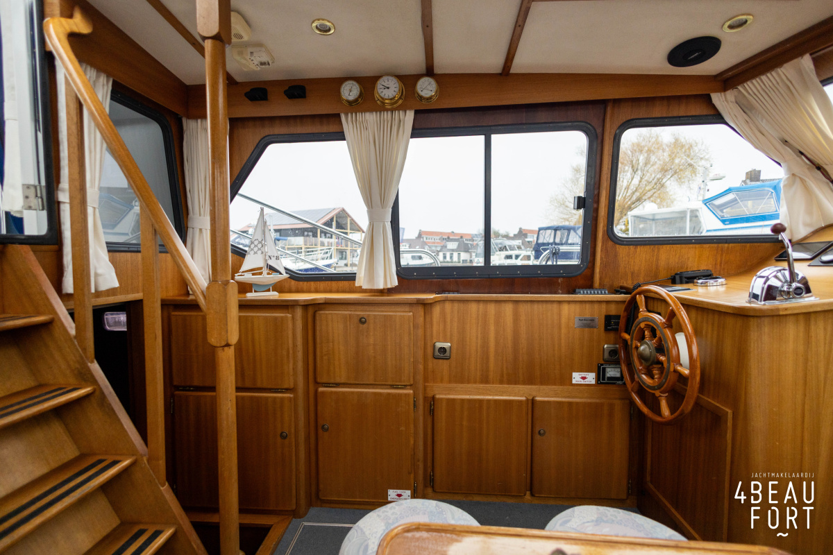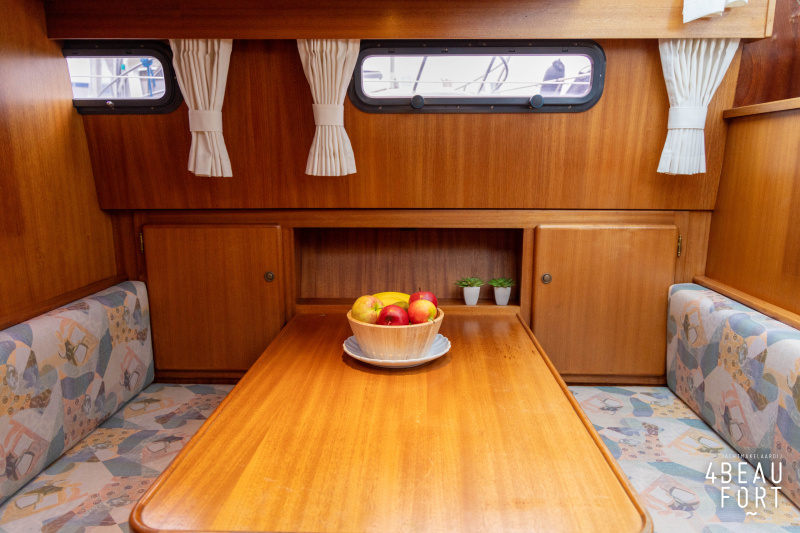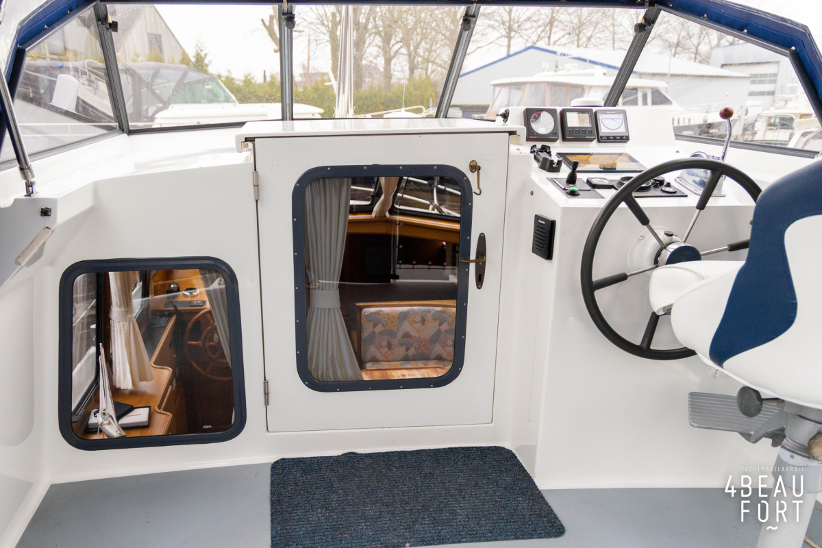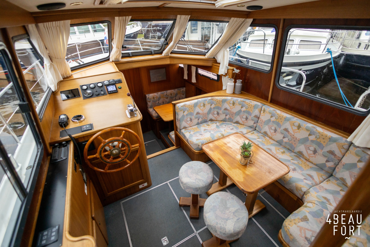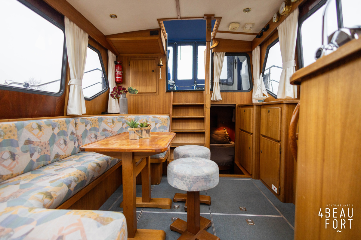 In het voorschip bevindt zich een ruime cabine met een ruim, comfortabel stapelbed en een aparte toiletruimte met wastafel en elektrisch toilet. De kombuis is voorzien van een werkblad met spoelbak, een 3‑pits gaskooktoestel, koelkast en veel kastruimte, tegenover de kombuis is de dinette die tevens als extra slaapplaats kan dienen. De salon heeft een U‑bank met bergruimte, een kastenwand en de binnenstuurstand. In het achterschip ligt de eigenaarscabine met een semivrijstaand bed en een badkamer met wastafelmeubel, elektrisch toilet en douchecabine. De buitenstuurstand is uitgerust met recente navigatieapparatuur en is volledig overdekt door een zeer recente tent die aan alle zijden geopend kan worden. Voor eenvoudig manoeuvreren is het jacht uitgerust met een krachtige Volvo Penta van 150 pk en een boegschroef.