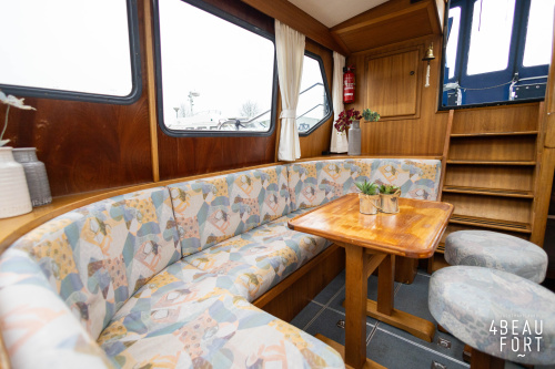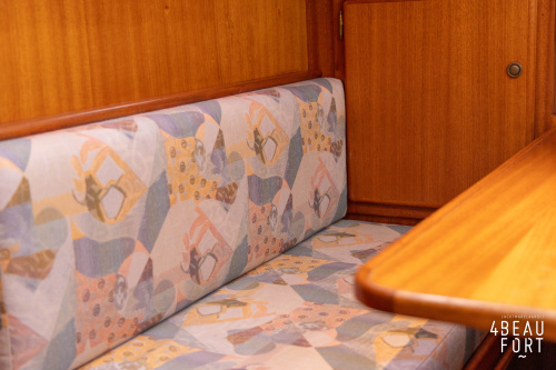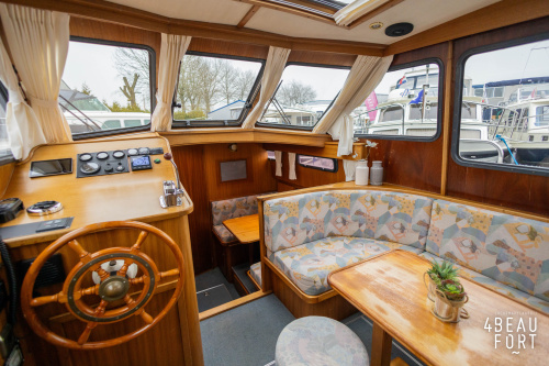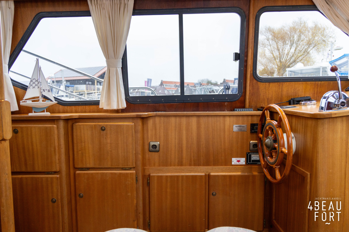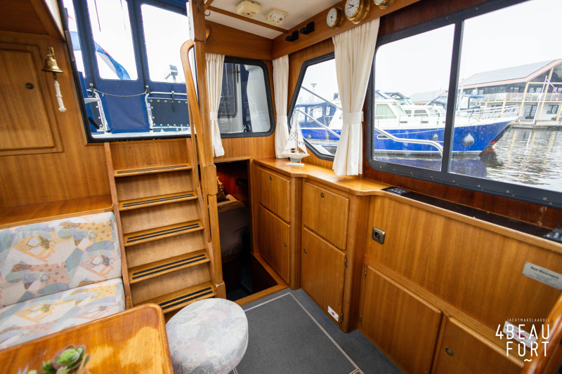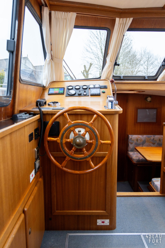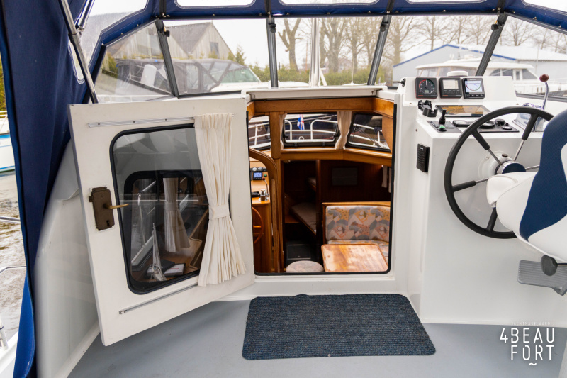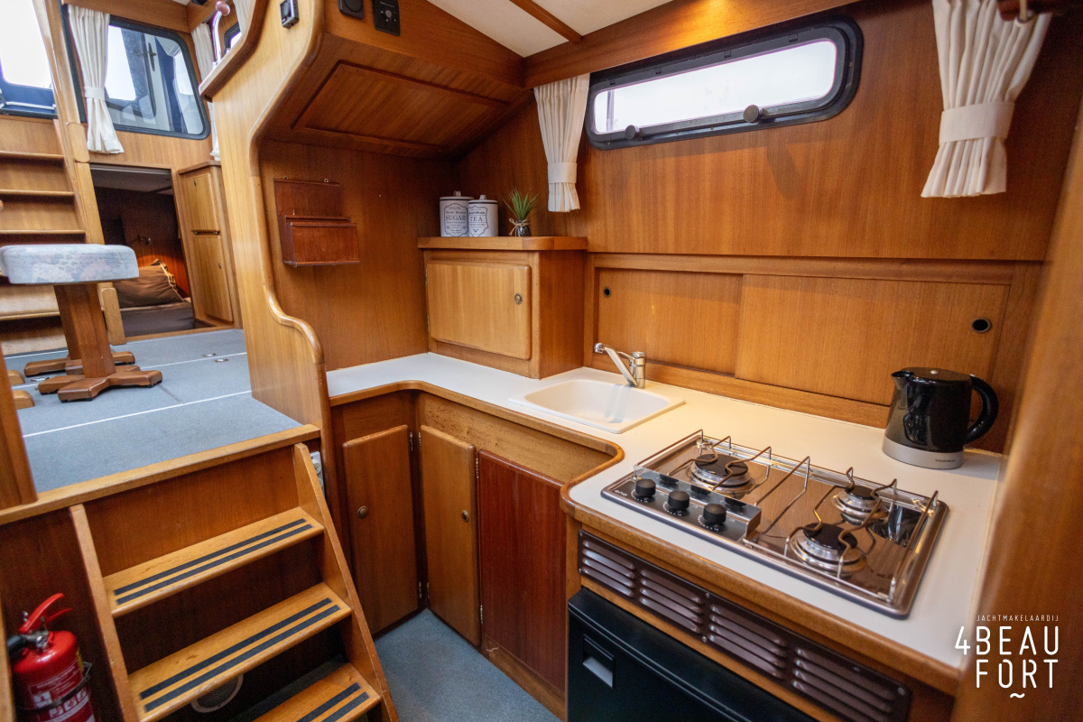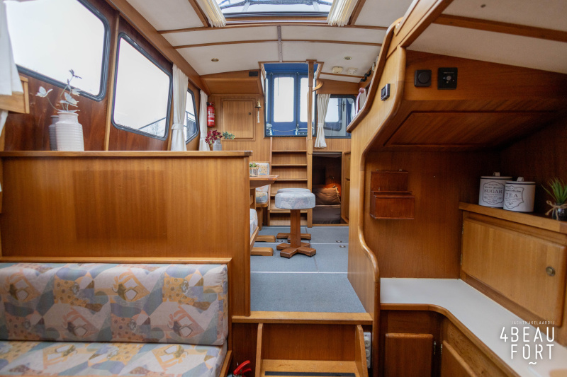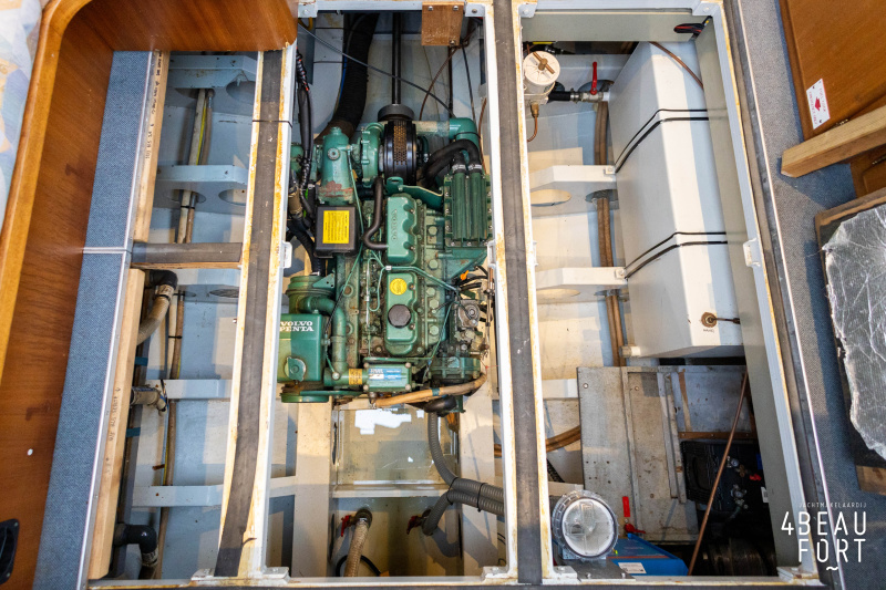 In het voorschip bevindt zich een ruime cabine met een ruim, comfortabel stapelbed en een aparte toiletruimte met wastafel en elektrisch toilet. De kombuis is voorzien van een werkblad met spoelbak, een 3‑pits gaskooktoestel, koelkast en veel kastruimte, tegenover de kombuis is de dinette die tevens als extra slaapplaats kan dienen. De salon heeft een U‑bank met bergruimte, een kastenwand en de binnenstuurstand. In het achterschip ligt de eigenaarscabine met een semivrijstaand bed en een badkamer met wastafelmeubel, elektrisch toilet en douchecabine. De buitenstuurstand is uitgerust met recente navigatieapparatuur en is volledig overdekt door een zeer recente tent die aan alle zijden geopend kan worden. Voor eenvoudig manoeuvreren is het jacht uitgerust met een krachtige Volvo Penta van 150 pk en een boegschroef.