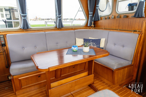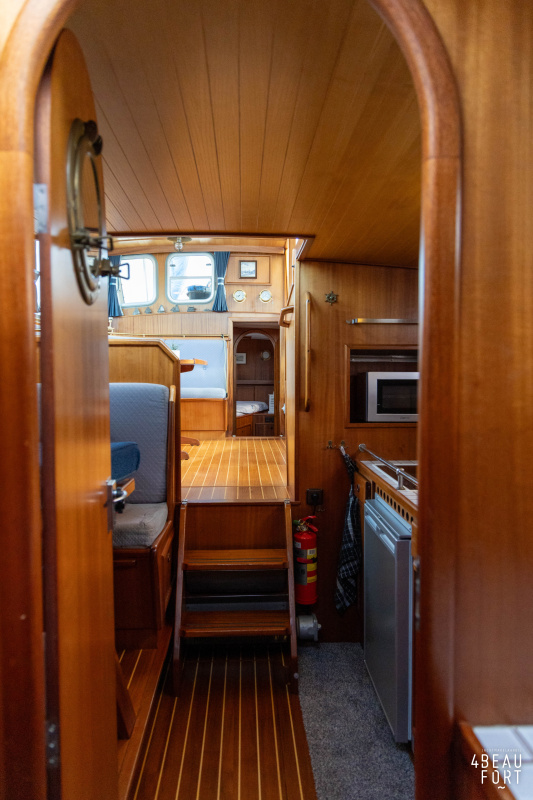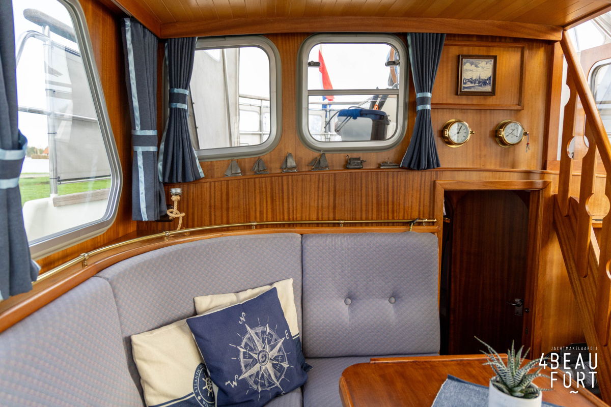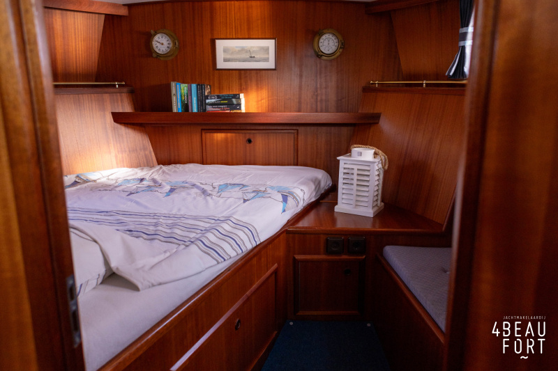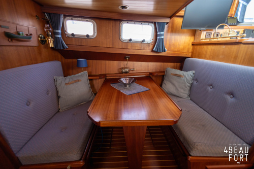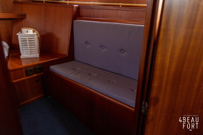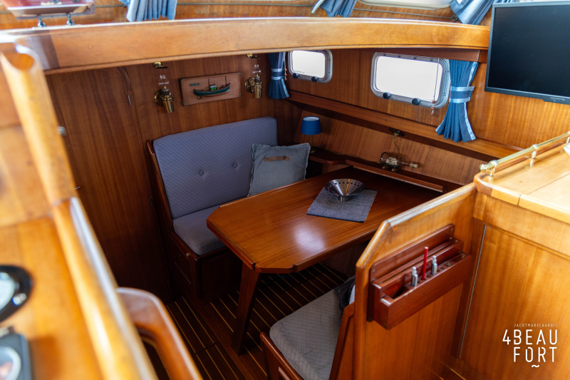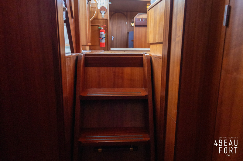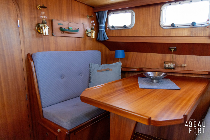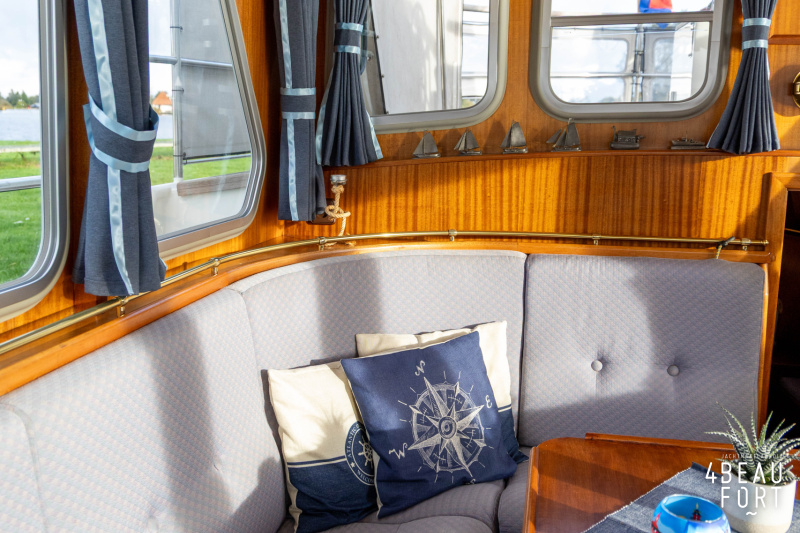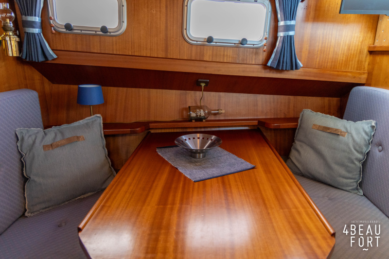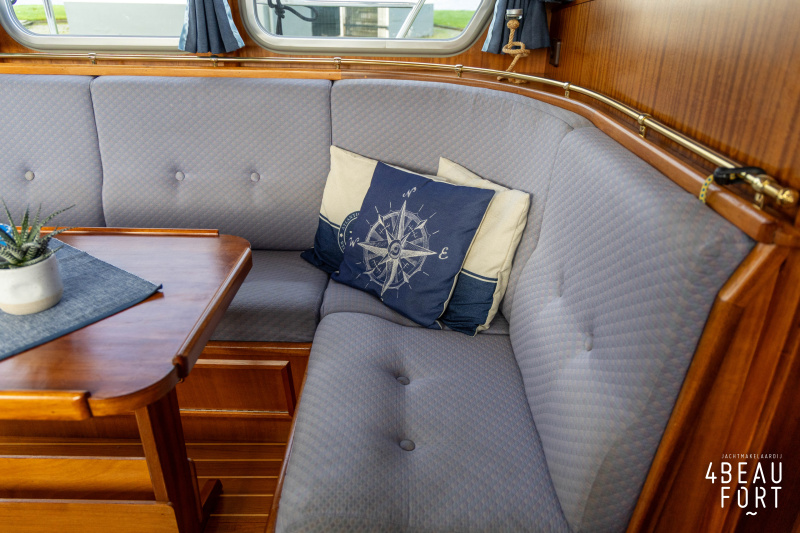 Het mahoniehouten interieur is doorgevoerd in zachte, ronde vormen die in elke ruimte terugkomen. Vanaf het achterdek loopt u aan bakboord via een trap naar de salon, waar zich een L-vormige bank, een kastenwand, de binnenstuurstand en een kaartentafel bevinden. In het voorschip bevinden zich de goed uitgeruste kombuis met tegenoverliggende dinette en de gastencabines, met een ruim V-bed, kastruimte en een wastafelmeubel. In het achterschip is de ruime eigenaarshut met tweepersoonsbed, een zitbankje en een badkamer met toilet, wastafel en douche. Tegenover de badkamer is een grote kast gesitueerd.