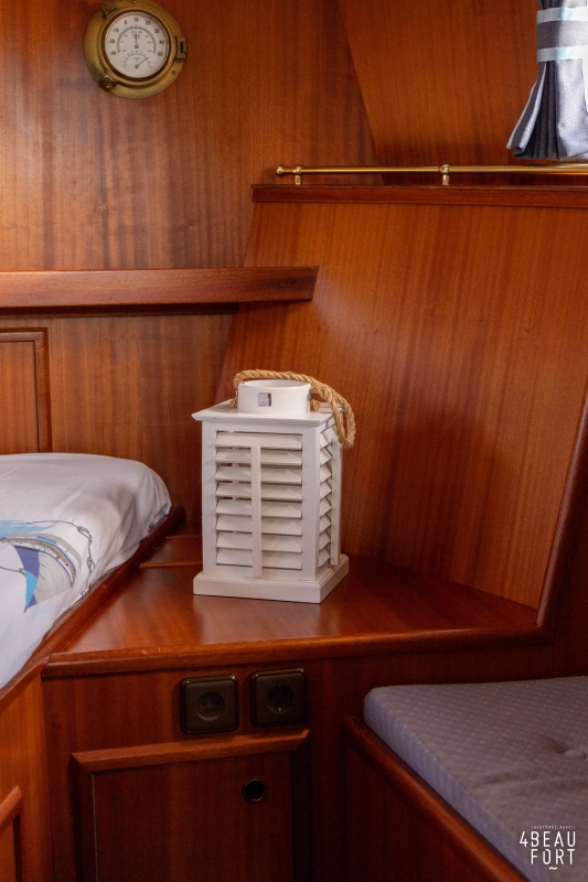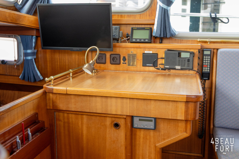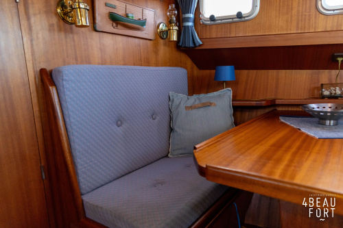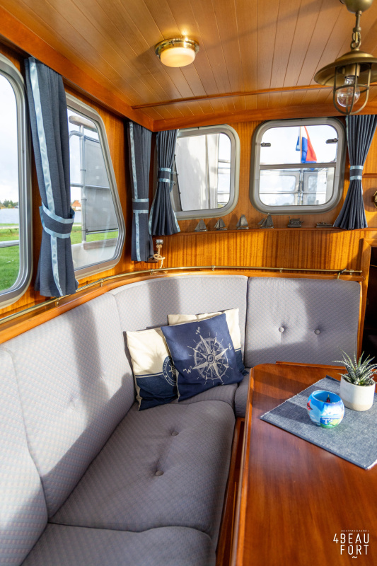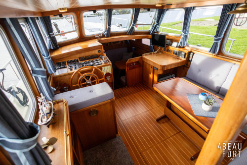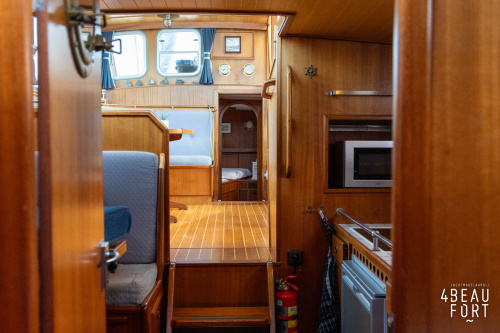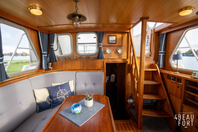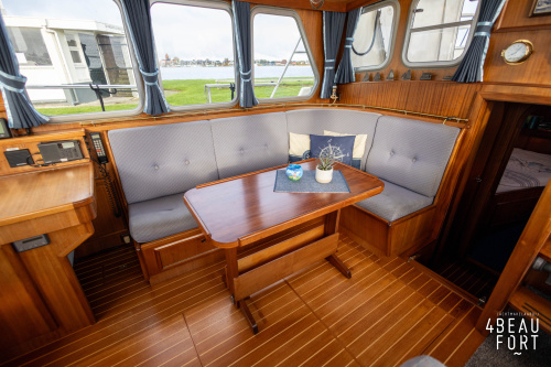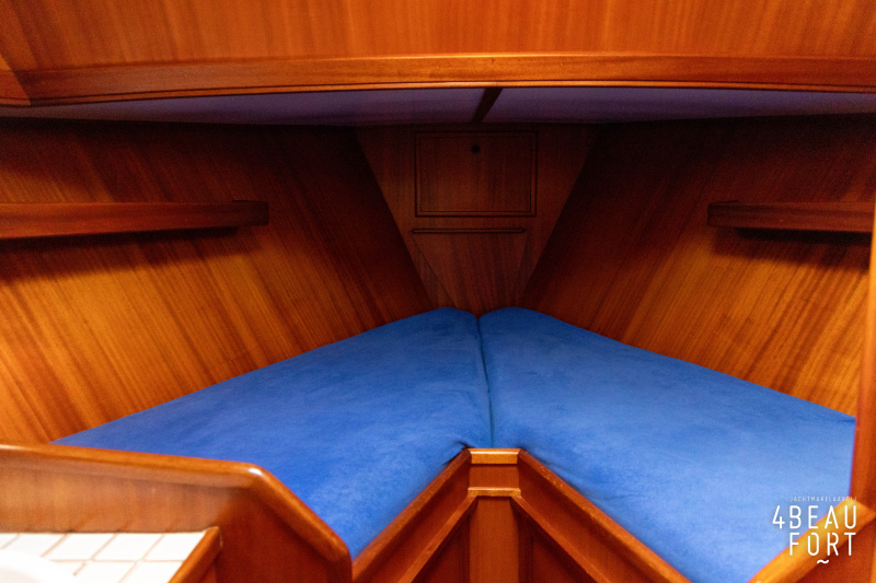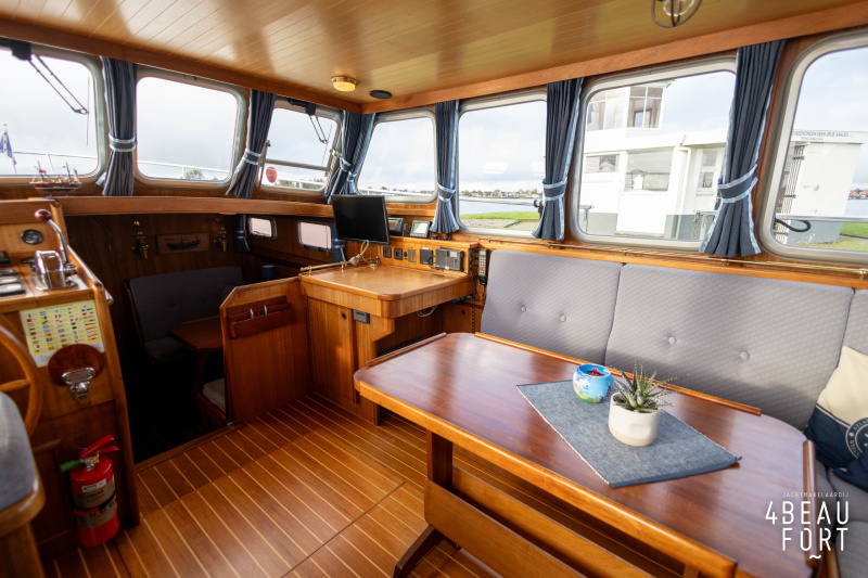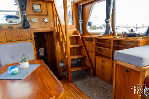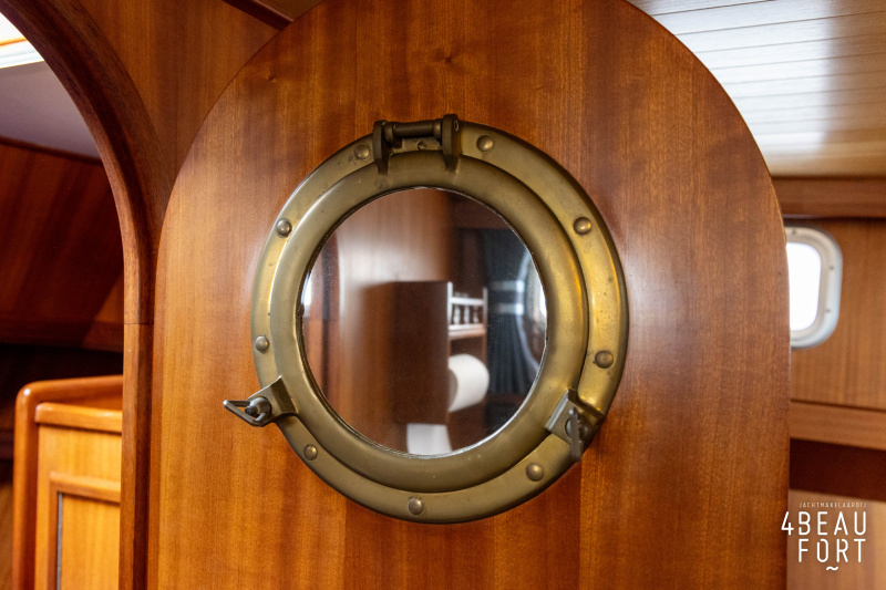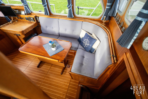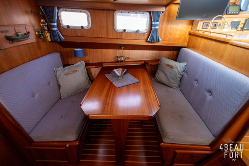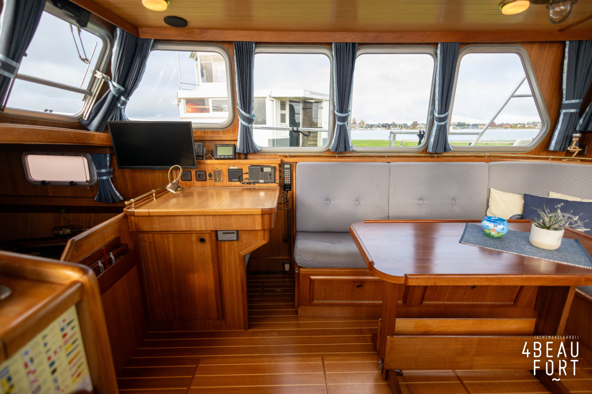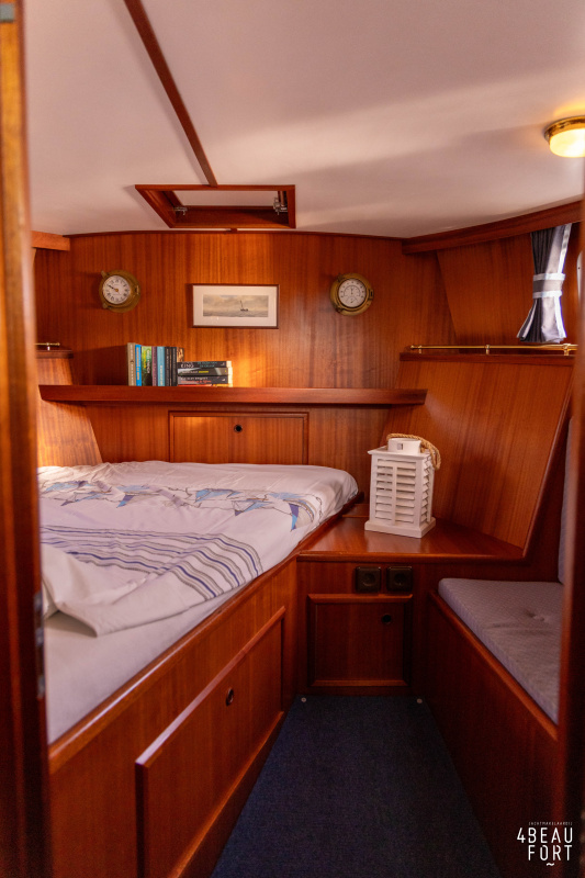 Het mahoniehouten interieur is doorgevoerd in zachte, ronde vormen die in elke ruimte terugkomen. Vanaf het achterdek loopt u aan bakboord via een trap naar de salon, waar zich een L-vormige bank, een kastenwand, de binnenstuurstand en een kaartentafel bevinden. In het voorschip bevinden zich de goed uitgeruste kombuis met tegenoverliggende dinette en de gastencabines, met een ruim V-bed, kastruimte en een wastafelmeubel. In het achterschip is de ruime eigenaarshut met tweepersoonsbed, een zitbankje en een badkamer met toilet, wastafel en douche. Tegenover de badkamer is een grote kast gesitueerd.