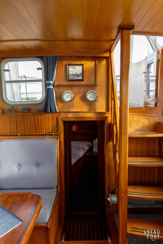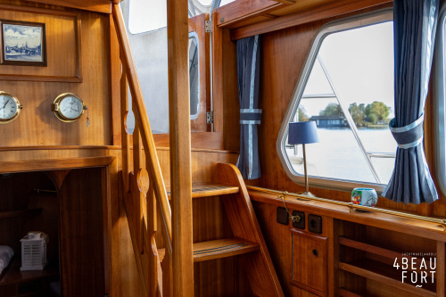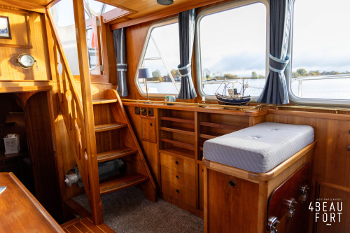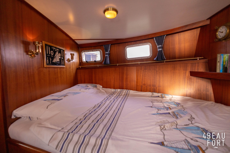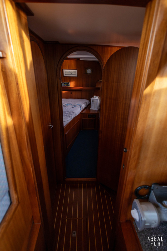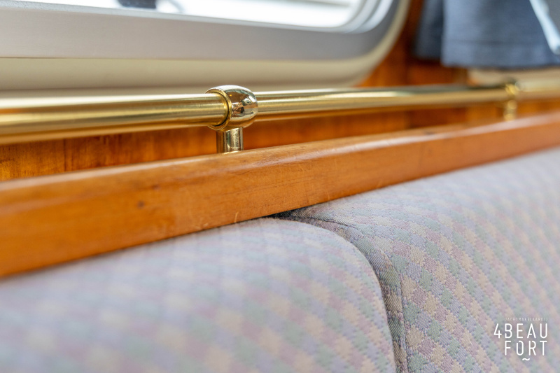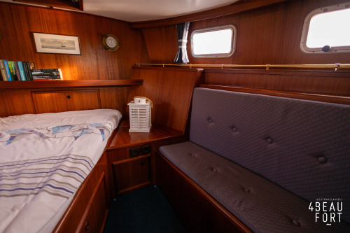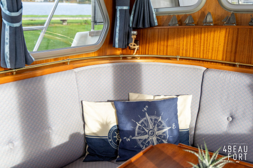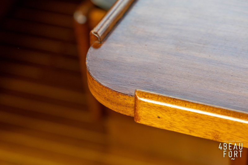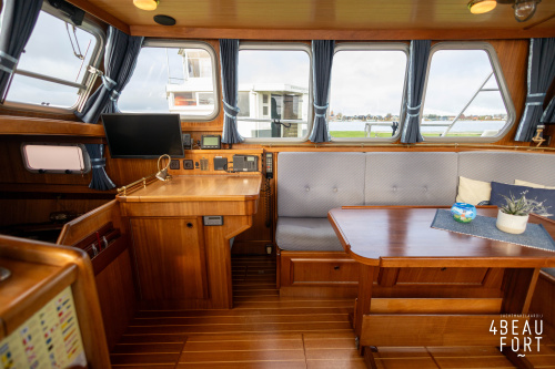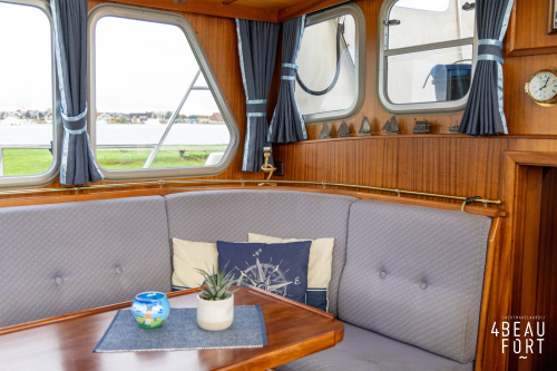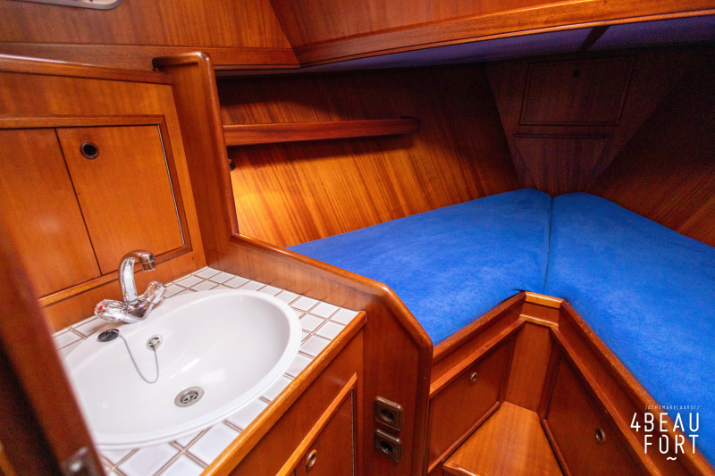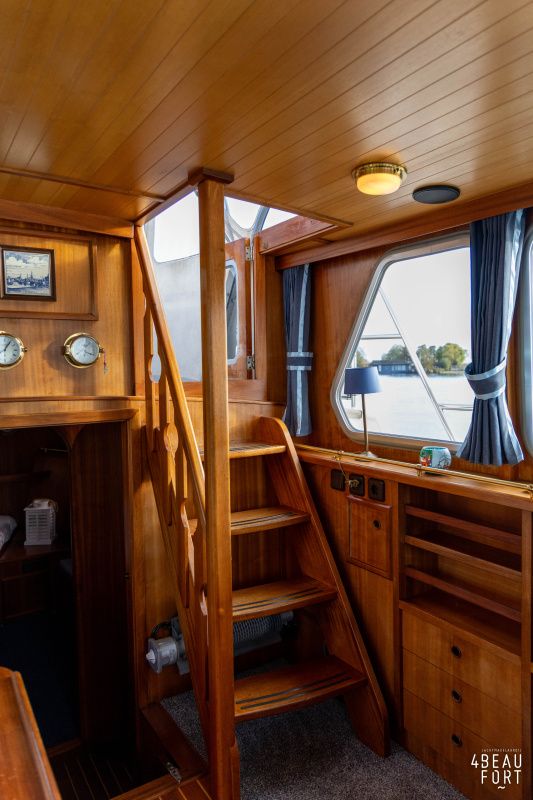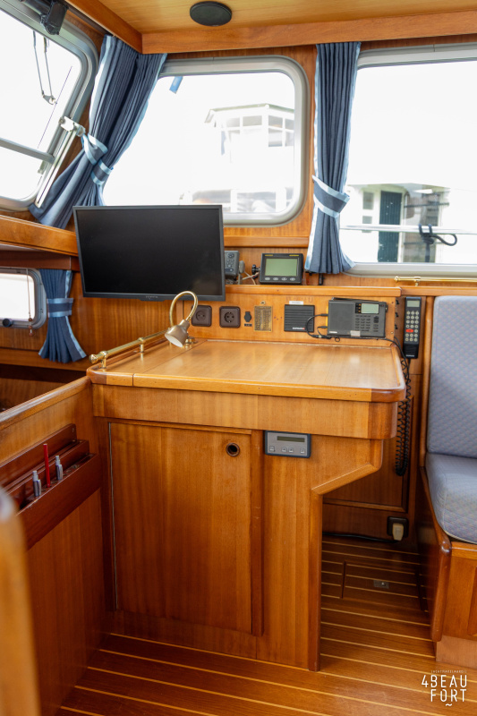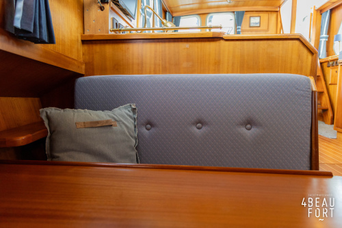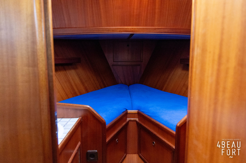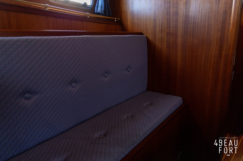 Het mahoniehouten interieur is doorgevoerd in zachte, ronde vormen die in elke ruimte terugkomen. Vanaf het achterdek loopt u aan bakboord via een trap naar de salon, waar zich een L-vormige bank, een kastenwand, de binnenstuurstand en een kaartentafel bevinden. In het voorschip bevinden zich de goed uitgeruste kombuis met tegenoverliggende dinette en de gastencabines, met een ruim V-bed, kastruimte en een wastafelmeubel. In het achterschip is de ruime eigenaarshut met tweepersoonsbed, een zitbankje en een badkamer met toilet, wastafel en douche. Tegenover de badkamer is een grote kast gesitueerd.