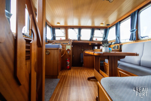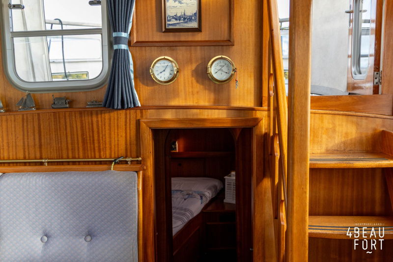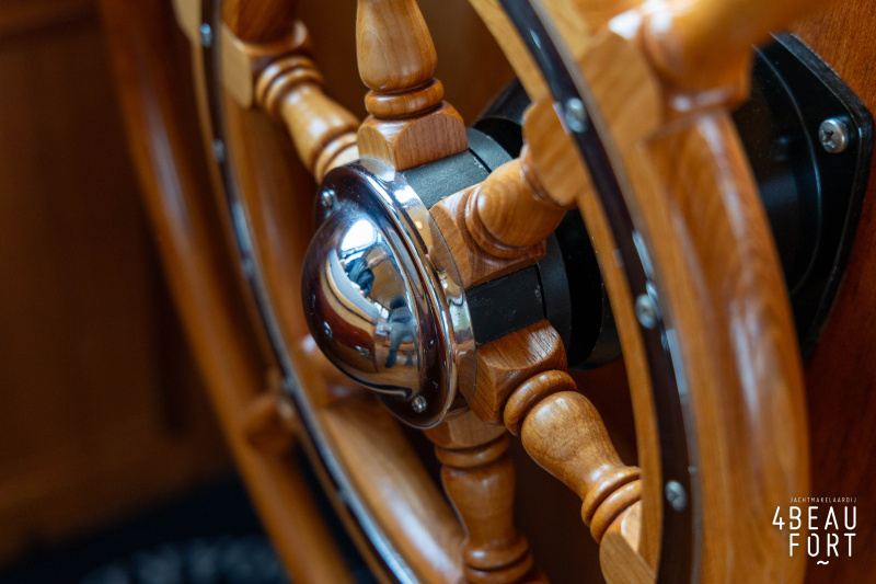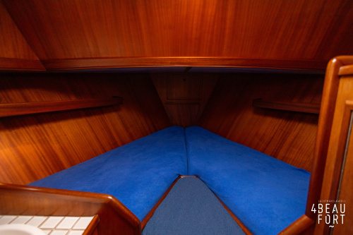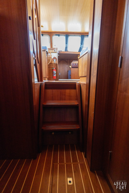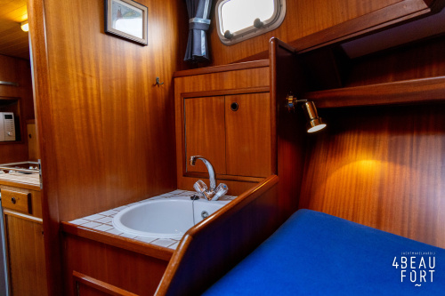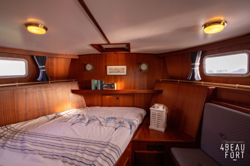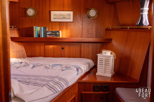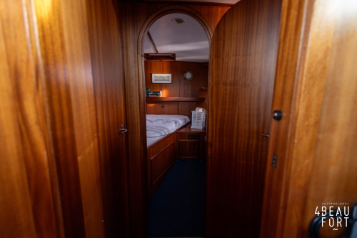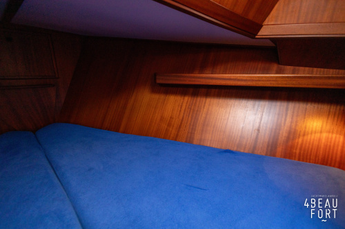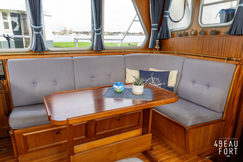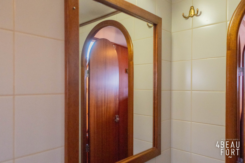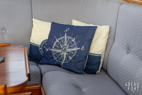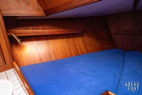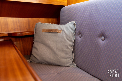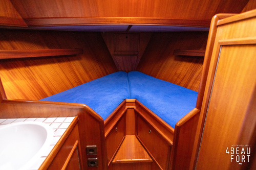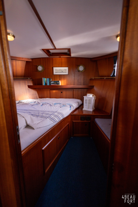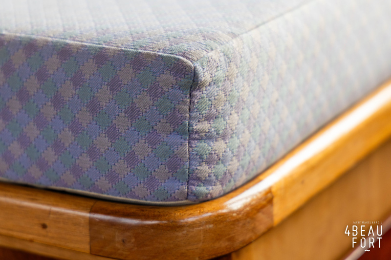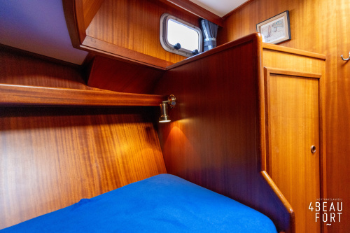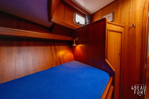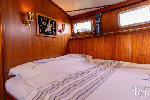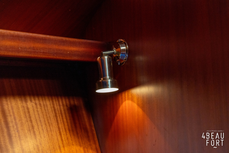 Het mahoniehouten interieur is doorgevoerd in zachte, ronde vormen die in elke ruimte terugkomen. Vanaf het achterdek loopt u aan bakboord via een trap naar de salon, waar zich een L-vormige bank, een kastenwand, de binnenstuurstand en een kaartentafel bevinden. In het voorschip bevinden zich de goed uitgeruste kombuis met tegenoverliggende dinette en de gastencabines, met een ruim V-bed, kastruimte en een wastafelmeubel. In het achterschip is de ruime eigenaarshut met tweepersoonsbed, een zitbankje en een badkamer met toilet, wastafel en douche. Tegenover de badkamer is een grote kast gesitueerd.