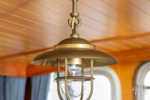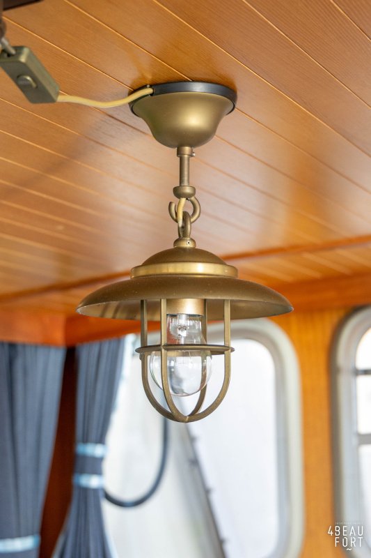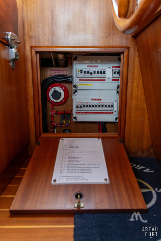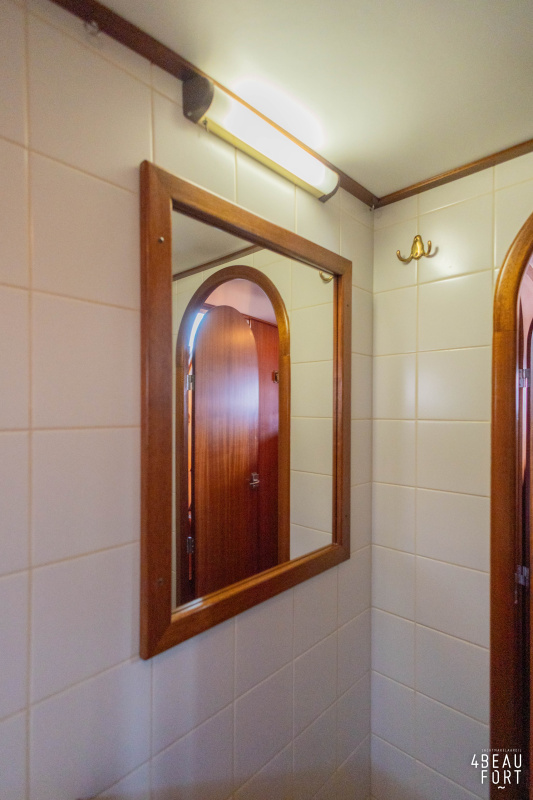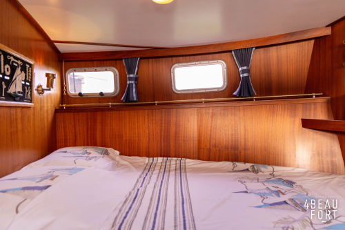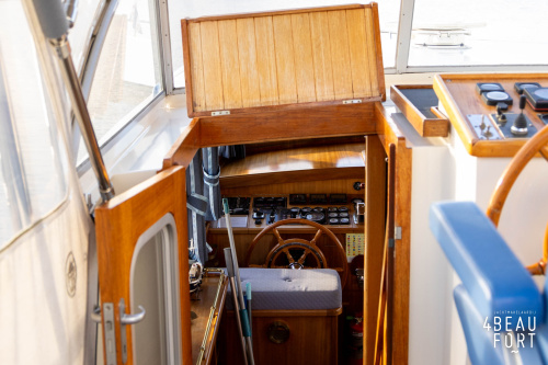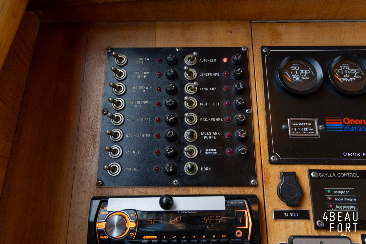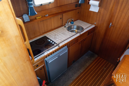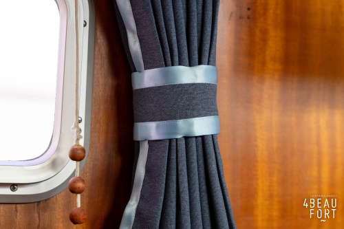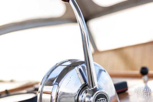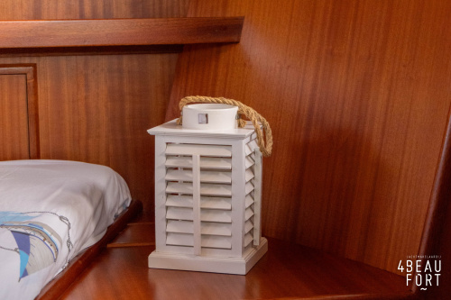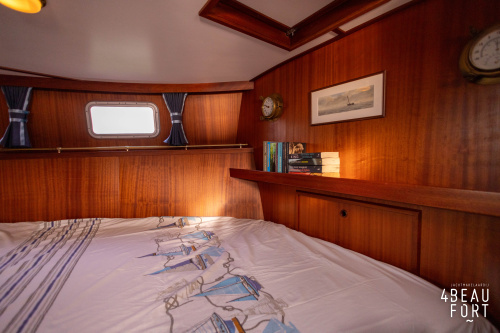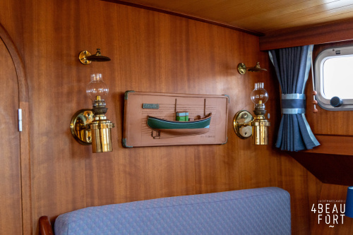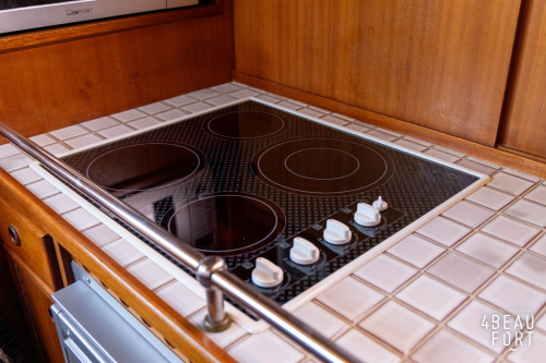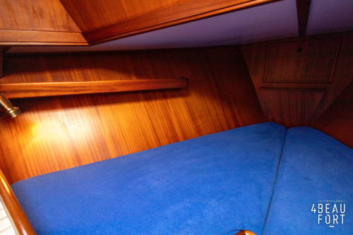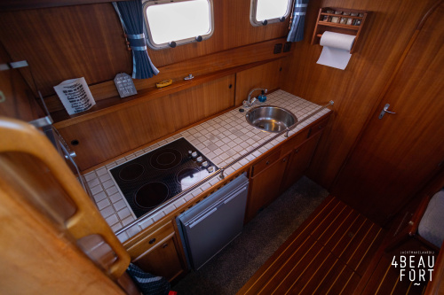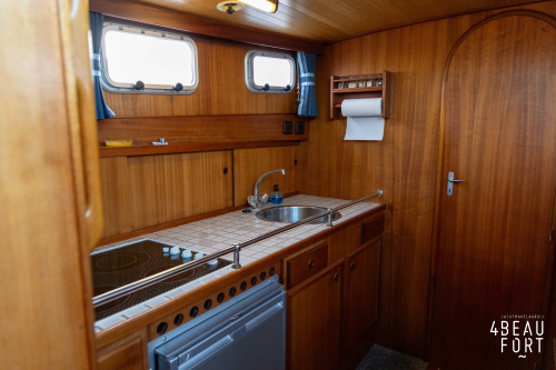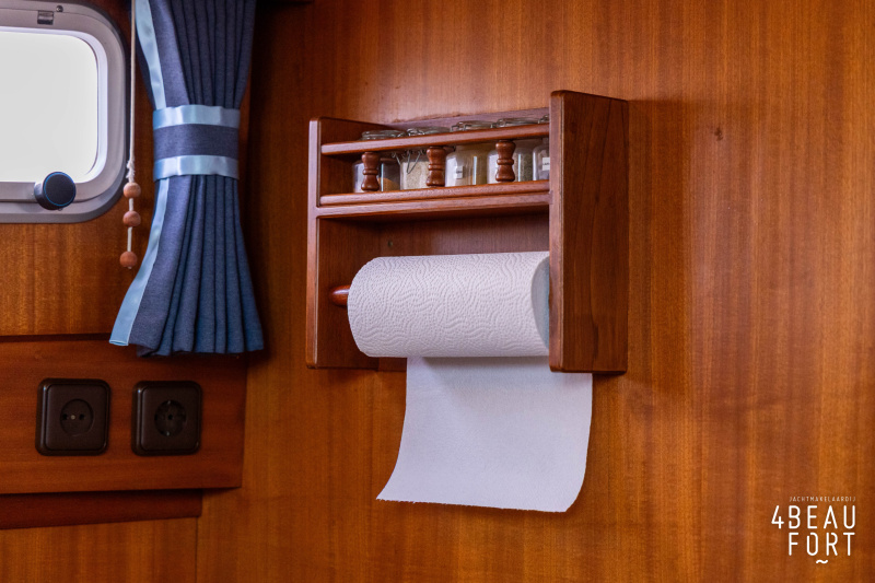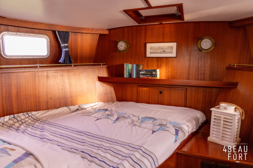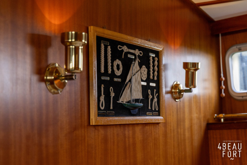 Het mahoniehouten interieur is doorgevoerd in zachte, ronde vormen die in elke ruimte terugkomen. Vanaf het achterdek loopt u aan bakboord via een trap naar de salon, waar zich een L-vormige bank, een kastenwand, de binnenstuurstand en een kaartentafel bevinden. In het voorschip bevinden zich de goed uitgeruste kombuis met tegenoverliggende dinette en de gastencabines, met een ruim V-bed, kastruimte en een wastafelmeubel. In het achterschip is de ruime eigenaarshut met tweepersoonsbed, een zitbankje en een badkamer met toilet, wastafel en douche. Tegenover de badkamer is een grote kast gesitueerd.
