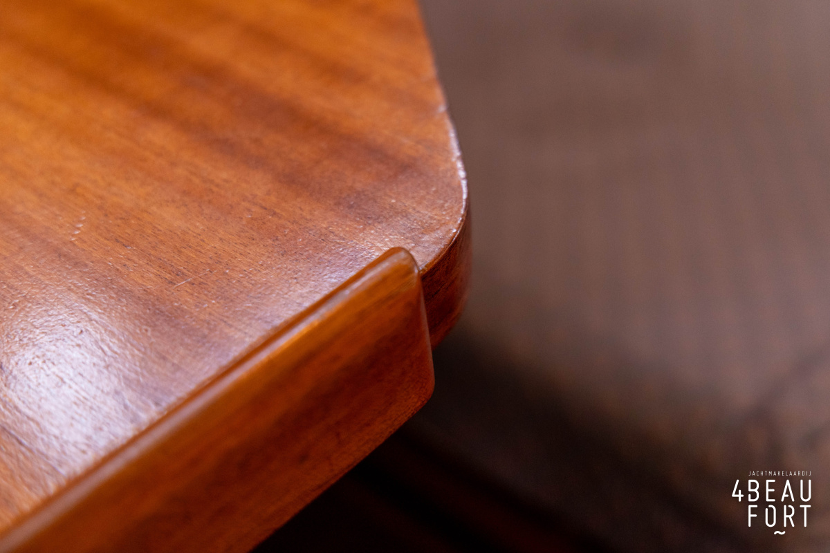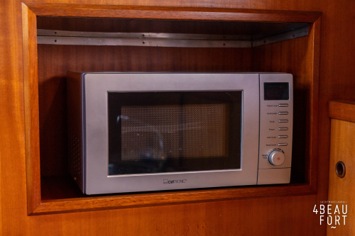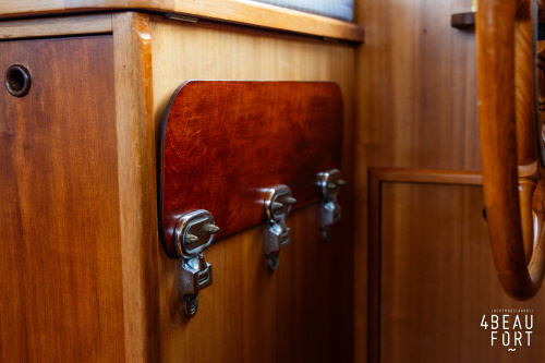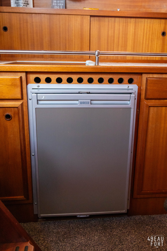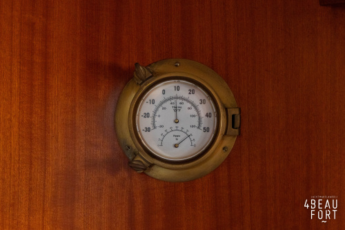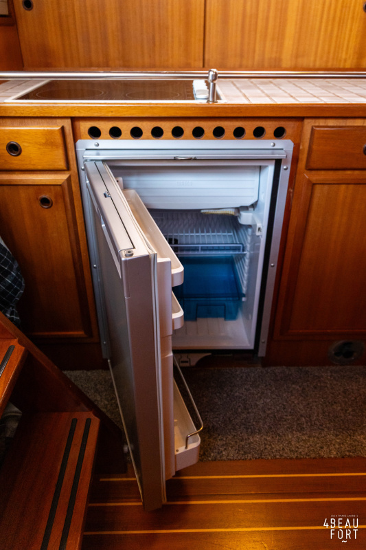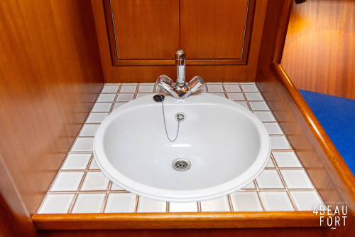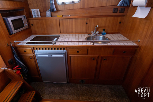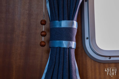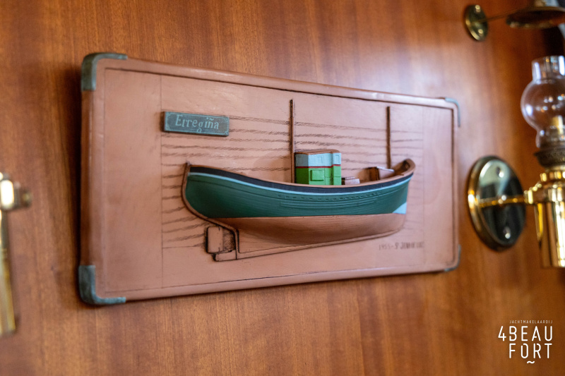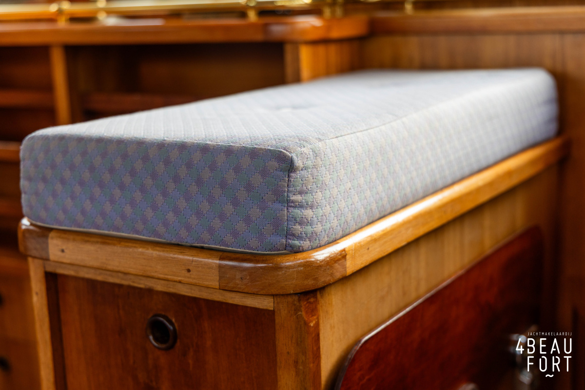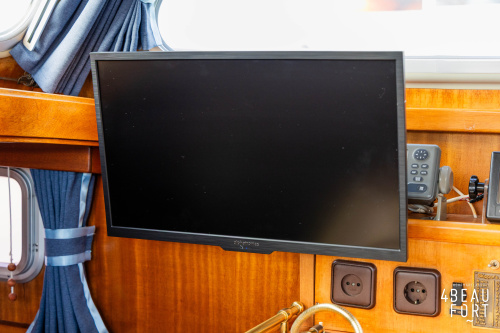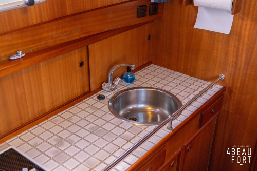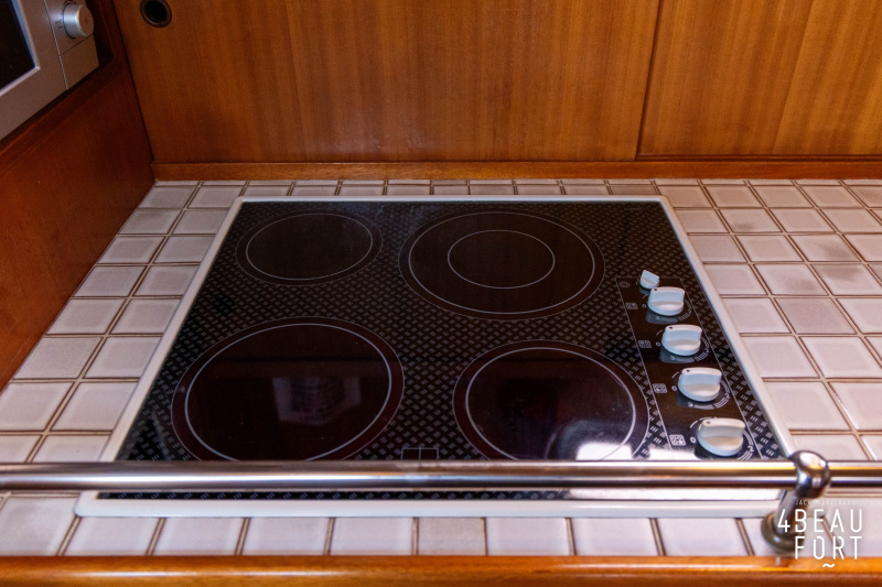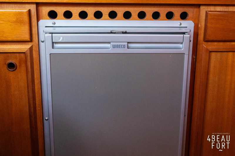 Het mahoniehouten interieur is doorgevoerd in zachte, ronde vormen die in elke ruimte terugkomen. Vanaf het achterdek loopt u aan bakboord via een trap naar de salon, waar zich een L-vormige bank, een kastenwand, de binnenstuurstand en een kaartentafel bevinden. In het voorschip bevinden zich de goed uitgeruste kombuis met tegenoverliggende dinette en de gastencabines, met een ruim V-bed, kastruimte en een wastafelmeubel. In het achterschip is de ruime eigenaarshut met tweepersoonsbed, een zitbankje en een badkamer met toilet, wastafel en douche. Tegenover de badkamer is een grote kast gesitueerd.