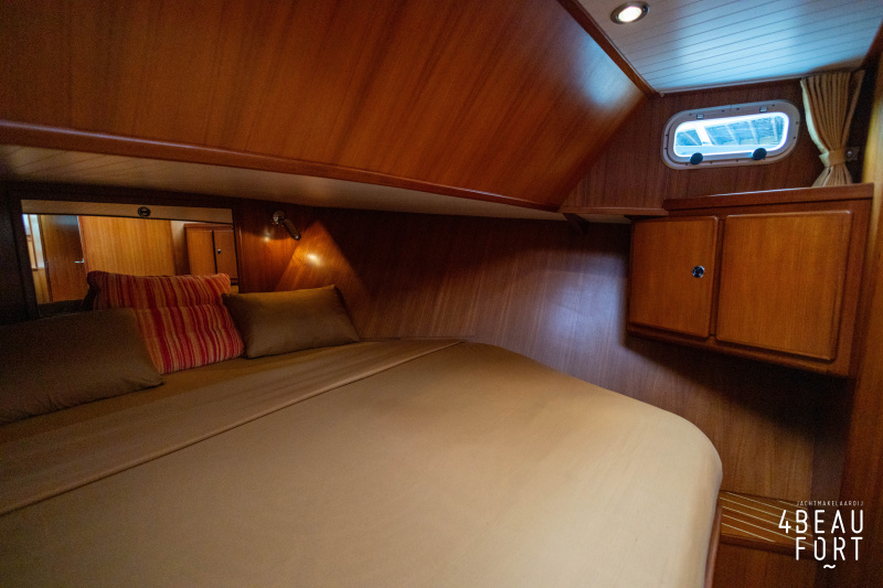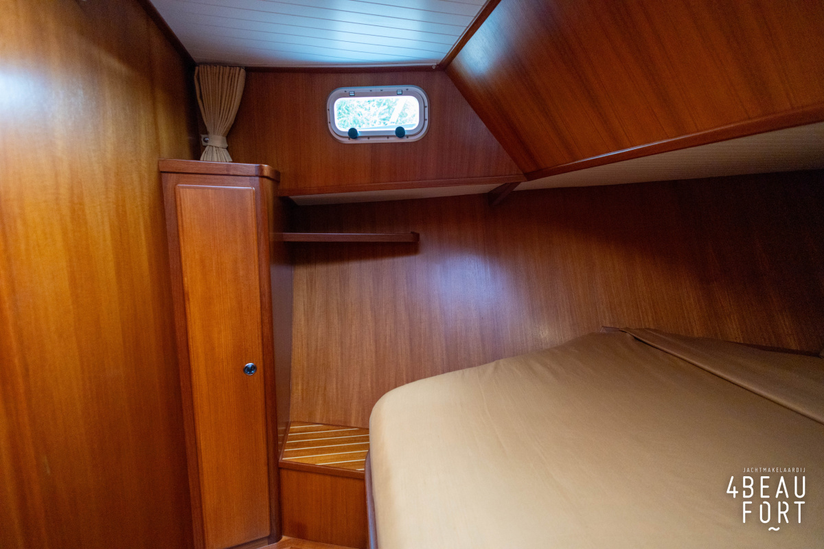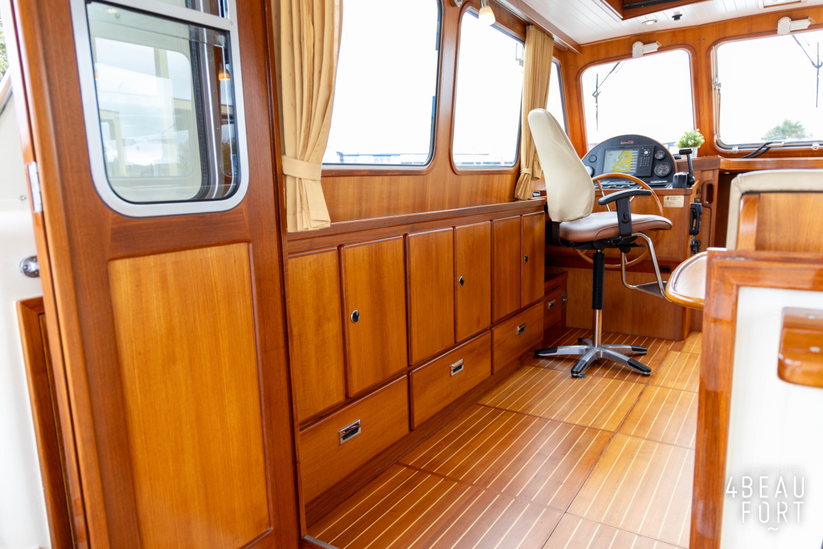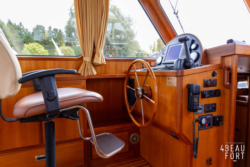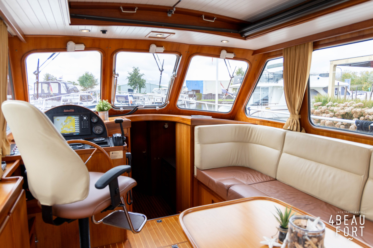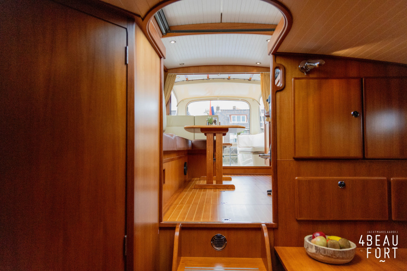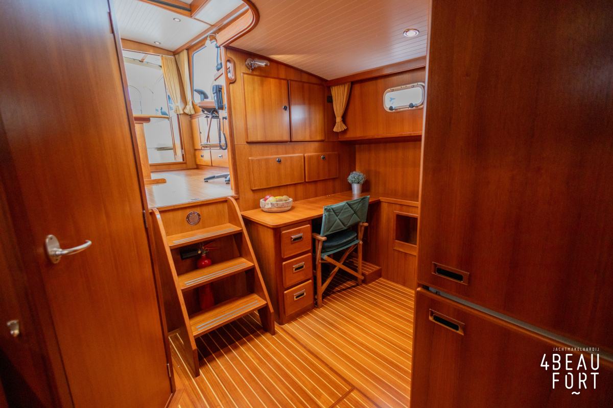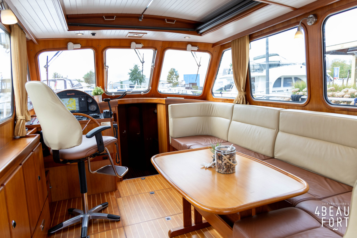 In het voorschip is de ruime eigenaarscabine met ruim vrijstaand bed en bergruimte, aparte doucheruimte, aparte toiletruimte met wastafel, bureau-hoek en een grote kombuis met o.a. magnetron, afwasmachine, wasmachine/droger combinatie en apothekerskasten. Naast de kombuis is de ingang naar de 2e hut die onder de salonvloer is gerealiseerd. De ruime salon met stuurinrichting, extra groot dakluik, veel kastruimte, en een zeer ruime zithoek. Door de openslaande deuren staat de salon direct in verbinding met de open kuip met buitenstuurstand en zitbanken. In de open kuip is tevens het luik voor de zeer ruime berging, waar o.a. de generator is geplaatst. Via de deur in de spiegel stap je via een eenvoudige afstap direct op het ruime zwemplateau.