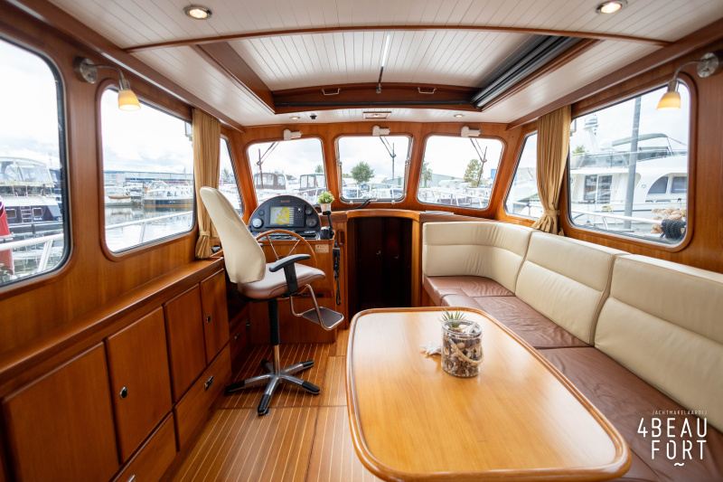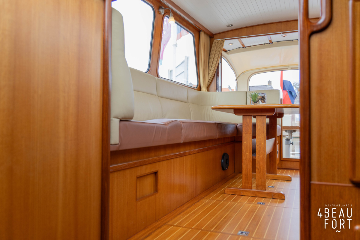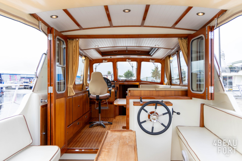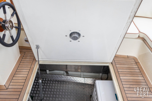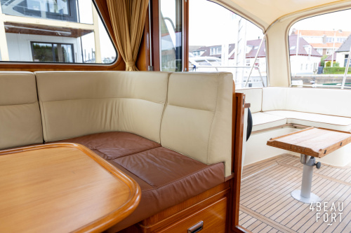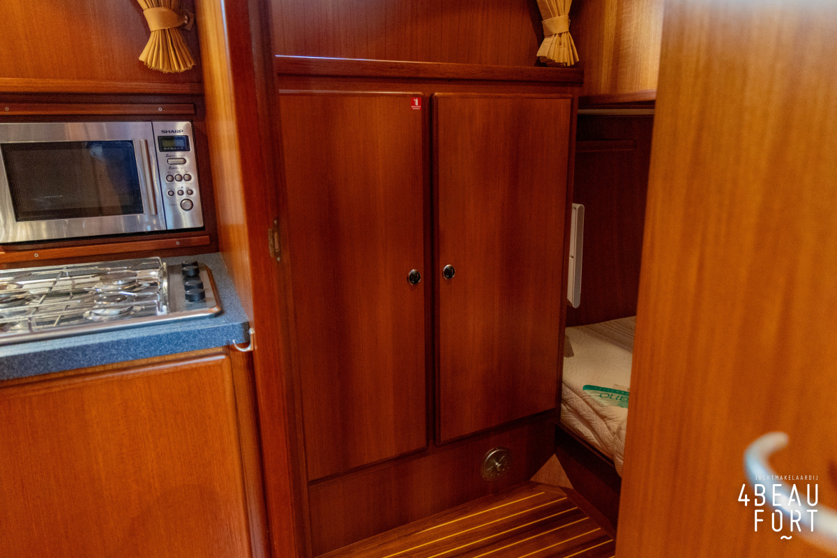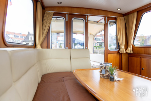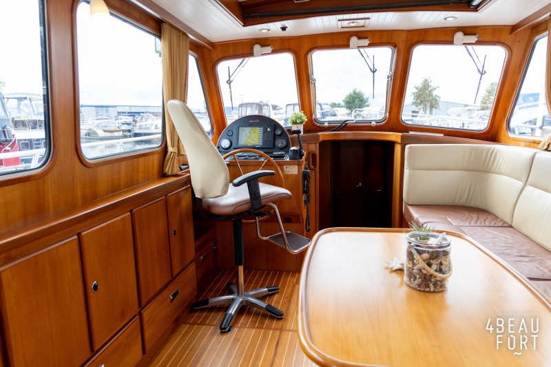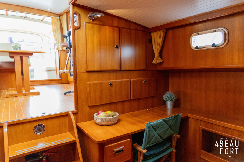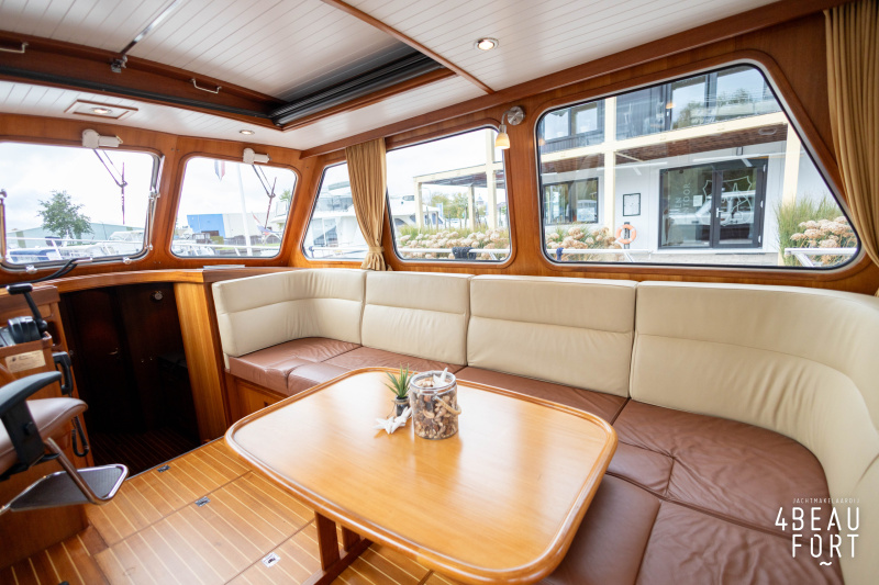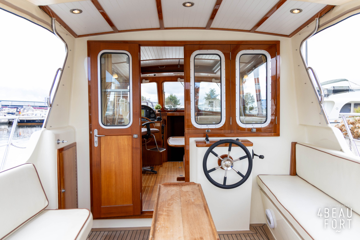 In het voorschip is de ruime eigenaarscabine met ruim vrijstaand bed en bergruimte, aparte doucheruimte, aparte toiletruimte met wastafel, bureau-hoek en een grote kombuis met o.a. magnetron, afwasmachine, wasmachine/droger combinatie en apothekerskasten. Naast de kombuis is de ingang naar de 2e hut die onder de salonvloer is gerealiseerd. De ruime salon met stuurinrichting, extra groot dakluik, veel kastruimte, en een zeer ruime zithoek. Door de openslaande deuren staat de salon direct in verbinding met de open kuip met buitenstuurstand en zitbanken. In de open kuip is tevens het luik voor de zeer ruime berging, waar o.a. de generator is geplaatst. Via de deur in de spiegel stap je via een eenvoudige afstap direct op het ruime zwemplateau.