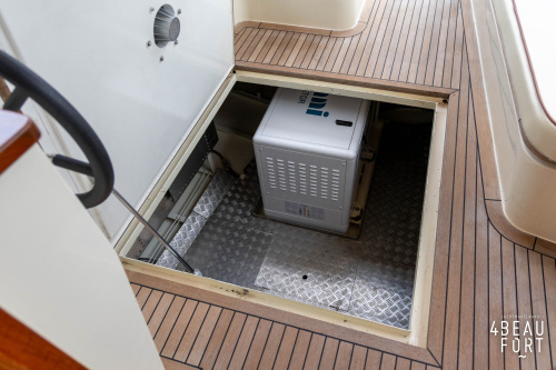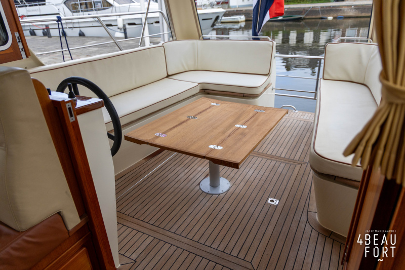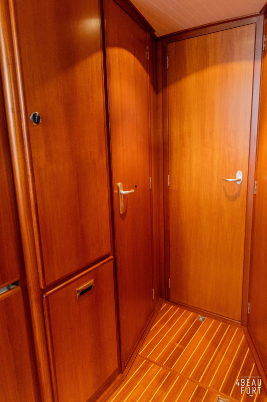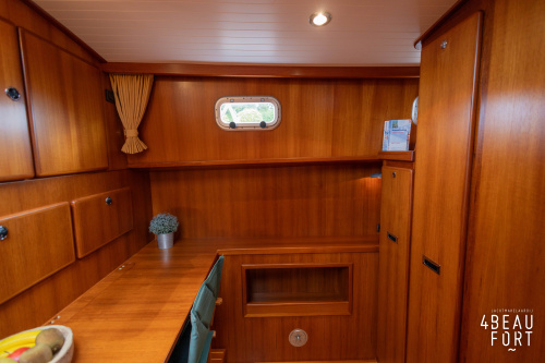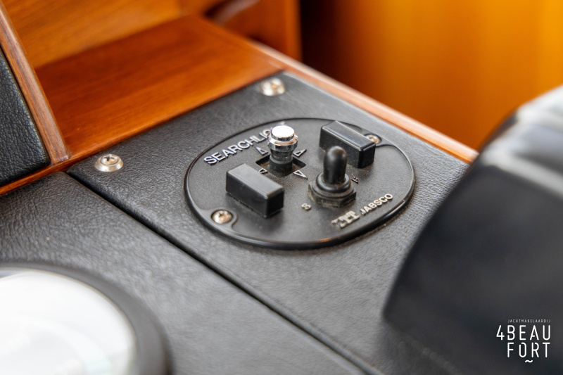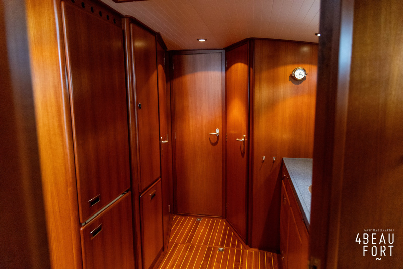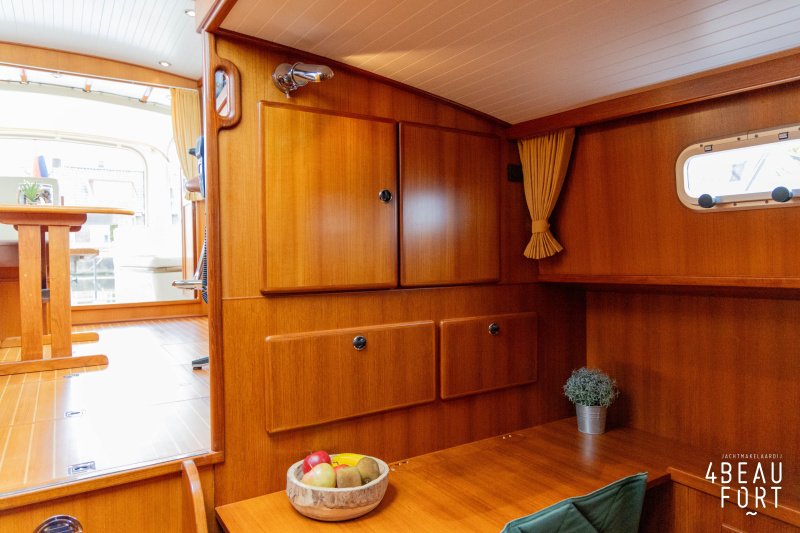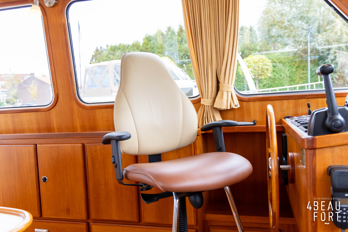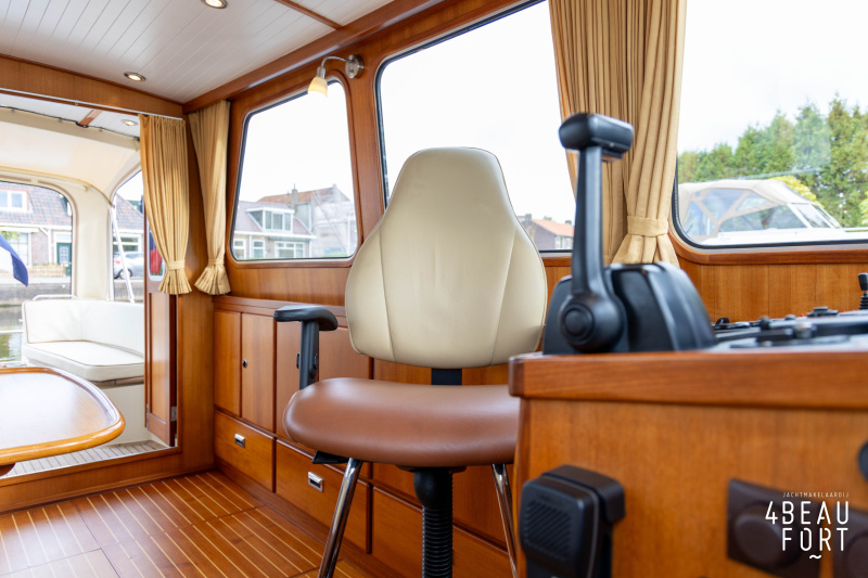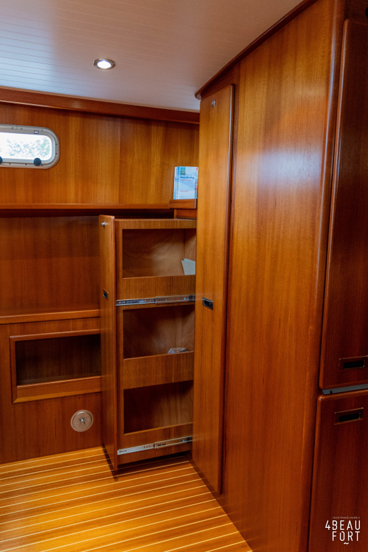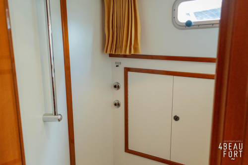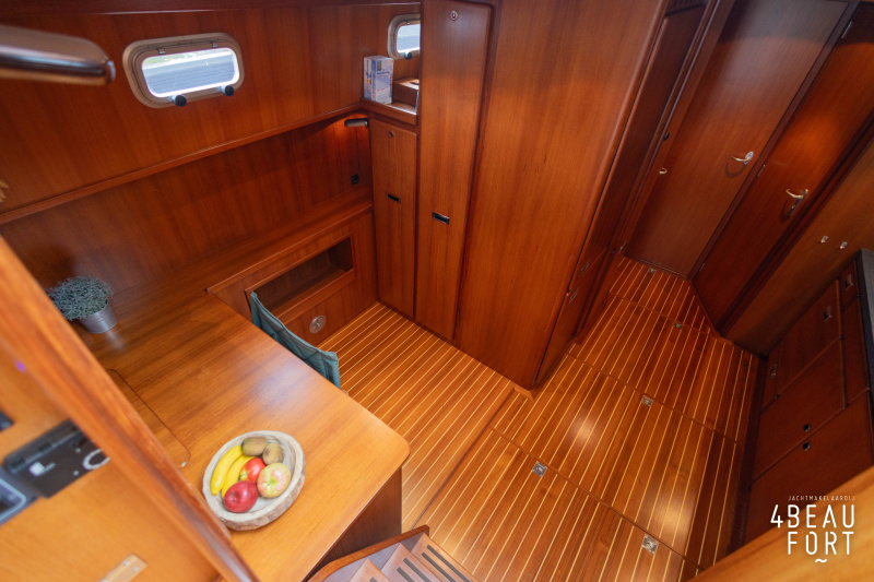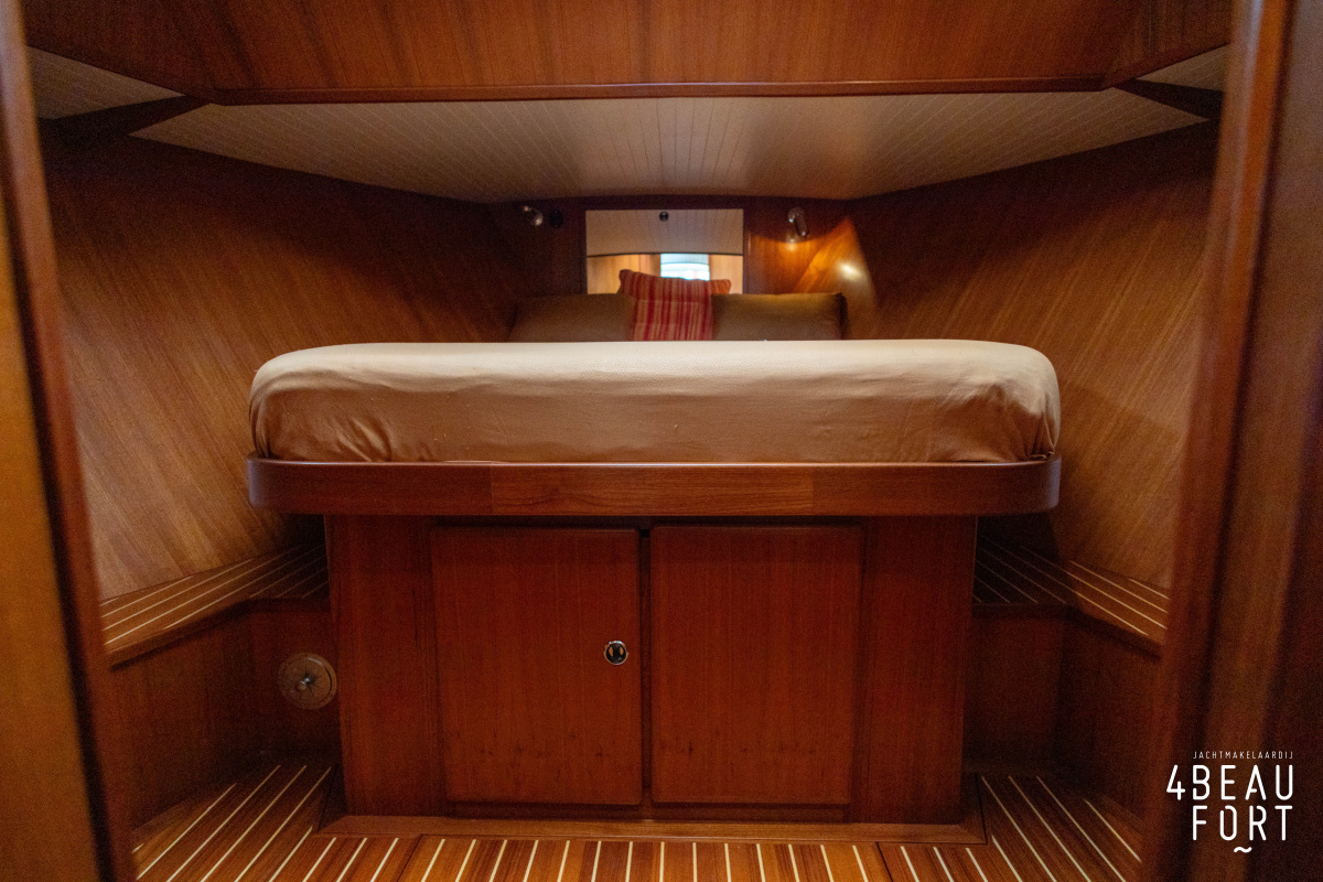 In het voorschip is de ruime eigenaarscabine met ruim vrijstaand bed en bergruimte, aparte doucheruimte, aparte toiletruimte met wastafel, bureau-hoek en een grote kombuis met o.a. magnetron, afwasmachine, wasmachine/droger combinatie en apothekerskasten. Naast de kombuis is de ingang naar de 2e hut die onder de salonvloer is gerealiseerd. De ruime salon met stuurinrichting, extra groot dakluik, veel kastruimte, en een zeer ruime zithoek. Door de openslaande deuren staat de salon direct in verbinding met de open kuip met buitenstuurstand en zitbanken. In de open kuip is tevens het luik voor de zeer ruime berging, waar o.a. de generator is geplaatst. Via de deur in de spiegel stap je via een eenvoudige afstap direct op het ruime zwemplateau.