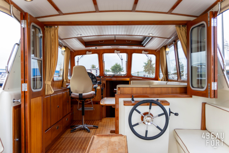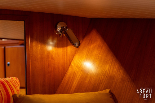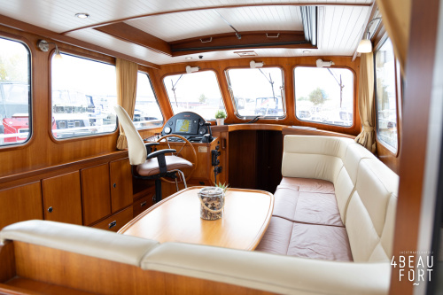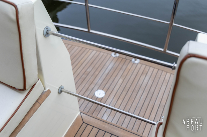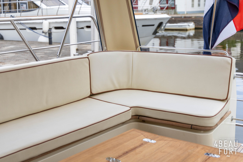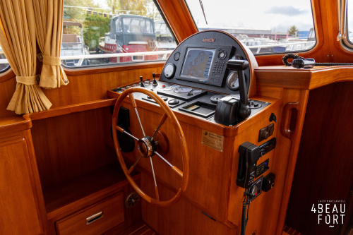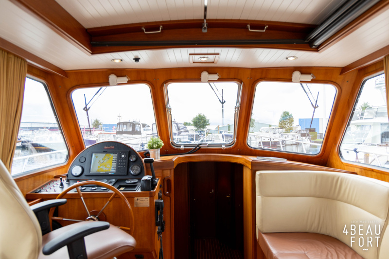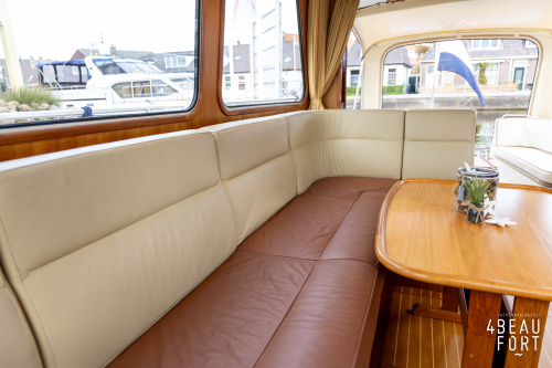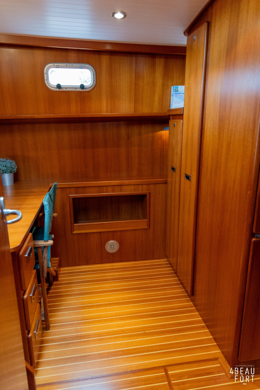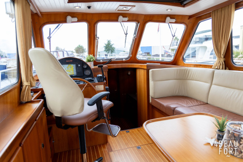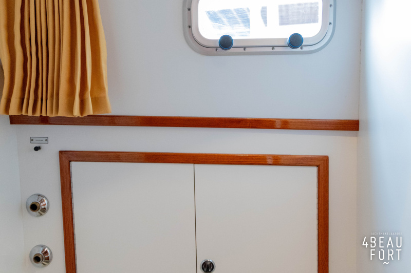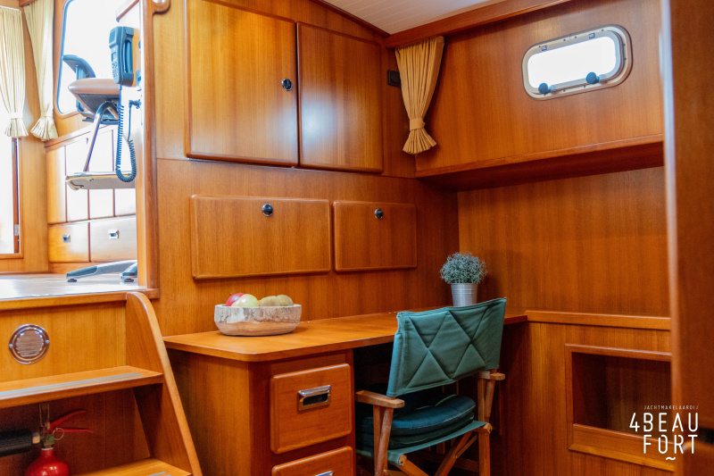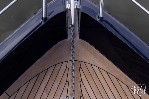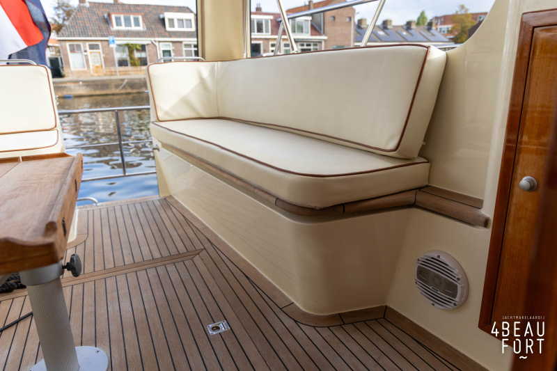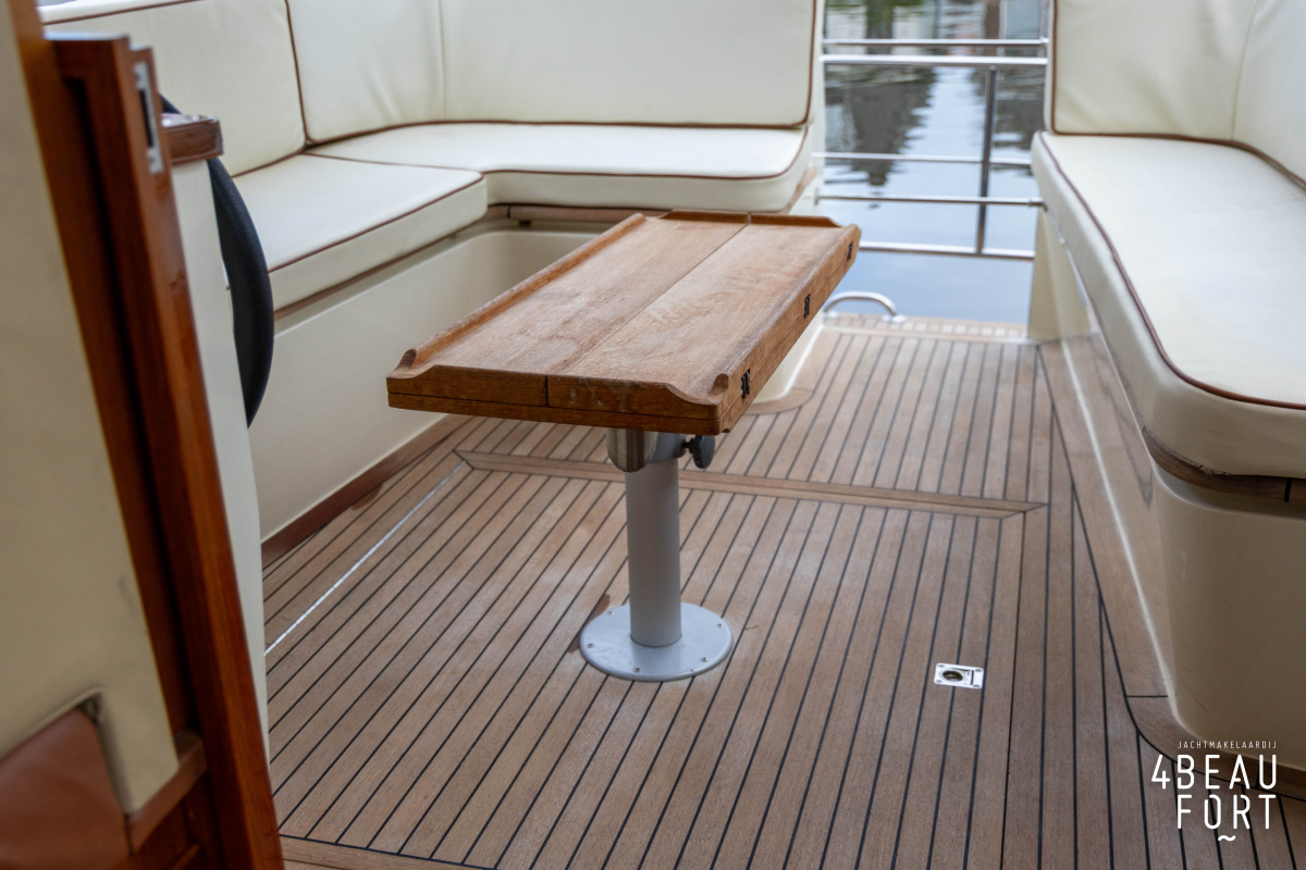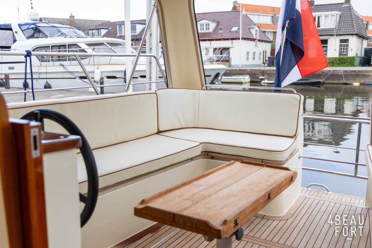 In het voorschip is de ruime eigenaarscabine met ruim vrijstaand bed en bergruimte, aparte doucheruimte, aparte toiletruimte met wastafel, bureau-hoek en een grote kombuis met o.a. magnetron, afwasmachine, wasmachine/droger combinatie en apothekerskasten. Naast de kombuis is de ingang naar de 2e hut die onder de salonvloer is gerealiseerd. De ruime salon met stuurinrichting, extra groot dakluik, veel kastruimte, en een zeer ruime zithoek. Door de openslaande deuren staat de salon direct in verbinding met de open kuip met buitenstuurstand en zitbanken. In de open kuip is tevens het luik voor de zeer ruime berging, waar o.a. de generator is geplaatst. Via de deur in de spiegel stap je via een eenvoudige afstap direct op het ruime zwemplateau.