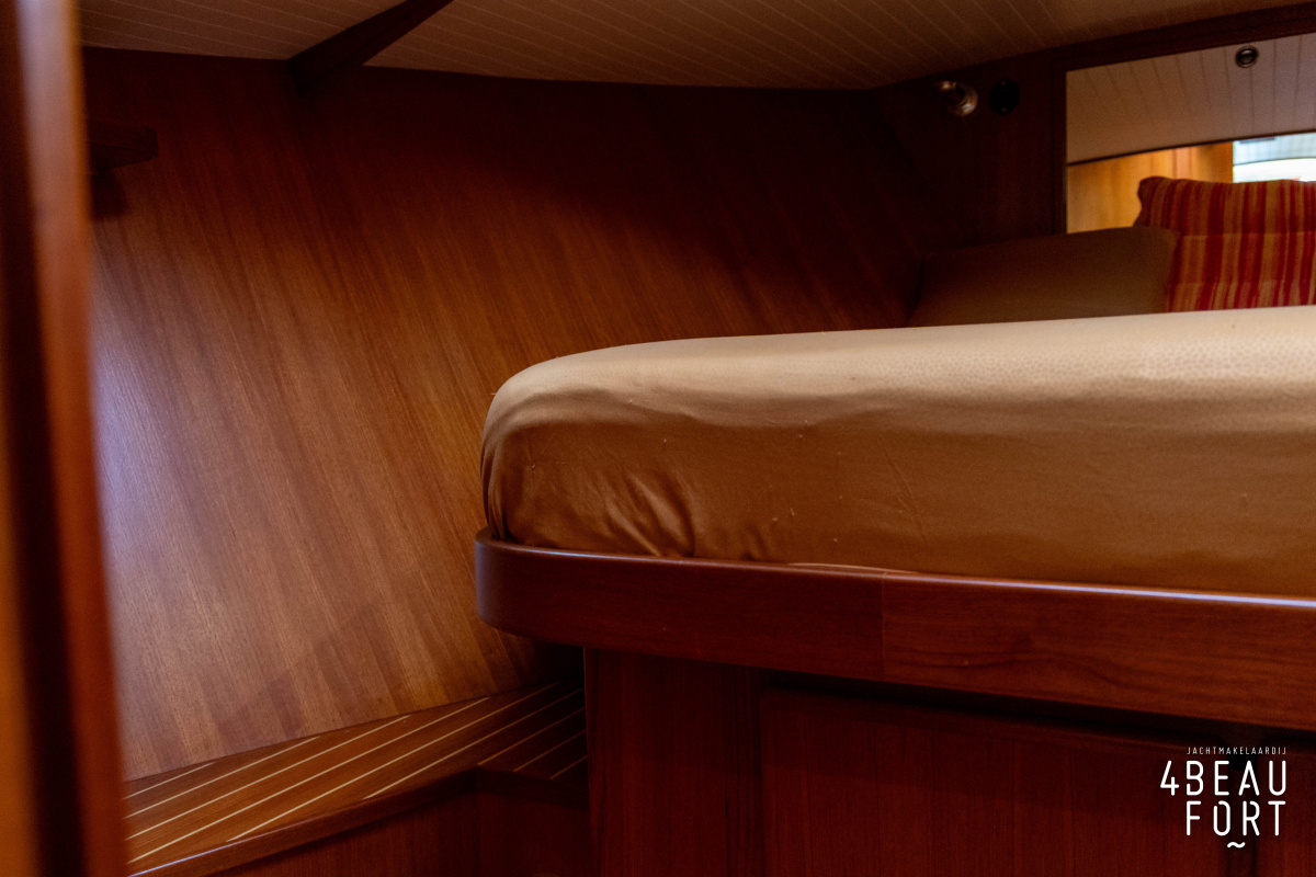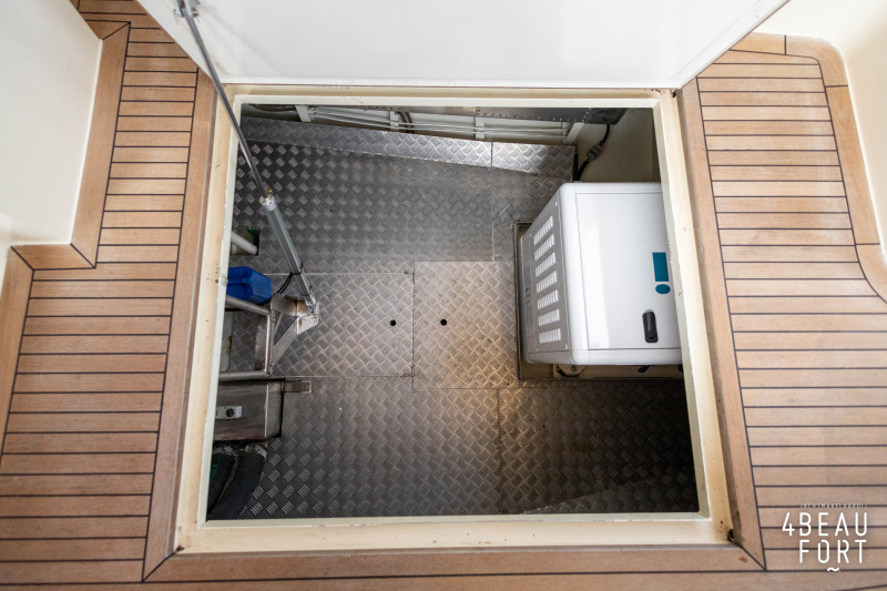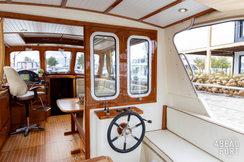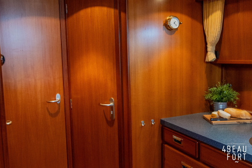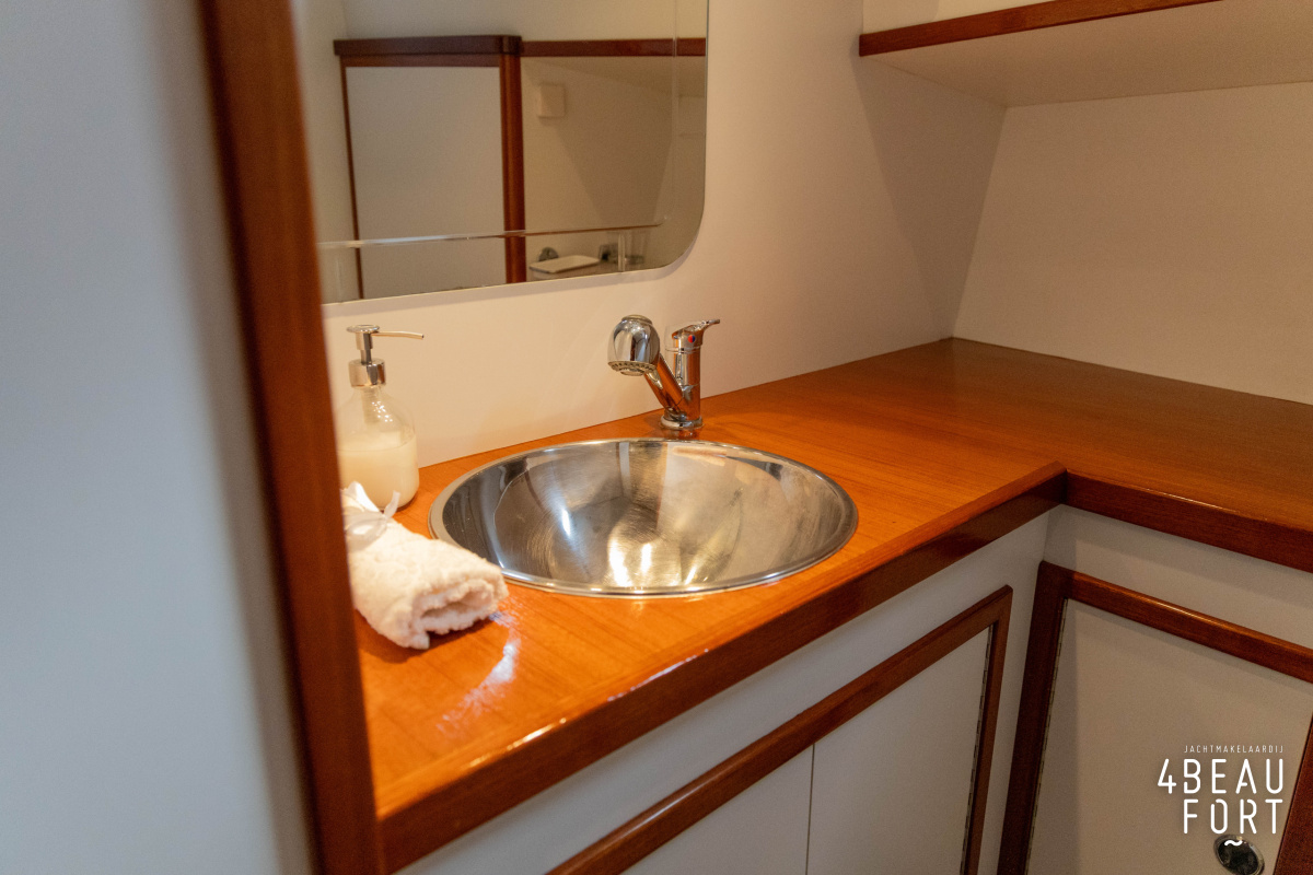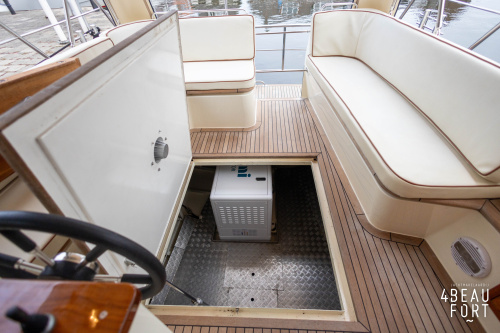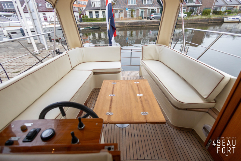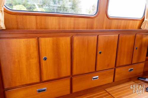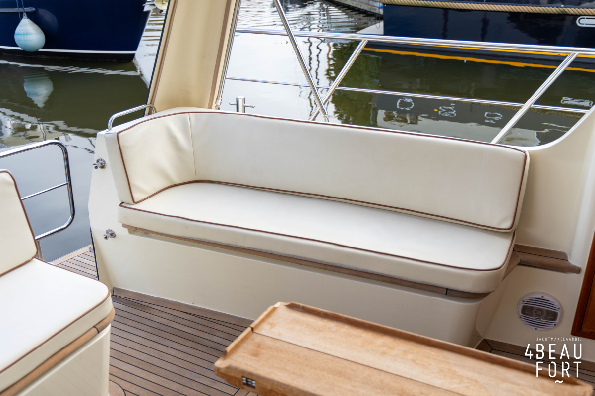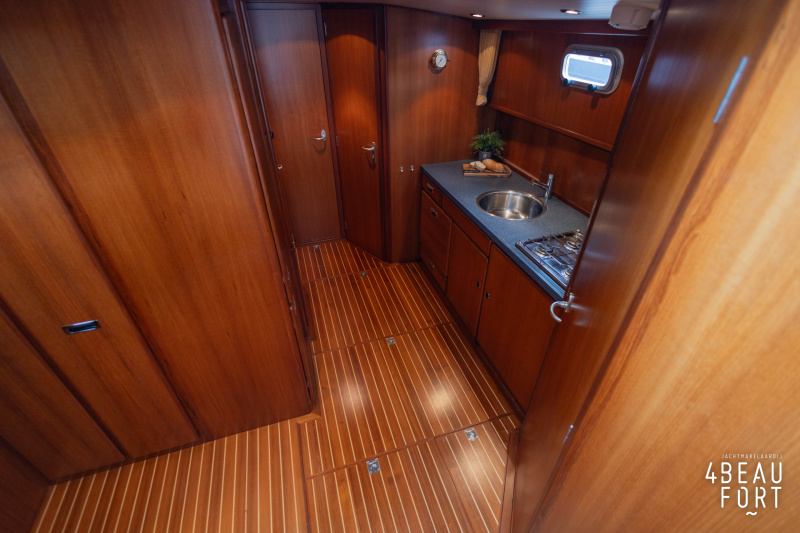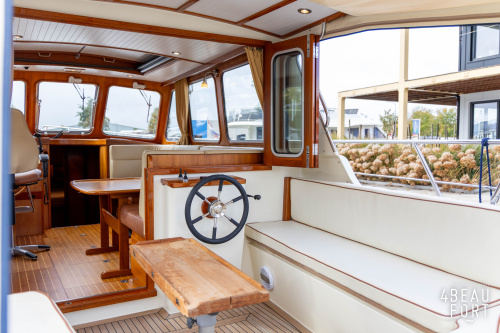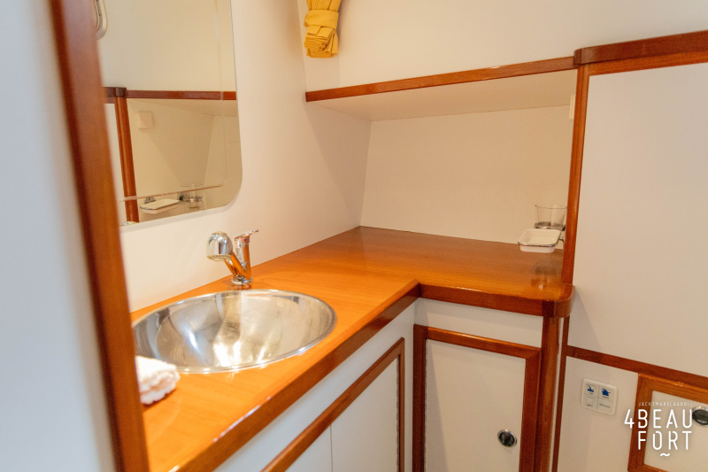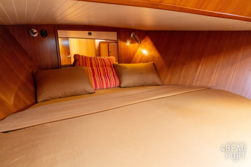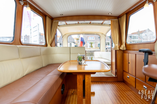 In het voorschip is de ruime eigenaarscabine met ruim vrijstaand bed en bergruimte, aparte doucheruimte, aparte toiletruimte met wastafel, bureau-hoek en een grote kombuis met o.a. magnetron, afwasmachine, wasmachine/droger combinatie en apothekerskasten. Naast de kombuis is de ingang naar de 2e hut die onder de salonvloer is gerealiseerd. De ruime salon met stuurinrichting, extra groot dakluik, veel kastruimte, en een zeer ruime zithoek. Door de openslaande deuren staat de salon direct in verbinding met de open kuip met buitenstuurstand en zitbanken. In de open kuip is tevens het luik voor de zeer ruime berging, waar o.a. de generator is geplaatst. Via de deur in de spiegel stap je via een eenvoudige afstap direct op het ruime zwemplateau.