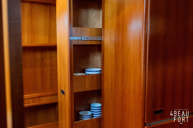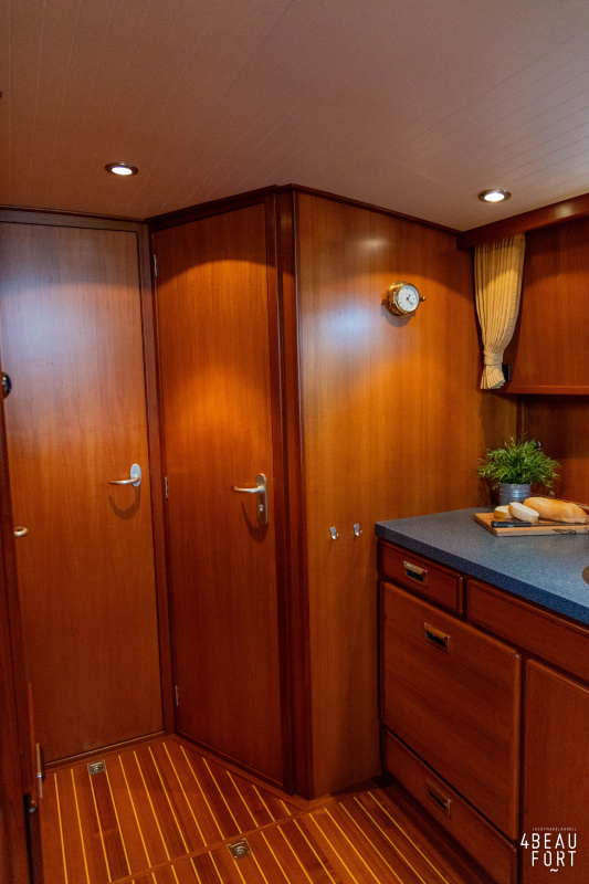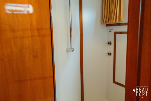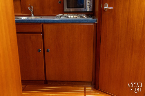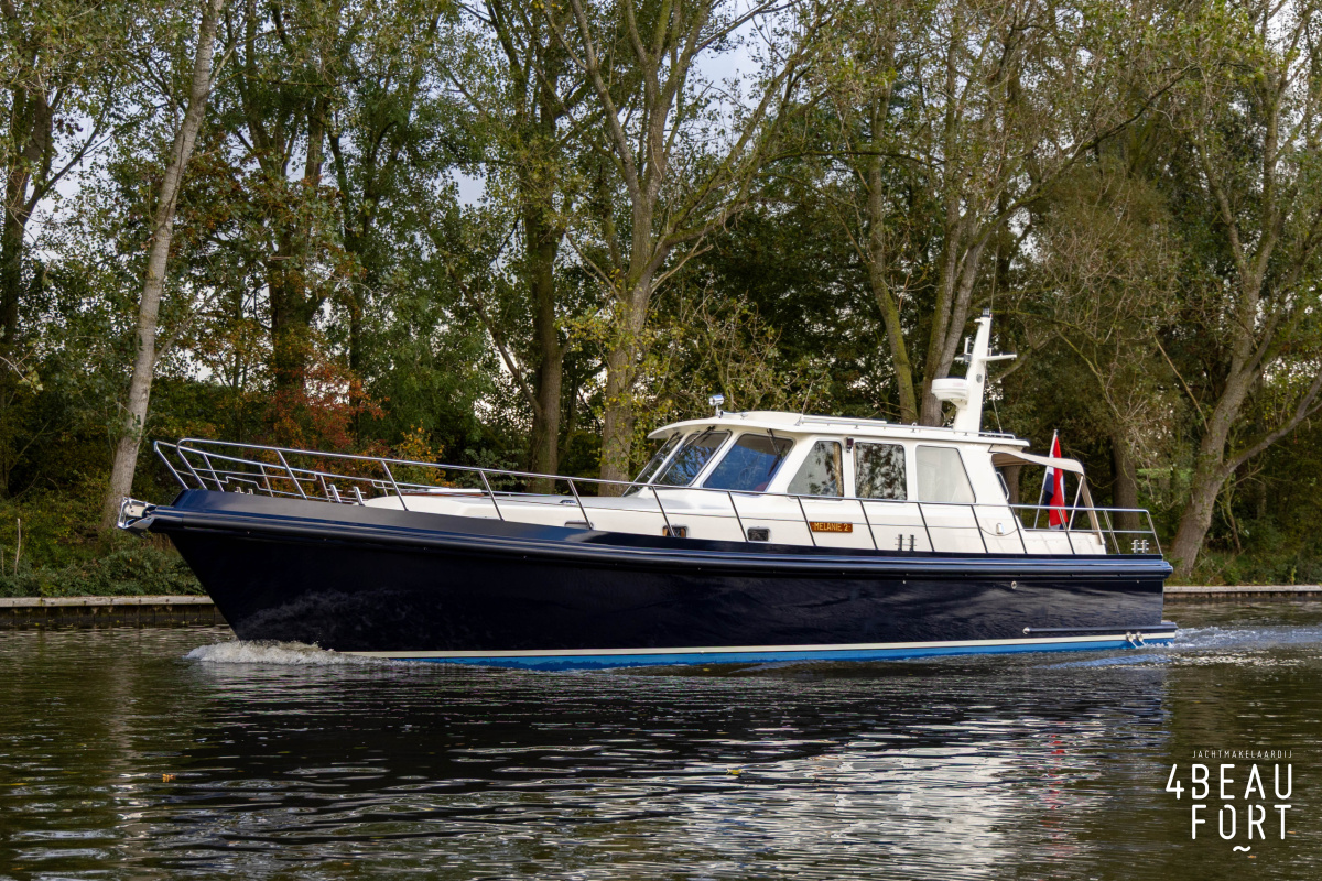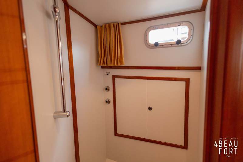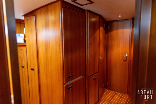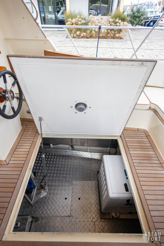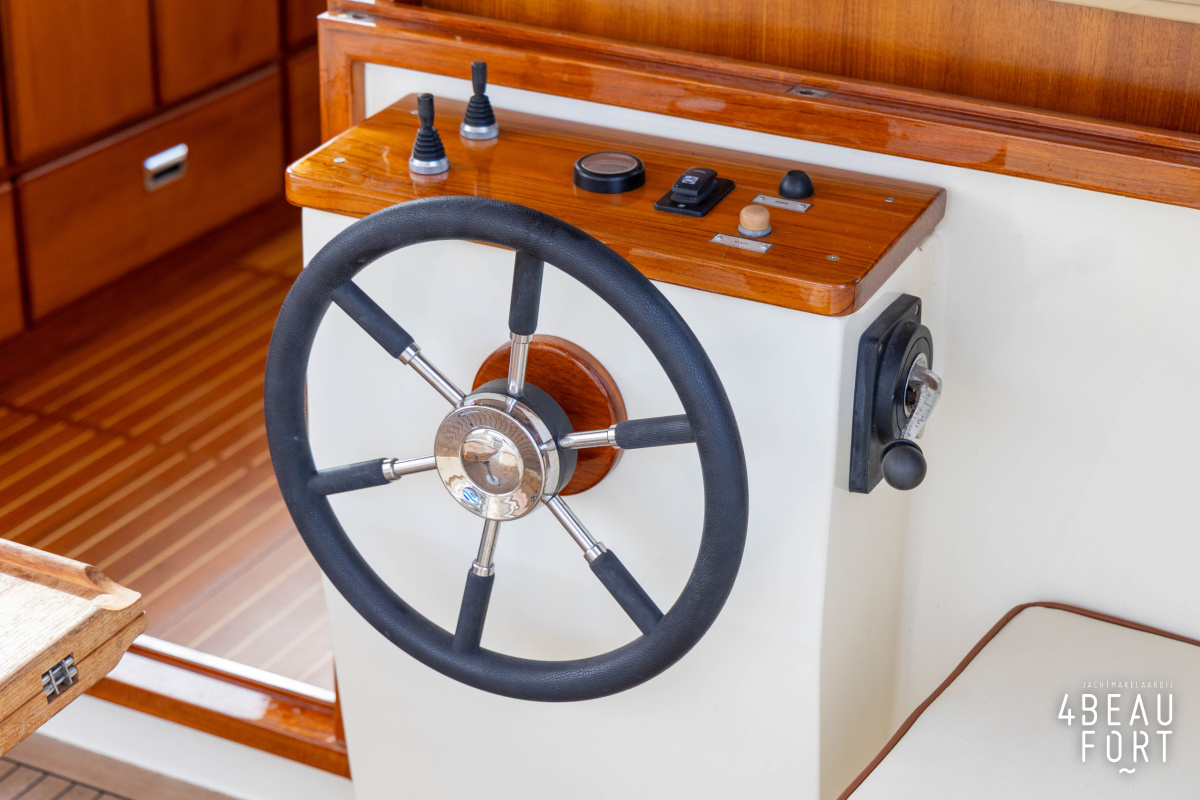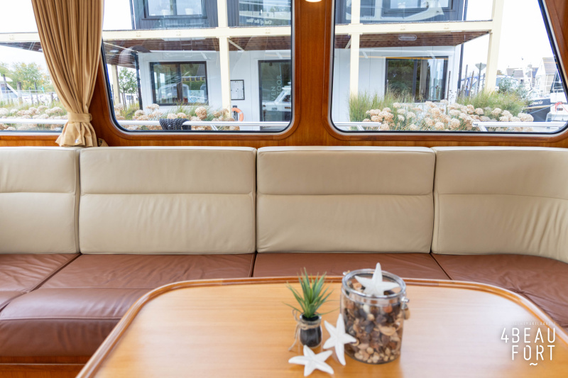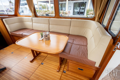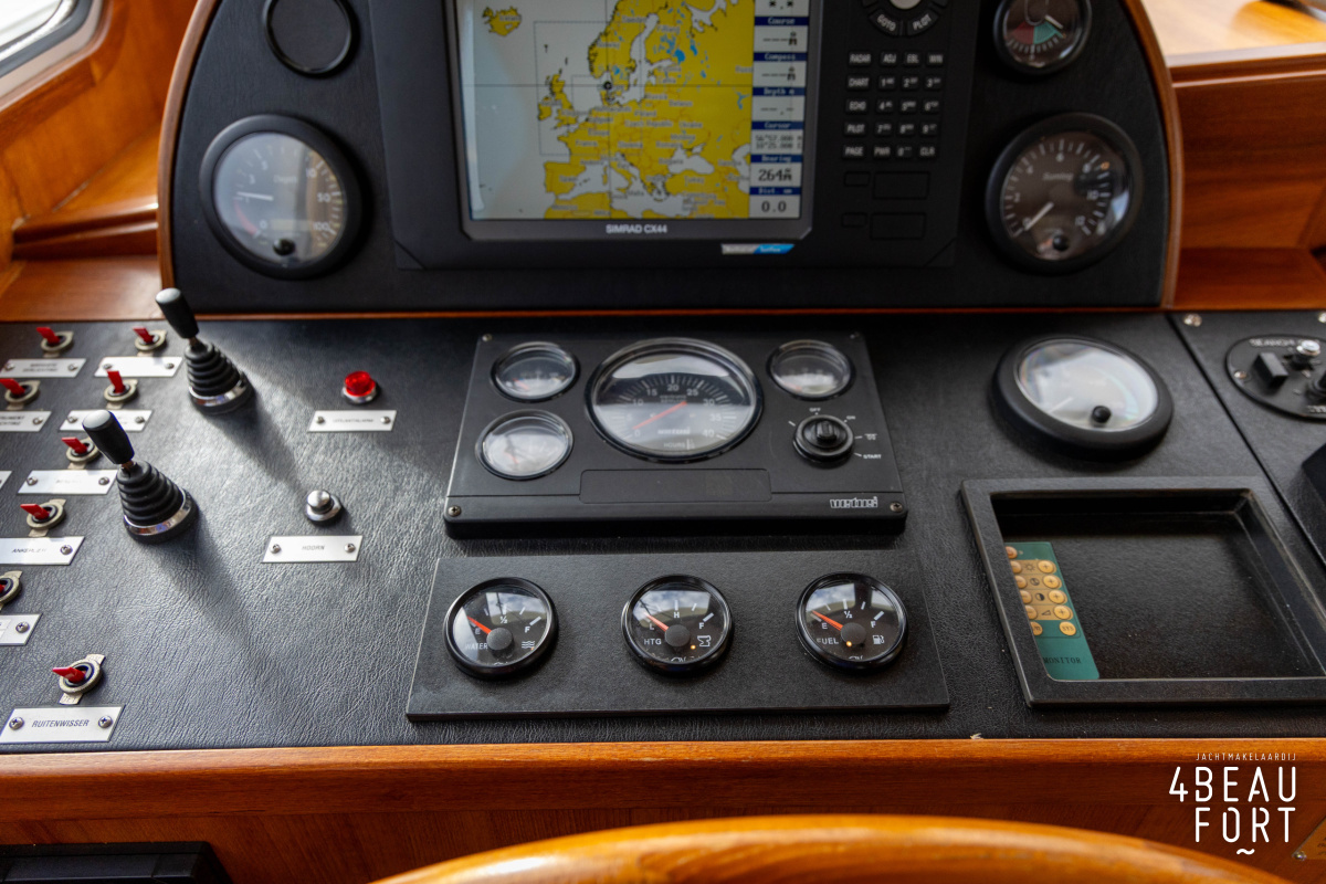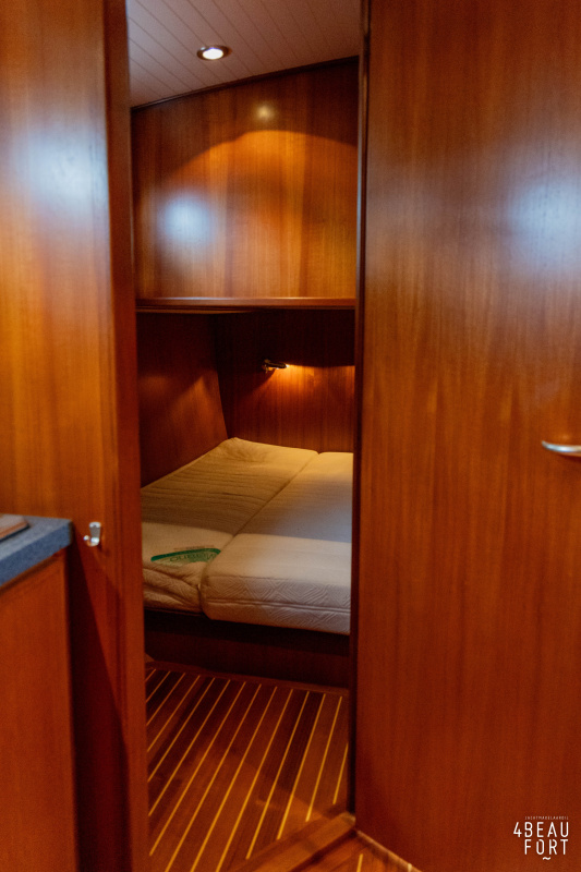 In het voorschip is de ruime eigenaarscabine met ruim vrijstaand bed en bergruimte, aparte doucheruimte, aparte toiletruimte met wastafel, bureau-hoek en een grote kombuis met o.a. magnetron, afwasmachine, wasmachine/droger combinatie en apothekerskasten. Naast de kombuis is de ingang naar de 2e hut die onder de salonvloer is gerealiseerd. De ruime salon met stuurinrichting, extra groot dakluik, veel kastruimte, en een zeer ruime zithoek. Door de openslaande deuren staat de salon direct in verbinding met de open kuip met buitenstuurstand en zitbanken. In de open kuip is tevens het luik voor de zeer ruime berging, waar o.a. de generator is geplaatst. Via de deur in de spiegel stap je via een eenvoudige afstap direct op het ruime zwemplateau.