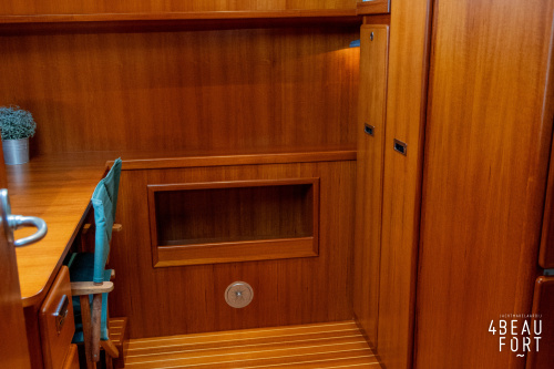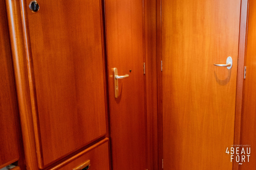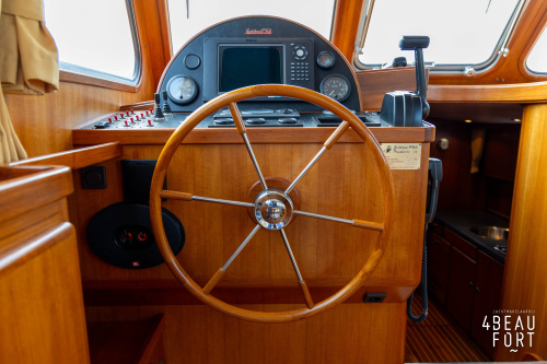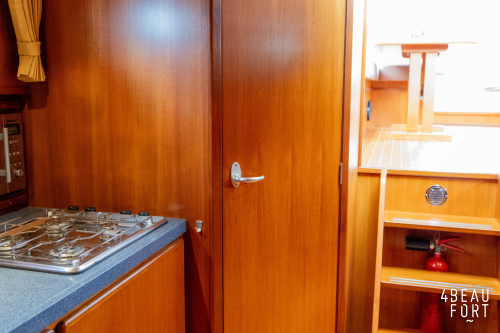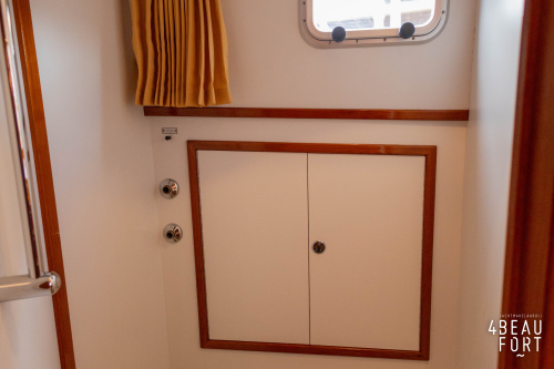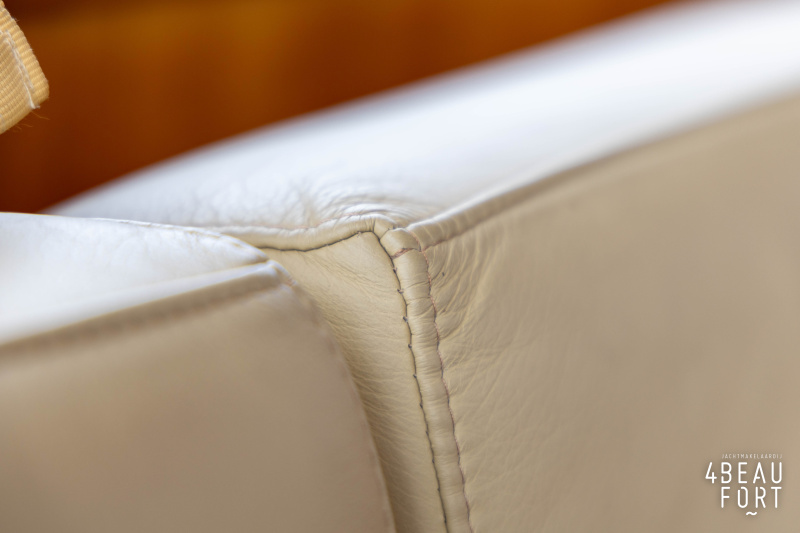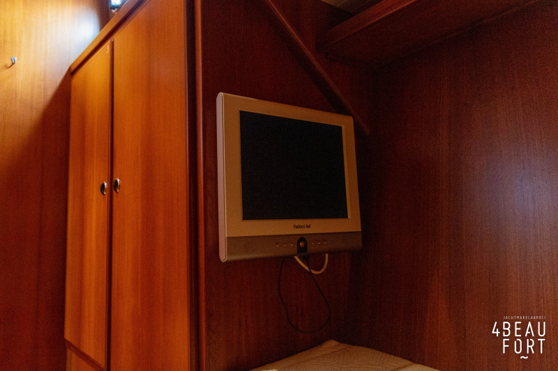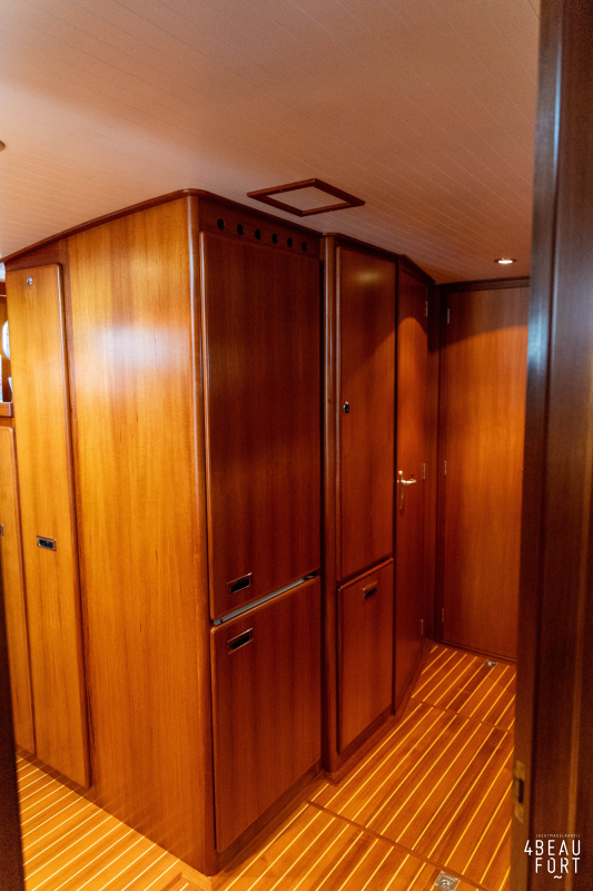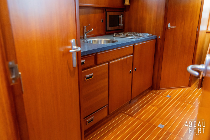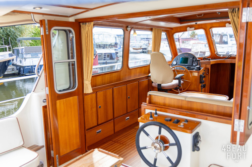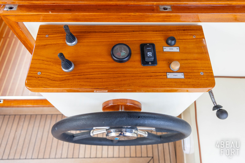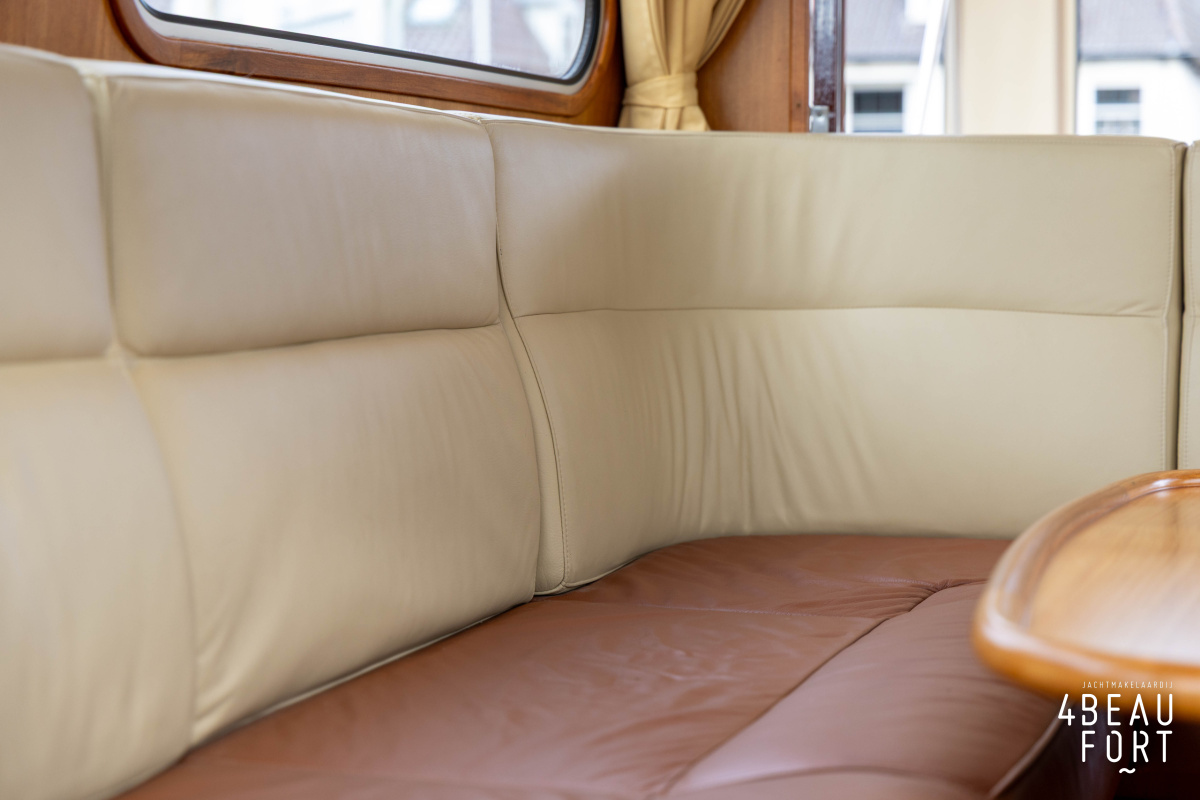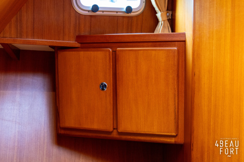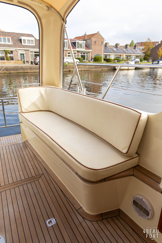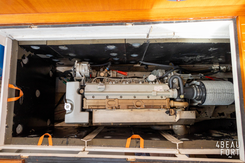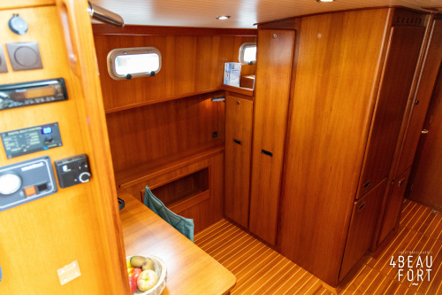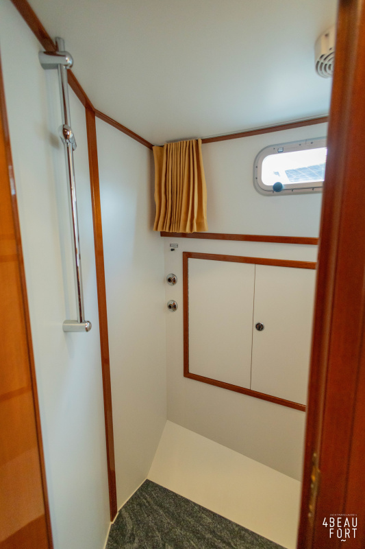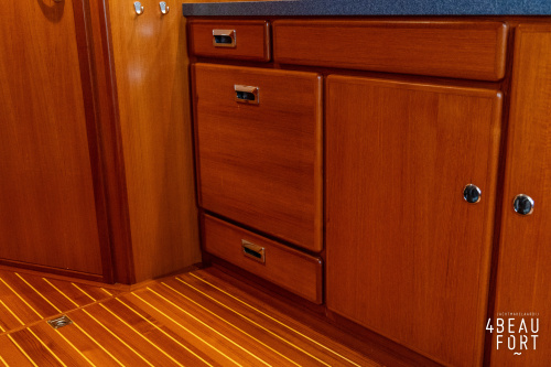 In het voorschip is de ruime eigenaarscabine met ruim vrijstaand bed en bergruimte, aparte doucheruimte, aparte toiletruimte met wastafel, bureau-hoek en een grote kombuis met o.a. magnetron, afwasmachine, wasmachine/droger combinatie en apothekerskasten. Naast de kombuis is de ingang naar de 2e hut die onder de salonvloer is gerealiseerd. De ruime salon met stuurinrichting, extra groot dakluik, veel kastruimte, en een zeer ruime zithoek. Door de openslaande deuren staat de salon direct in verbinding met de open kuip met buitenstuurstand en zitbanken. In de open kuip is tevens het luik voor de zeer ruime berging, waar o.a. de generator is geplaatst. Via de deur in de spiegel stap je via een eenvoudige afstap direct op het ruime zwemplateau.
