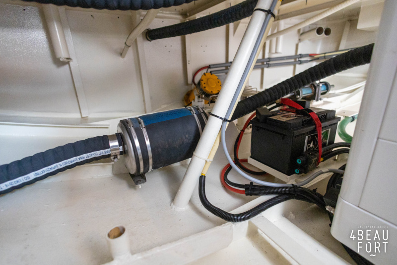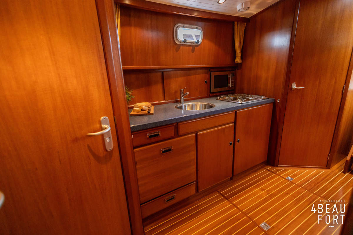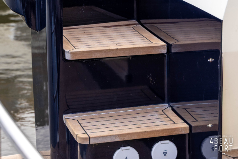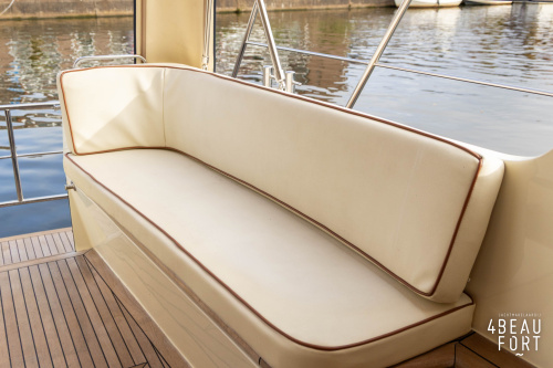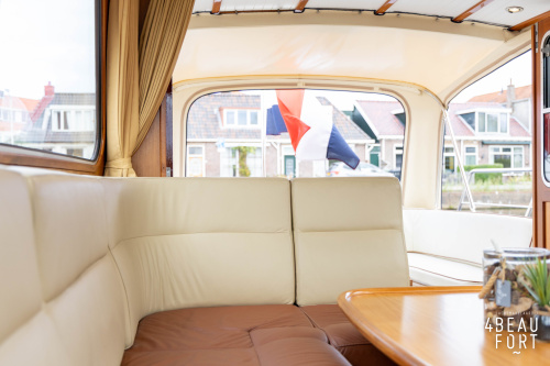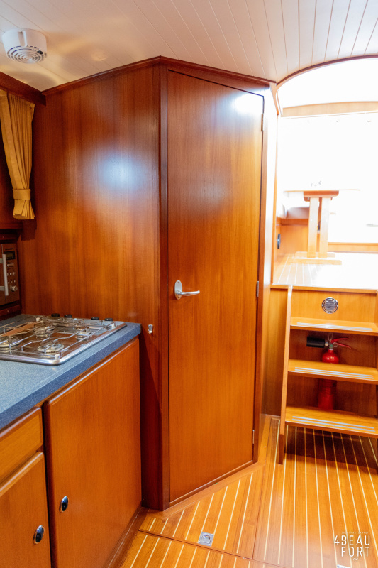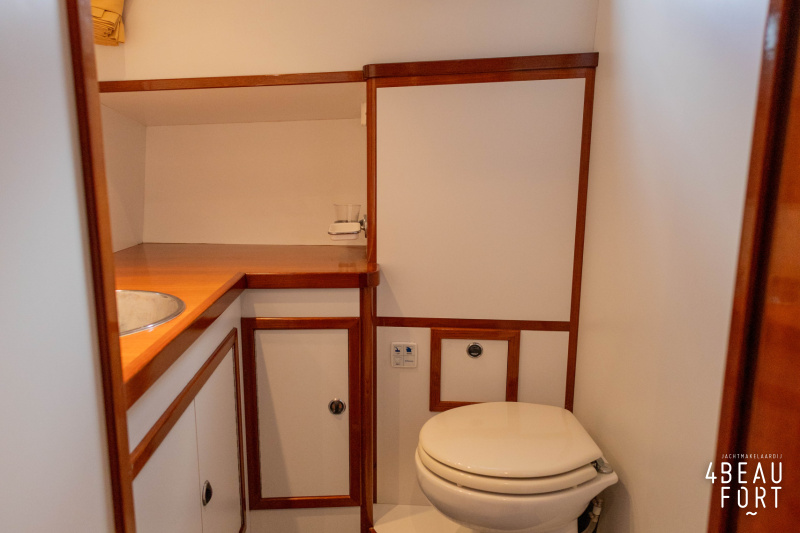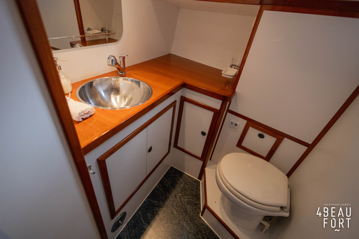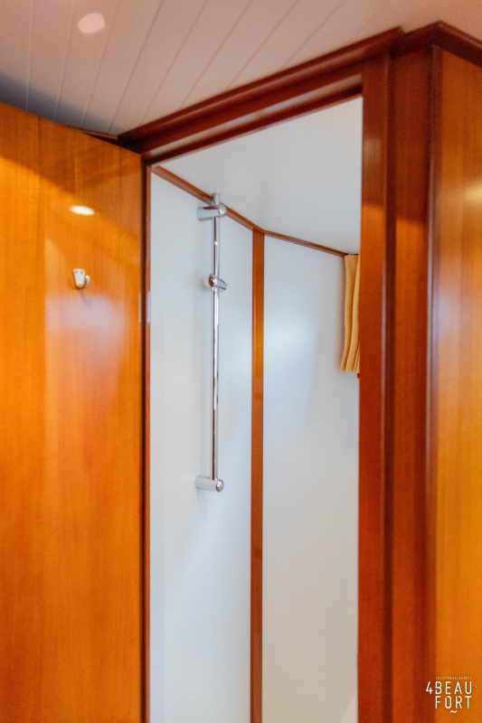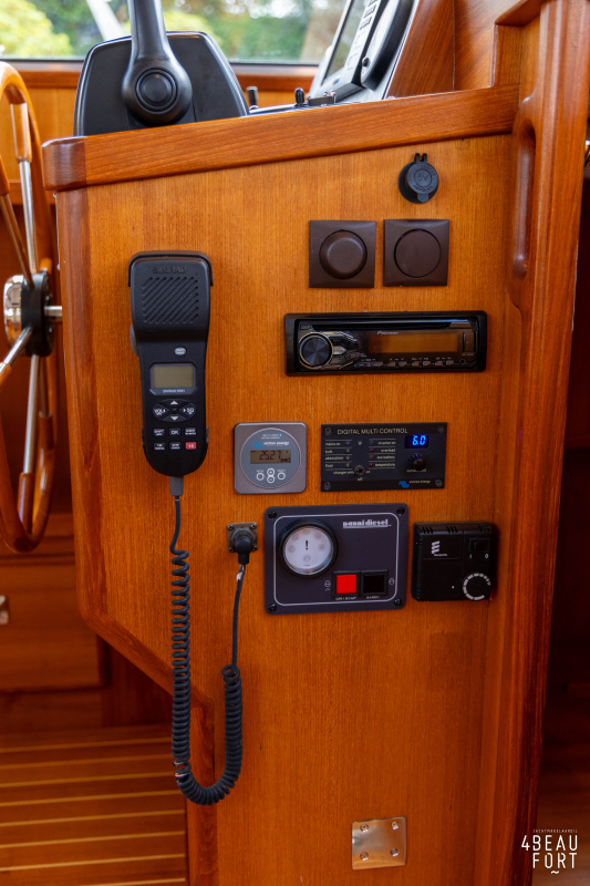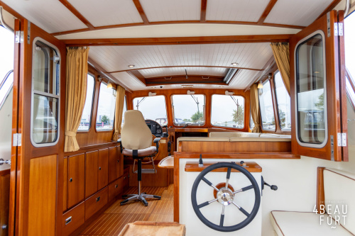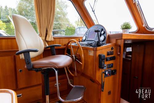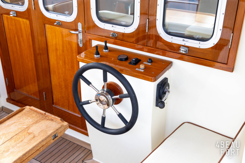 In het voorschip is de ruime eigenaarscabine met ruim vrijstaand bed en bergruimte, aparte doucheruimte, aparte toiletruimte met wastafel, bureau-hoek en een grote kombuis met o.a. magnetron, afwasmachine, wasmachine/droger combinatie en apothekerskasten. Naast de kombuis is de ingang naar de 2e hut die onder de salonvloer is gerealiseerd. De ruime salon met stuurinrichting, extra groot dakluik, veel kastruimte, en een zeer ruime zithoek. Door de openslaande deuren staat de salon direct in verbinding met de open kuip met buitenstuurstand en zitbanken. In de open kuip is tevens het luik voor de zeer ruime berging, waar o.a. de generator is geplaatst. Via de deur in de spiegel stap je via een eenvoudige afstap direct op het ruime zwemplateau.