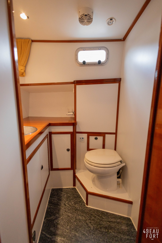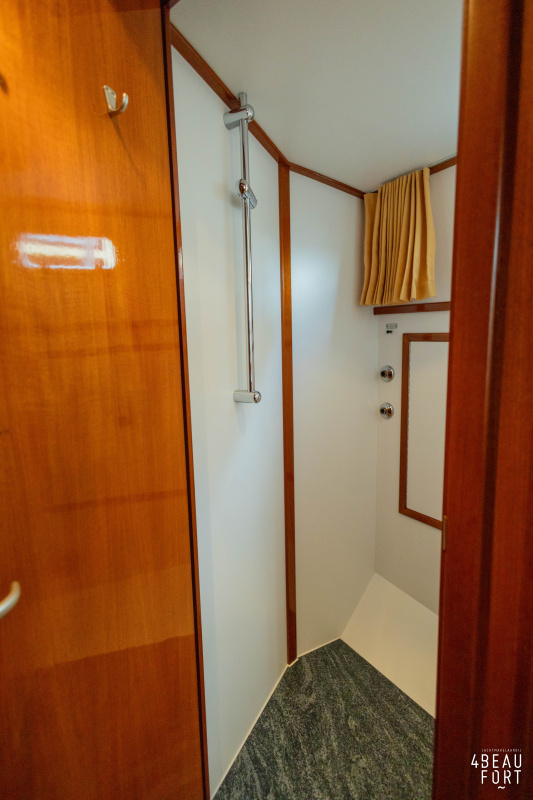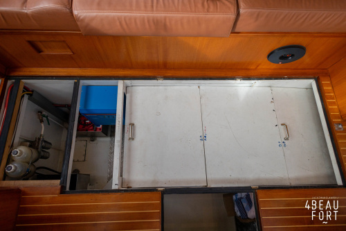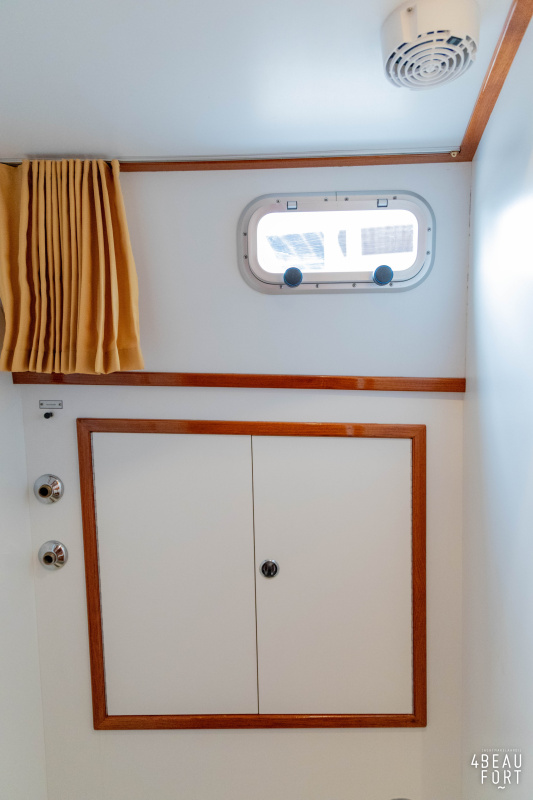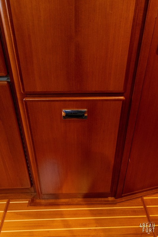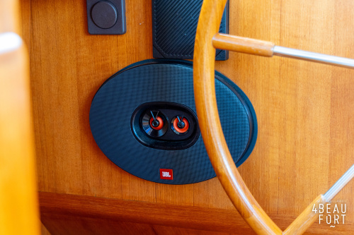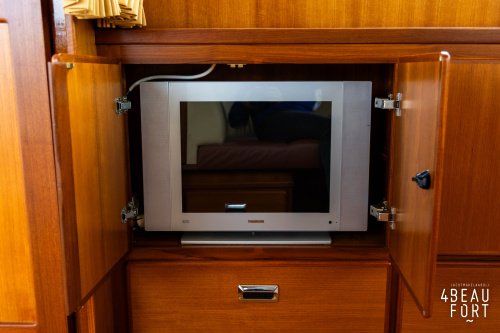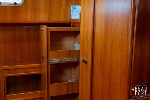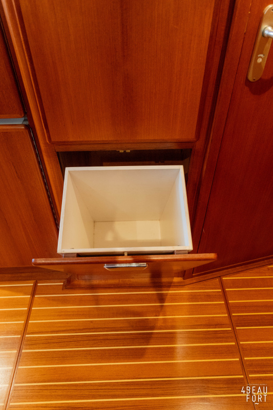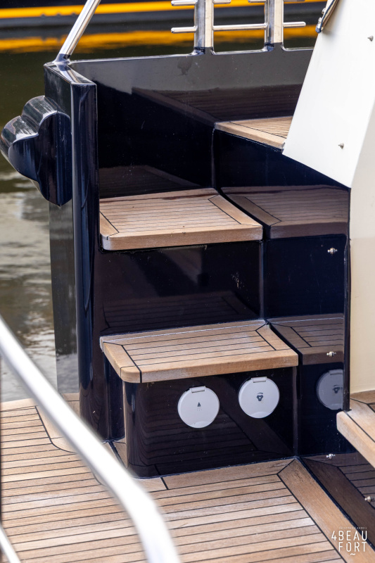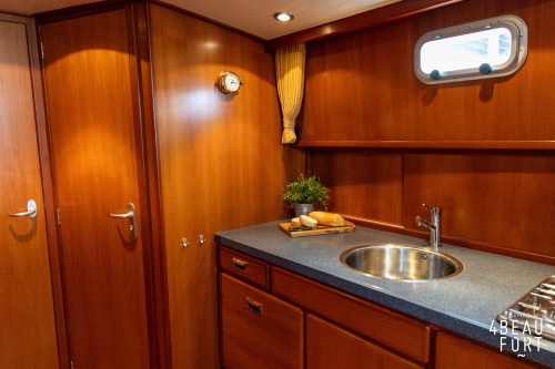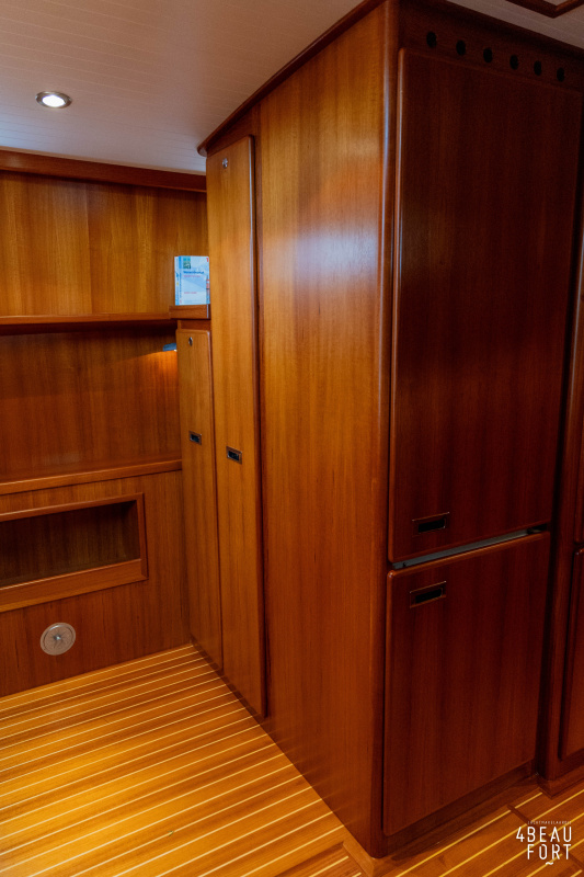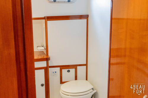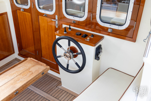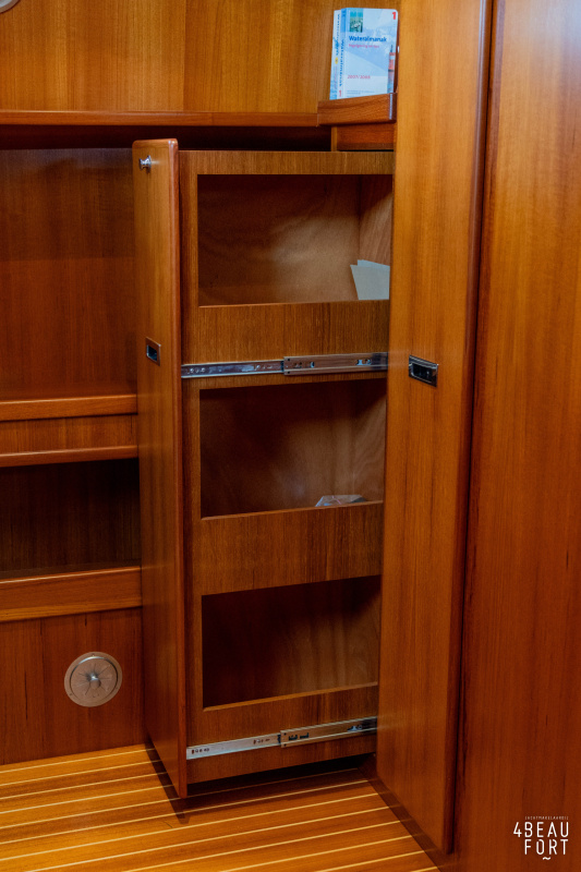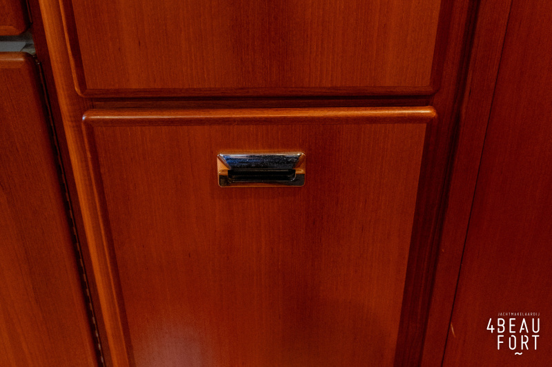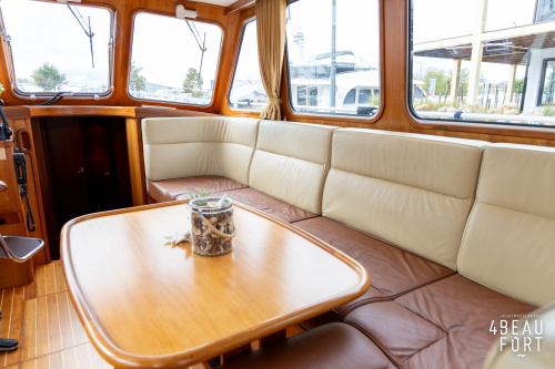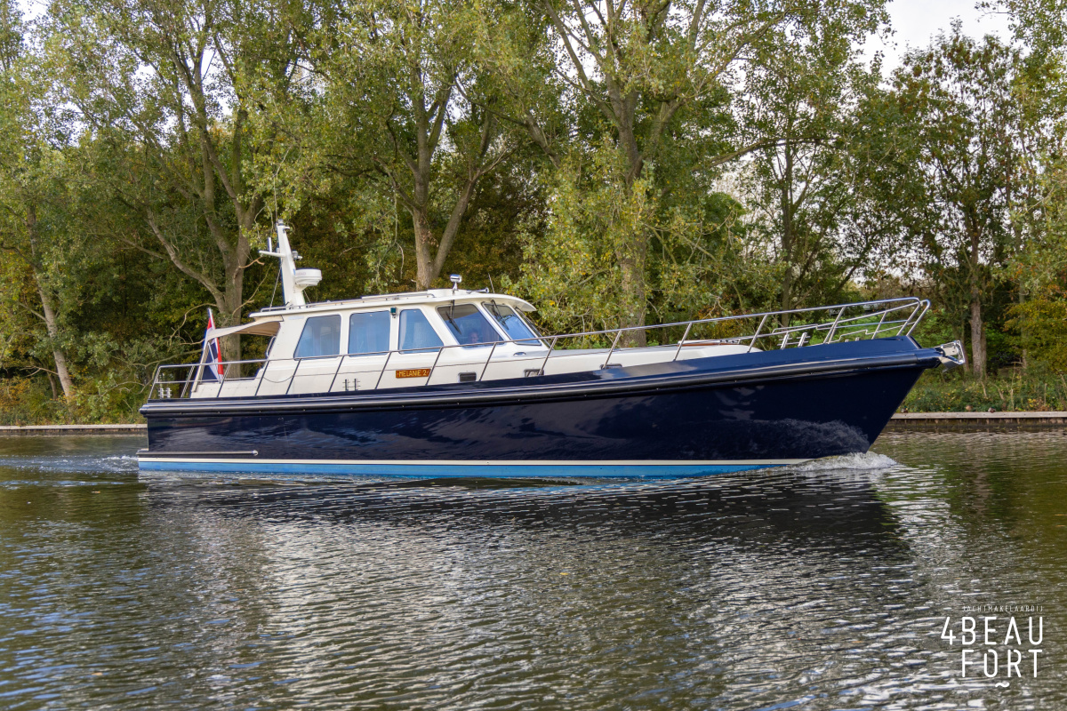 In het voorschip is de ruime eigenaarscabine met ruim vrijstaand bed en bergruimte, aparte doucheruimte, aparte toiletruimte met wastafel, bureau-hoek en een grote kombuis met o.a. magnetron, afwasmachine, wasmachine/droger combinatie en apothekerskasten. Naast de kombuis is de ingang naar de 2e hut die onder de salonvloer is gerealiseerd. De ruime salon met stuurinrichting, extra groot dakluik, veel kastruimte, en een zeer ruime zithoek. Door de openslaande deuren staat de salon direct in verbinding met de open kuip met buitenstuurstand en zitbanken. In de open kuip is tevens het luik voor de zeer ruime berging, waar o.a. de generator is geplaatst. Via de deur in de spiegel stap je via een eenvoudige afstap direct op het ruime zwemplateau.