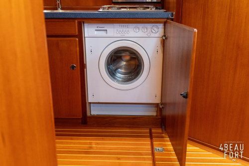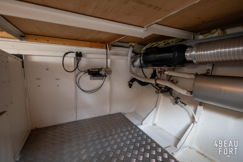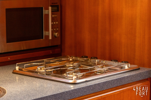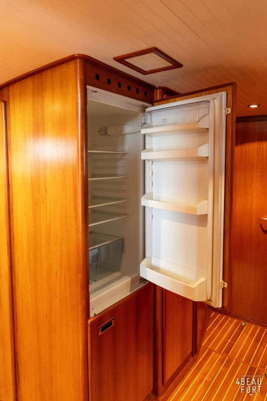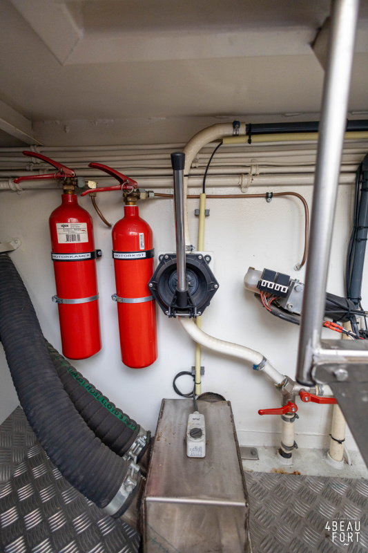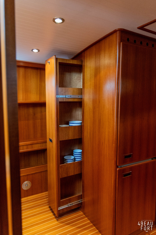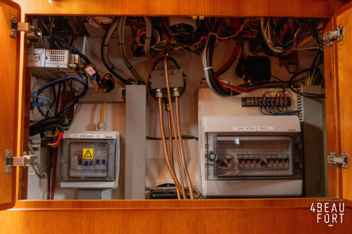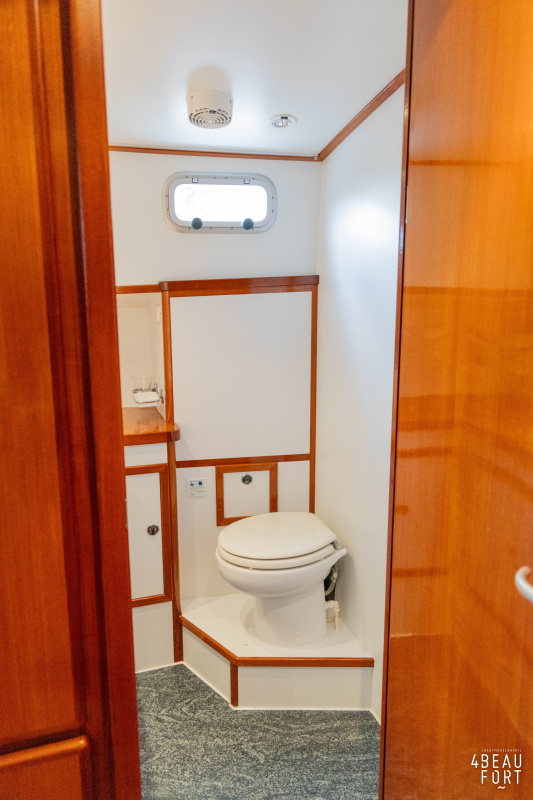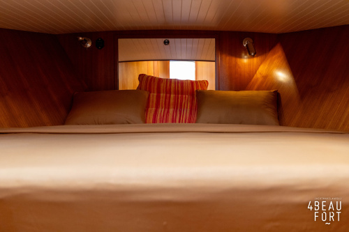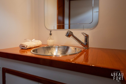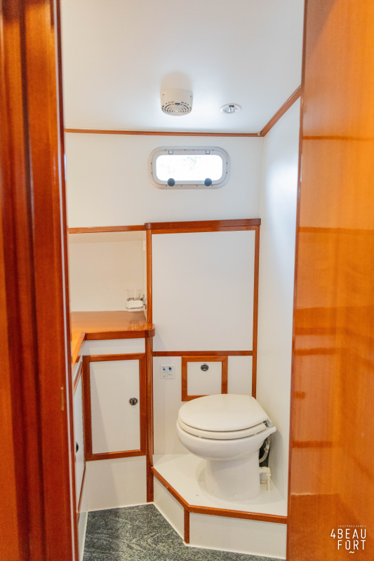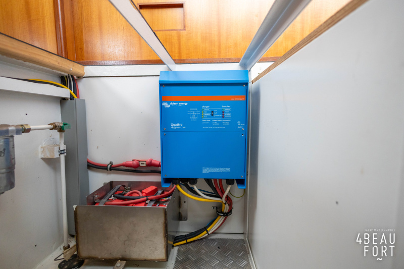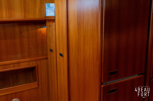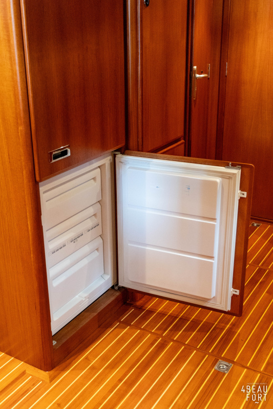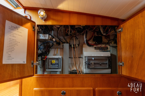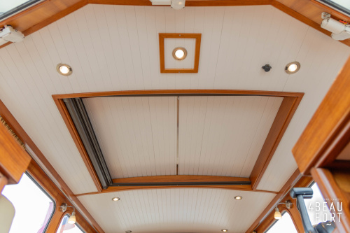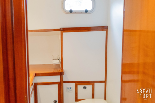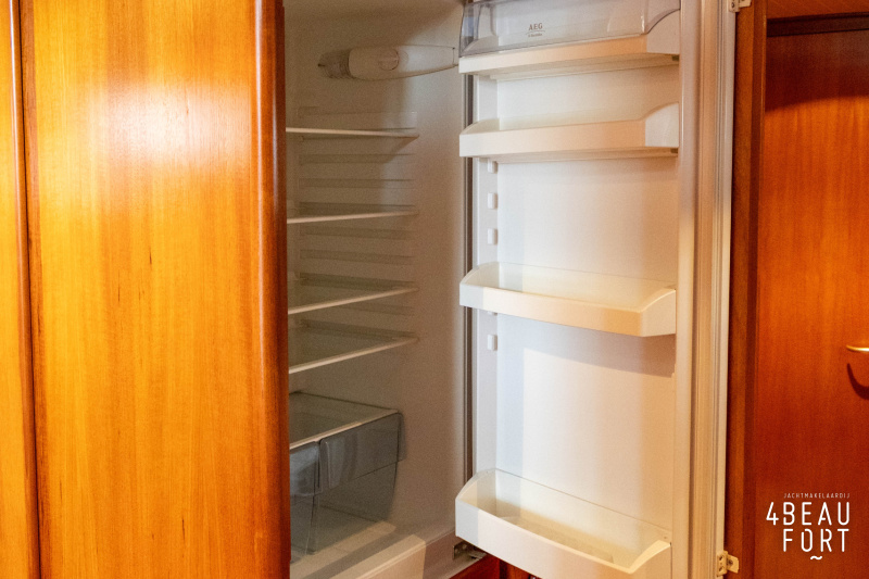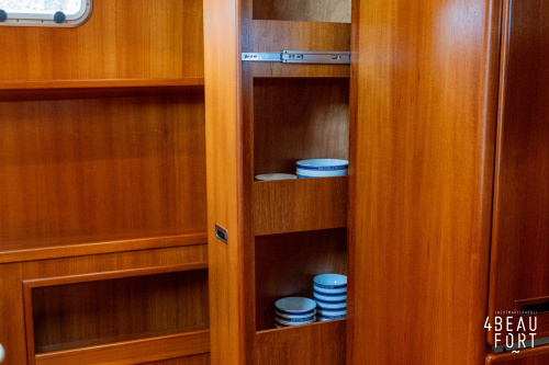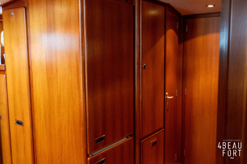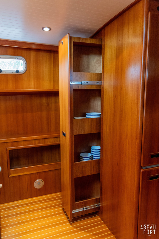 In het voorschip is de ruime eigenaarscabine met ruim vrijstaand bed en bergruimte, aparte doucheruimte, aparte toiletruimte met wastafel, bureau-hoek en een grote kombuis met o.a. magnetron, afwasmachine, wasmachine/droger combinatie en apothekerskasten. Naast de kombuis is de ingang naar de 2e hut die onder de salonvloer is gerealiseerd. De ruime salon met stuurinrichting, extra groot dakluik, veel kastruimte, en een zeer ruime zithoek. Door de openslaande deuren staat de salon direct in verbinding met de open kuip met buitenstuurstand en zitbanken. In de open kuip is tevens het luik voor de zeer ruime berging, waar o.a. de generator is geplaatst. Via de deur in de spiegel stap je via een eenvoudige afstap direct op het ruime zwemplateau.
