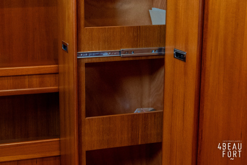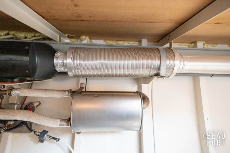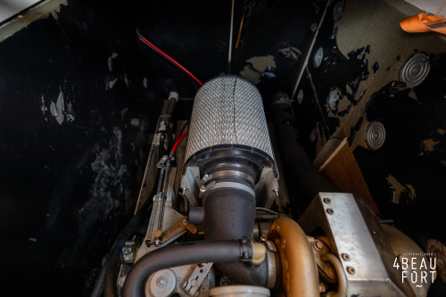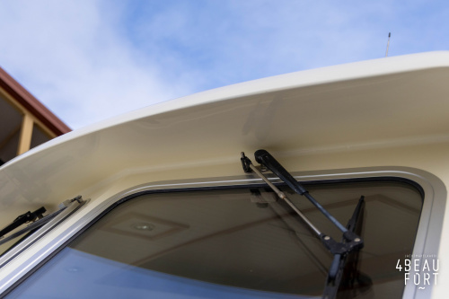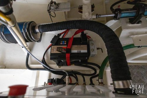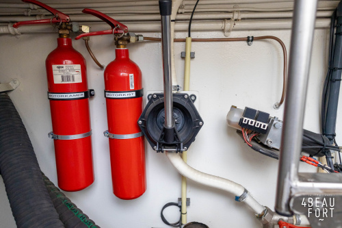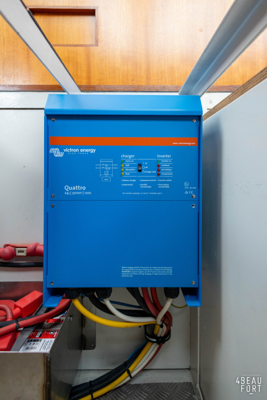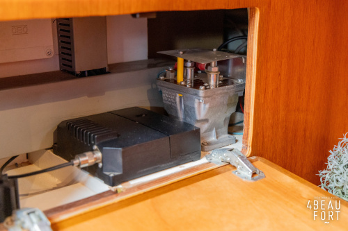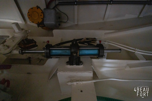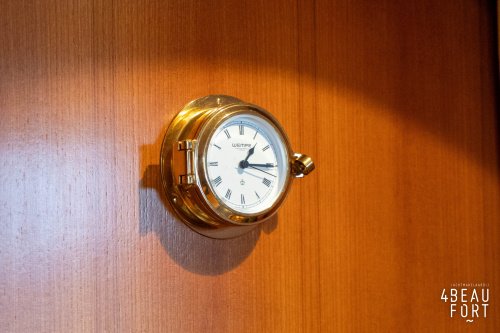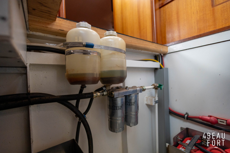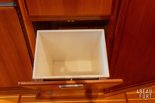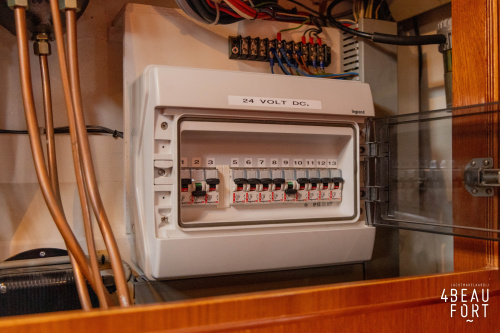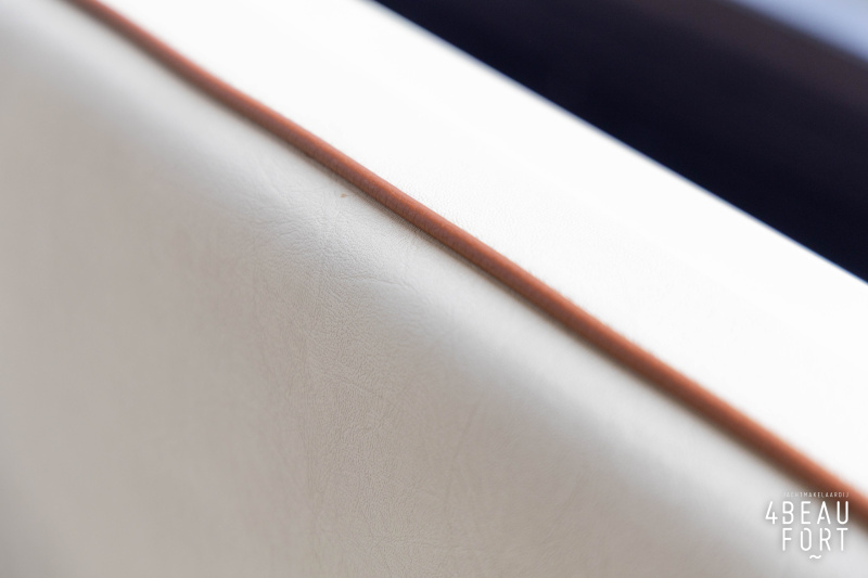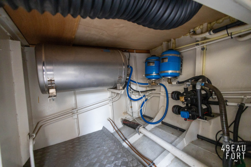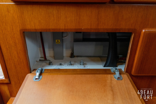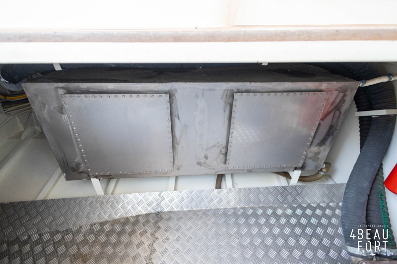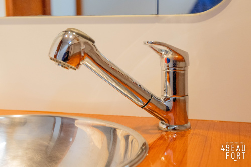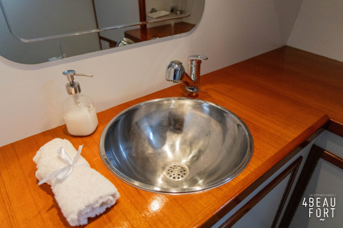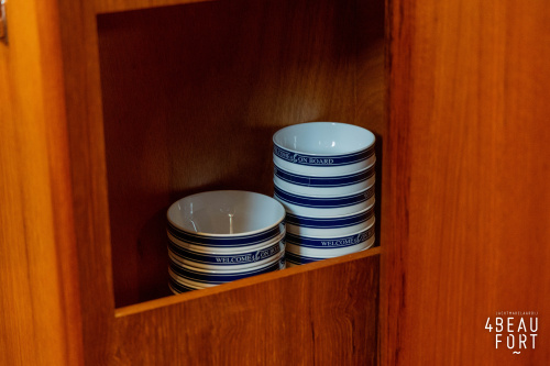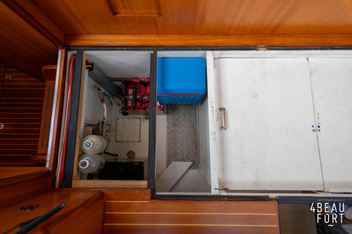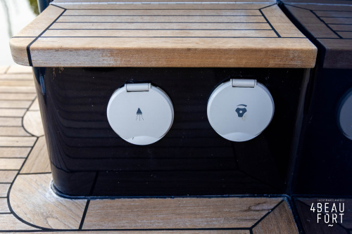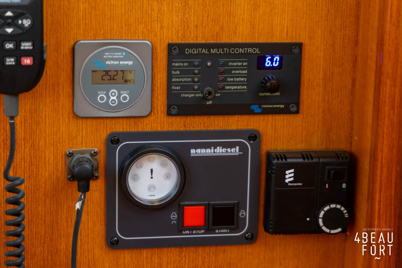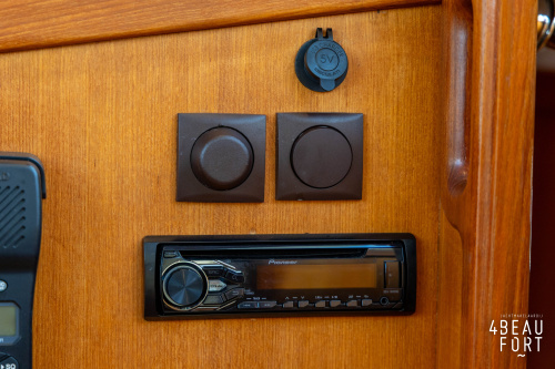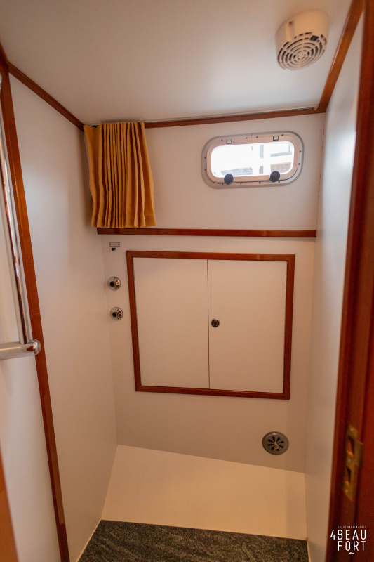 In het voorschip is de ruime eigenaarscabine met ruim vrijstaand bed en bergruimte, aparte doucheruimte, aparte toiletruimte met wastafel, bureau-hoek en een grote kombuis met o.a. magnetron, afwasmachine, wasmachine/droger combinatie en apothekerskasten. Naast de kombuis is de ingang naar de 2e hut die onder de salonvloer is gerealiseerd. De ruime salon met stuurinrichting, extra groot dakluik, veel kastruimte, en een zeer ruime zithoek. Door de openslaande deuren staat de salon direct in verbinding met de open kuip met buitenstuurstand en zitbanken. In de open kuip is tevens het luik voor de zeer ruime berging, waar o.a. de generator is geplaatst. Via de deur in de spiegel stap je via een eenvoudige afstap direct op het ruime zwemplateau.